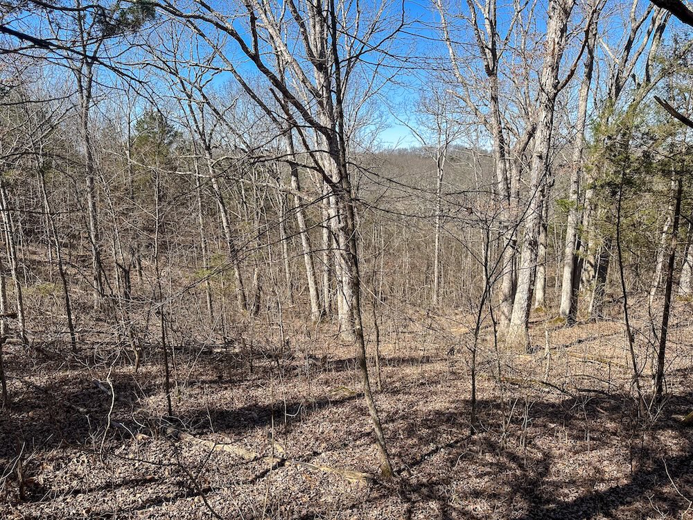 The property includes approximately 160 feet of elevation change, creating a landscape with ridges, slopes, and natural terrain variation. This topography contributes to a range of viewpoints across the property and provides areas that may accommodate potential building sites. Several portions of the land offer sites where a home or cabin could be built while preserving the wooded surroundings.