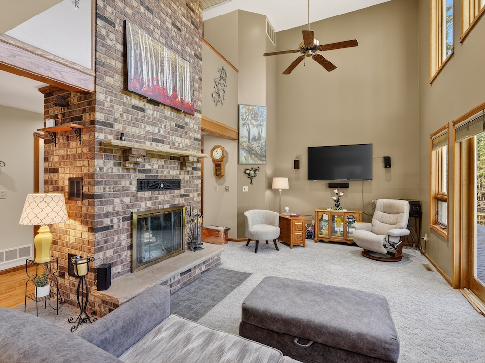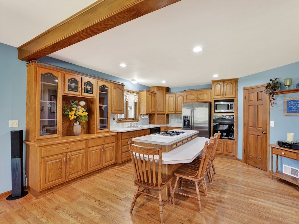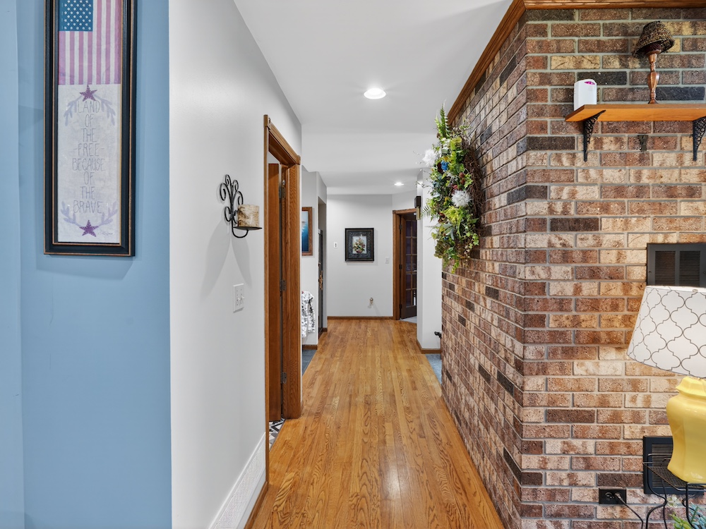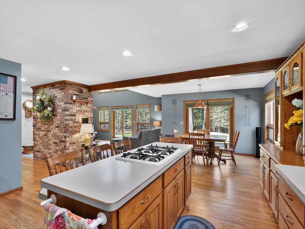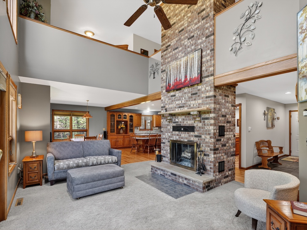 The 2,300± square foot custom-built home offers character and quality craftsmanship throughout. The open concept kitchen, dining, and living area creates an inviting layout centered around a walk-around real wood fireplace that adds warmth and a natural focal point. Custom oak trim, solid wood flooring, and quality cabinetry provide a timeless look and feel. The main-floor primary suite offers convenience and privacy, along with main-floor laundry and an additional half bath for guests.