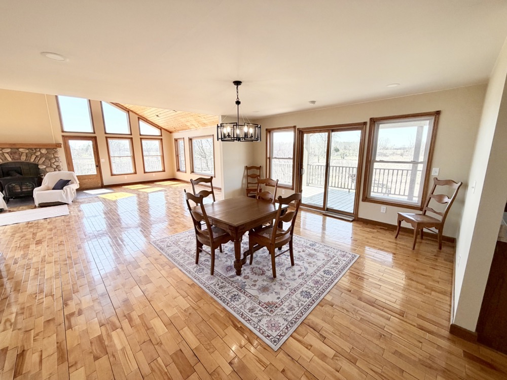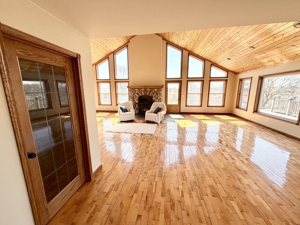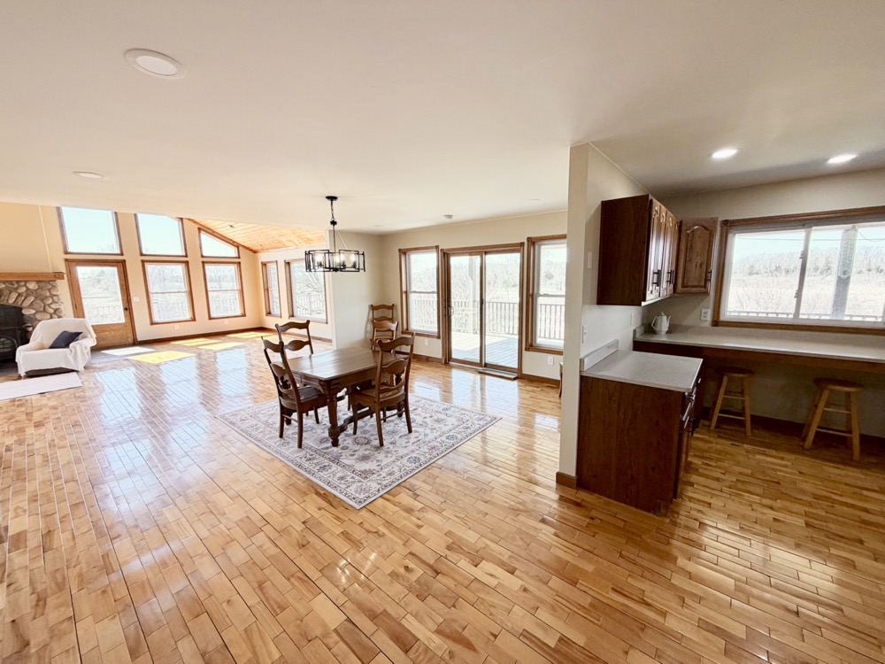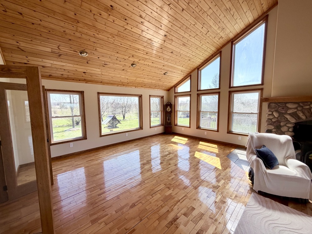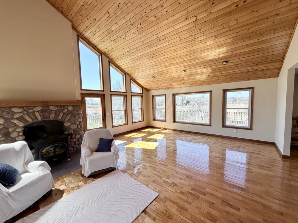 Positioned within this setting is a well-built 3,151+/- square foot home constructed in 2005. Designed with an open-concept layout, the home features cathedral and vaulted ceilings, maple flooring, and large windows that provide natural light and stunning views across the property. The kitchen includes Corian countertops, a pantry, and an eating area, making it functional for both daily use and hosting.
