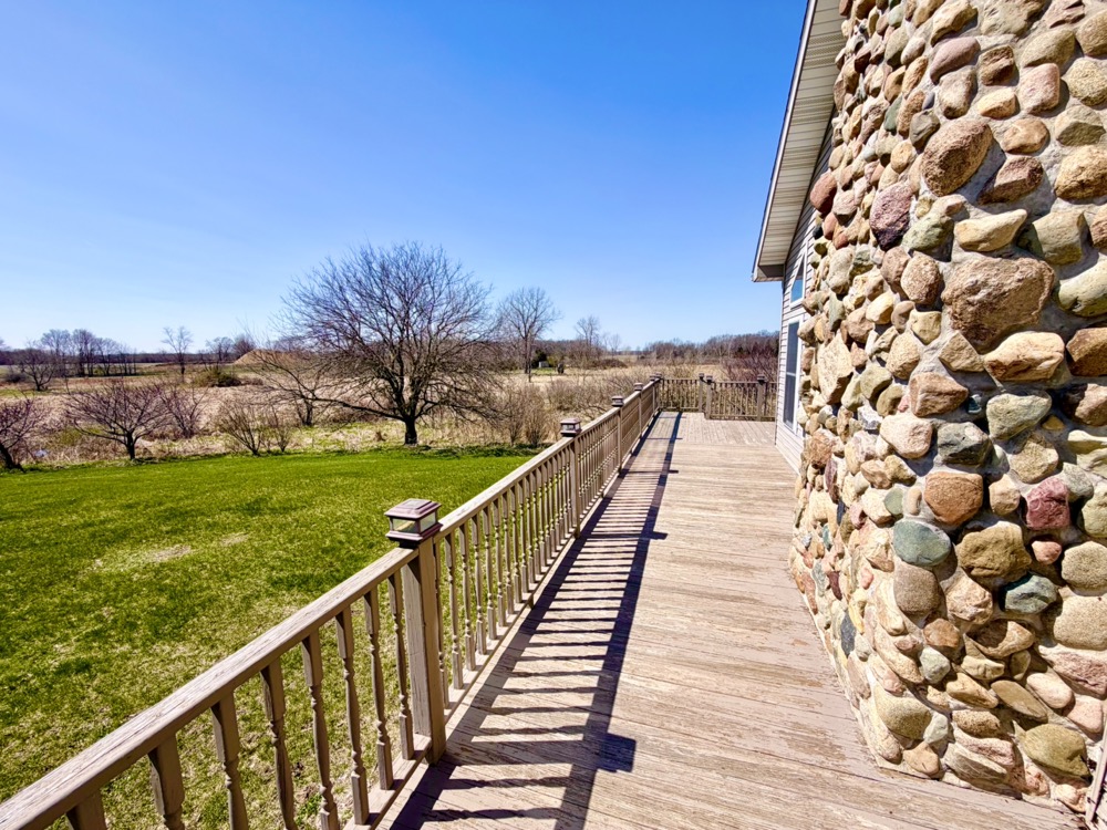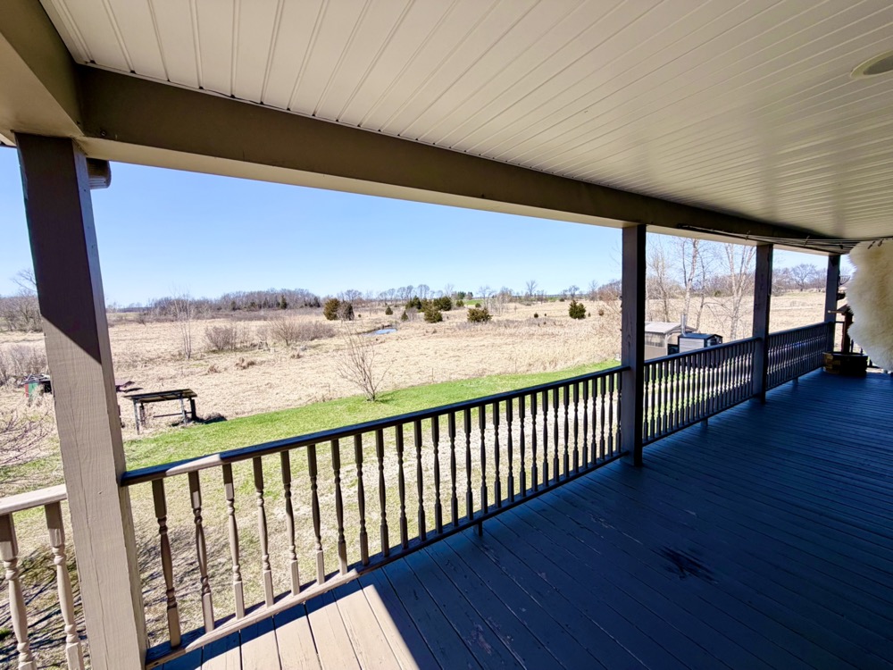 Outdoor living features include a covered porch, deck, and balcony, all positioned to take advantage of the property’s private setting and natural views. The property sits off the road with convenient paved access via US-12, offering both seclusion and accessibility between Coldwater and Bronson.