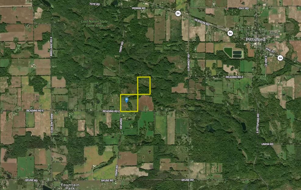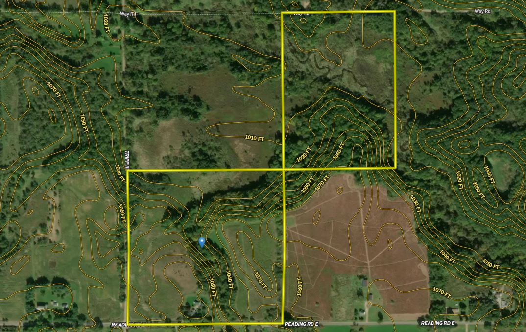 This property has it all, rolling mature timber, scenic fields, beautiful winding creeks and approximately 1300 ft of the East Branch of the Saint Joseph River winds through this piece of land. This is just an incredible piece of ground. Lots of deer, wild turkey, small game, waterfowl and even some beaver are on this piece. There is also a charming little farmhouse with a newer well and septic, sits on a high knoll overlooking the south end of the property. A small barn and fruit trees typical of an older farmstead occupy the yard area. The open fields on this piece are very rolling and pleasing to look at, deer trails intersect in every direction in both fields. There is a sizable gorge that cuts up throughout the center of the property behind the farmhouse and to the valley in the north. It is very scenic and unique and provides some great topography that funnel wildlife somewhat predictably through the property. The timber on this piece is mature and consists mostly of Hardwoods but there are cedars around the riverbottom which adds to the scenic beauty and diversity here. There is a very nice bluff on the east side of the property that drops down to the Saint Joseph River. One of the nice things about this property is the amount of road frontage it has, approximately 900ft on Way Rd, 1300ft on Tripp Rd and 1300ft on Reading Rd. This provides a lot of opportunity for access into the property and possible splits. Don’t miss out on this great property schedule showing today, this is definitely a piece of property you need to see