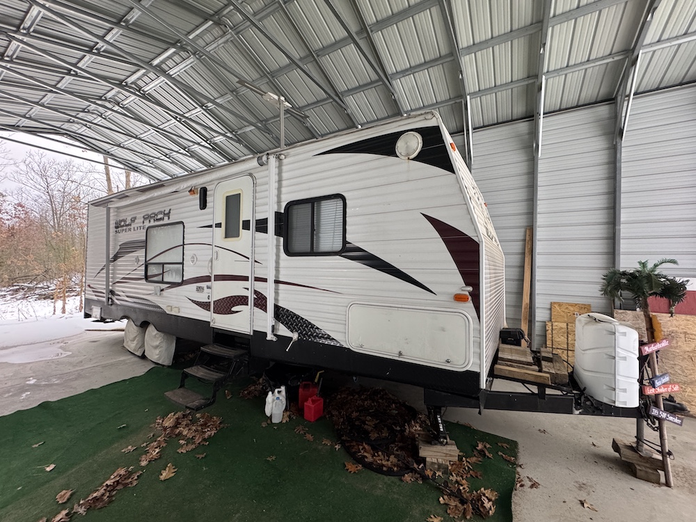 The current owners utilize a Toy Hauler camper stored inside the barn for living accommodations. They bring in generator power and water which provides all the comforts of home. There is an artisan well, providing confidence that water will not be an issue in the future. The 2011 Forest River Toy Hauler camper is in excellent condition and may be available for purchase with the property.