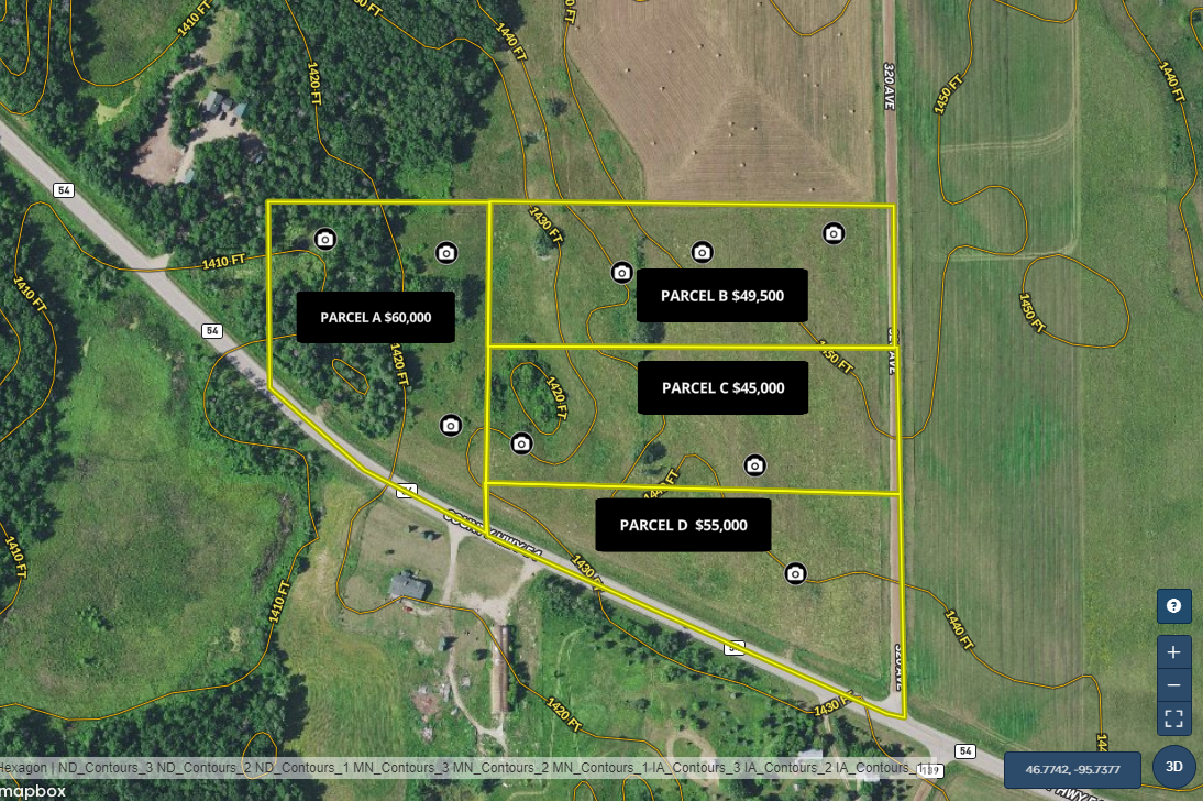 Come take a look at these four excellent building lots just outside of Detroit Lakes and Frazee. Choose between parcels A, B, C, and D. All lots are 6 +/- acres and have their own unique qualities. Parcel A is heavily wooded and has frontage on 54. Parcel B has open ground, trees, a cool valley, and township road access. Parcel C is open ground with a few trees and a valley in the back. Parcel D is all open ground, has over 950 feet of frontage on 54, and also borders the township road. Move fast before the parcel you want is gone. (Parcel C pictured)