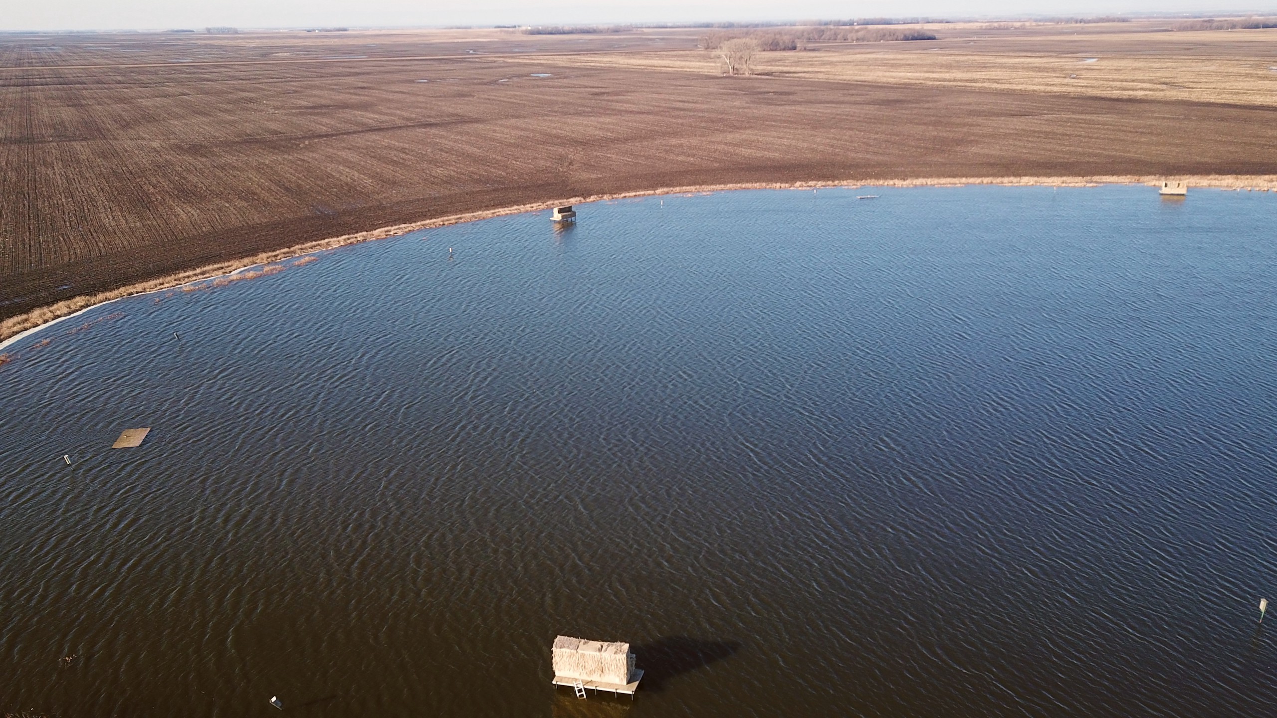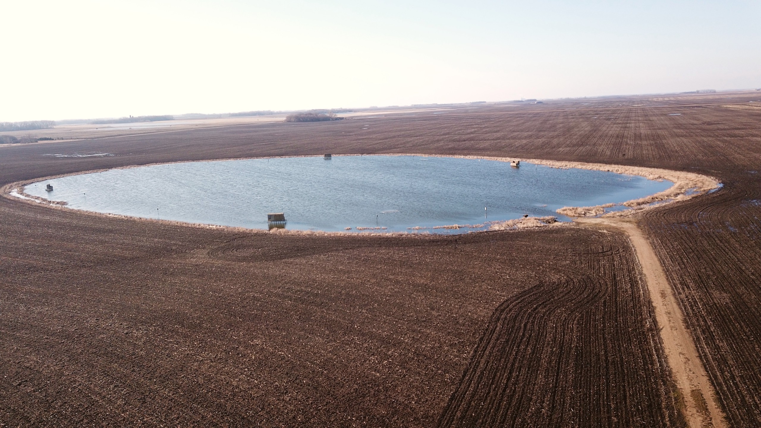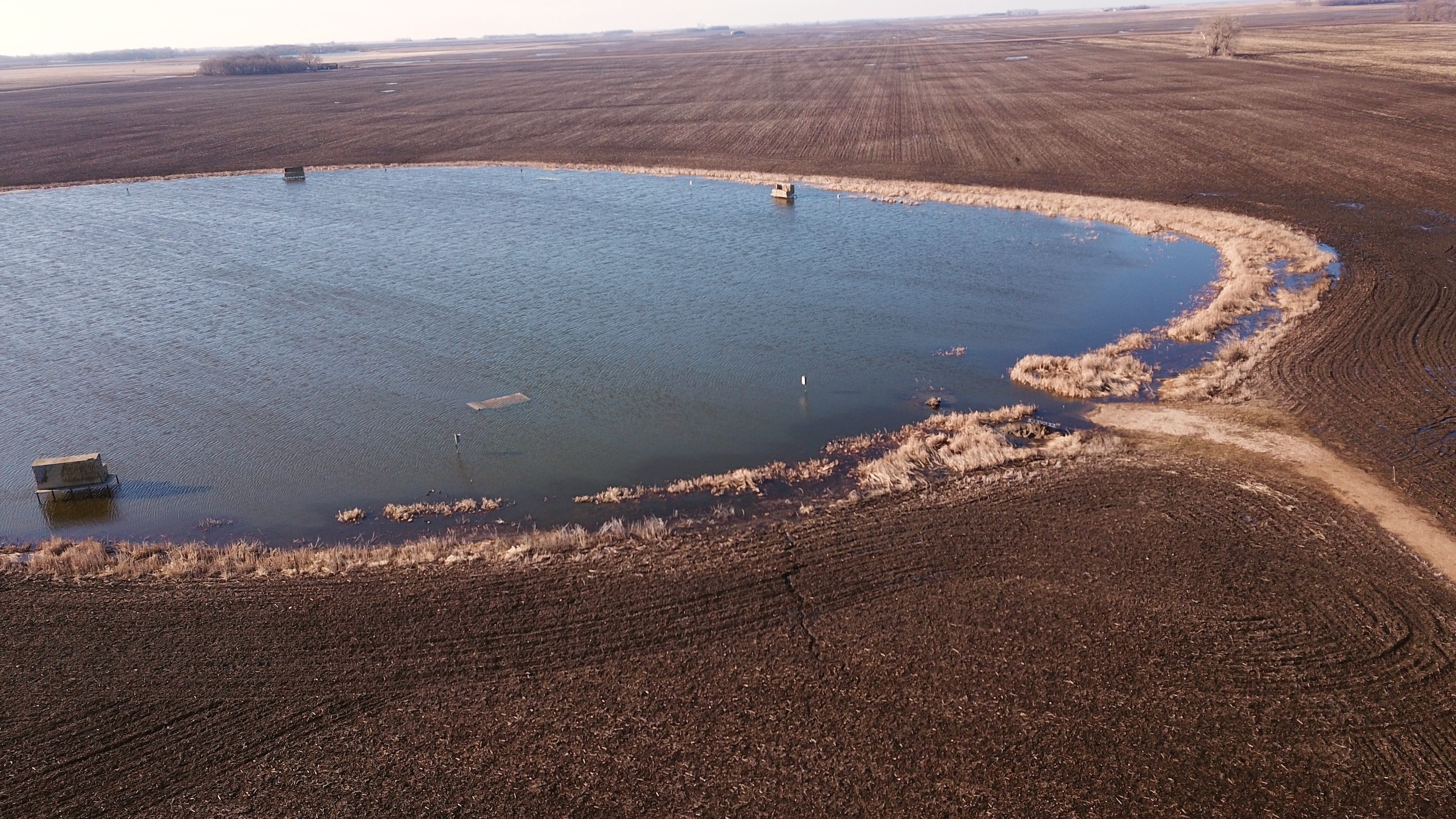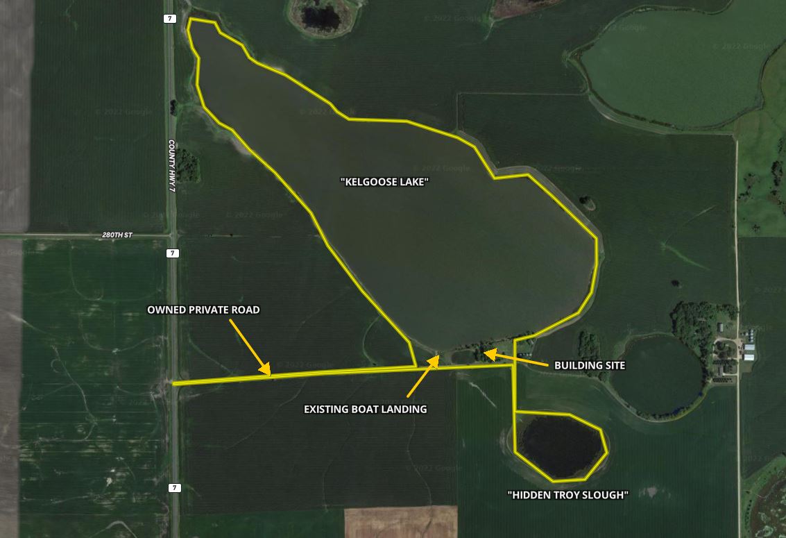 The property is currently owned and utilized by a professional waterfowl outfitter which says something on its own. Not only is there the main lake which has been dubbed “Kelgoose Lake” but there is another satellite waterfowl slough dubbed “Hidden Troy Slough” as well. Both of these come with 9 established blinds (the lake has 5 and the slough has 4) that have been strategically positioned to accommodate any wind direction. The lake has an existing solid boat landing even in wet conditions and will accommodate even larger boats and there is another landing area at the slough as well. There is also an approximately 5-acre building site that has power running up to it and all of this is accessed through the privately owned driveway off of the county highway.