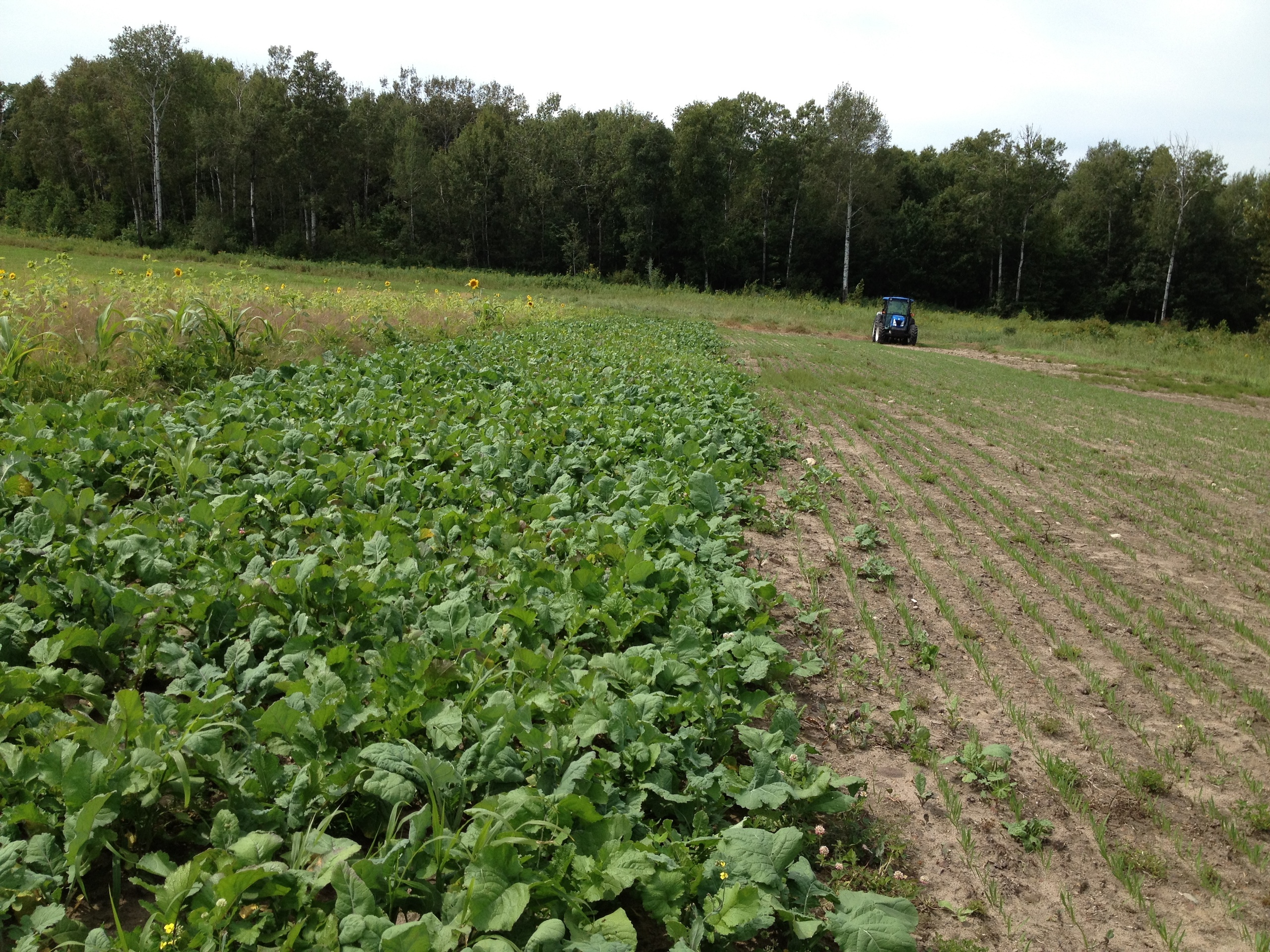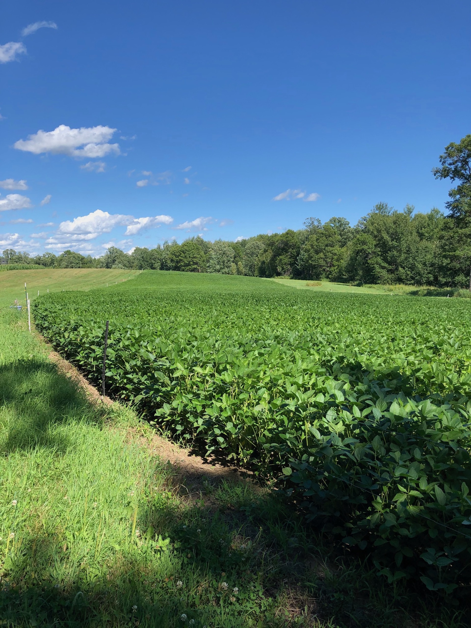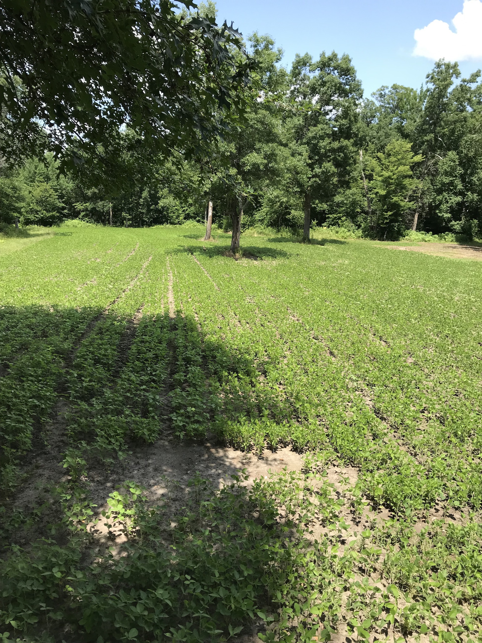- Three fields with crops (corn, beans, and oats)