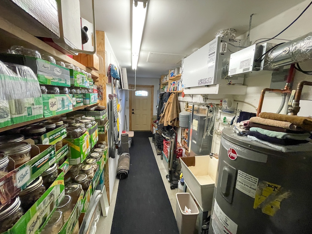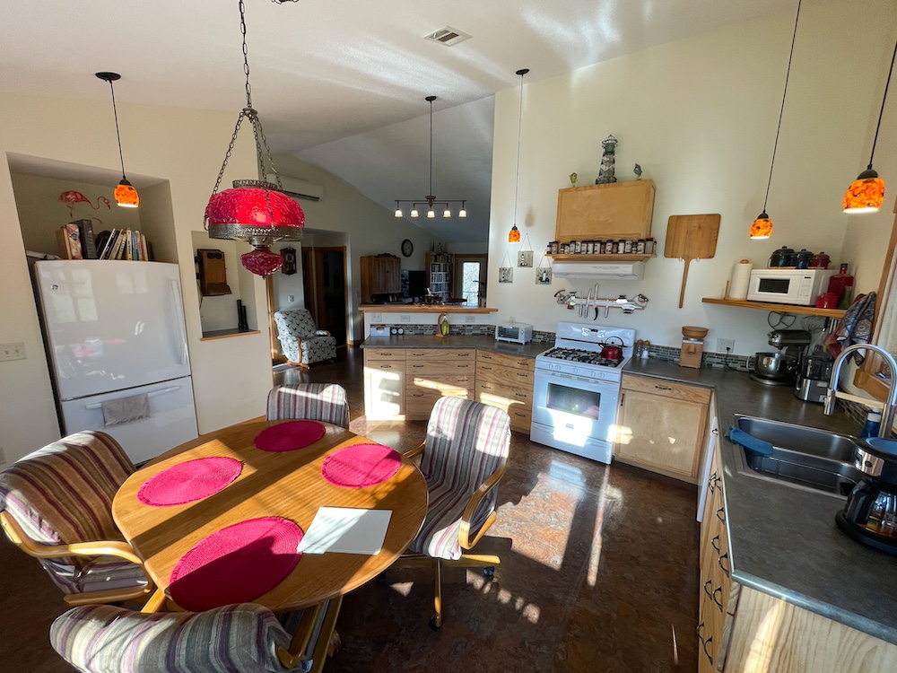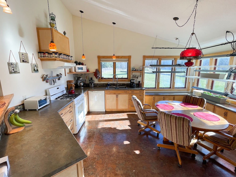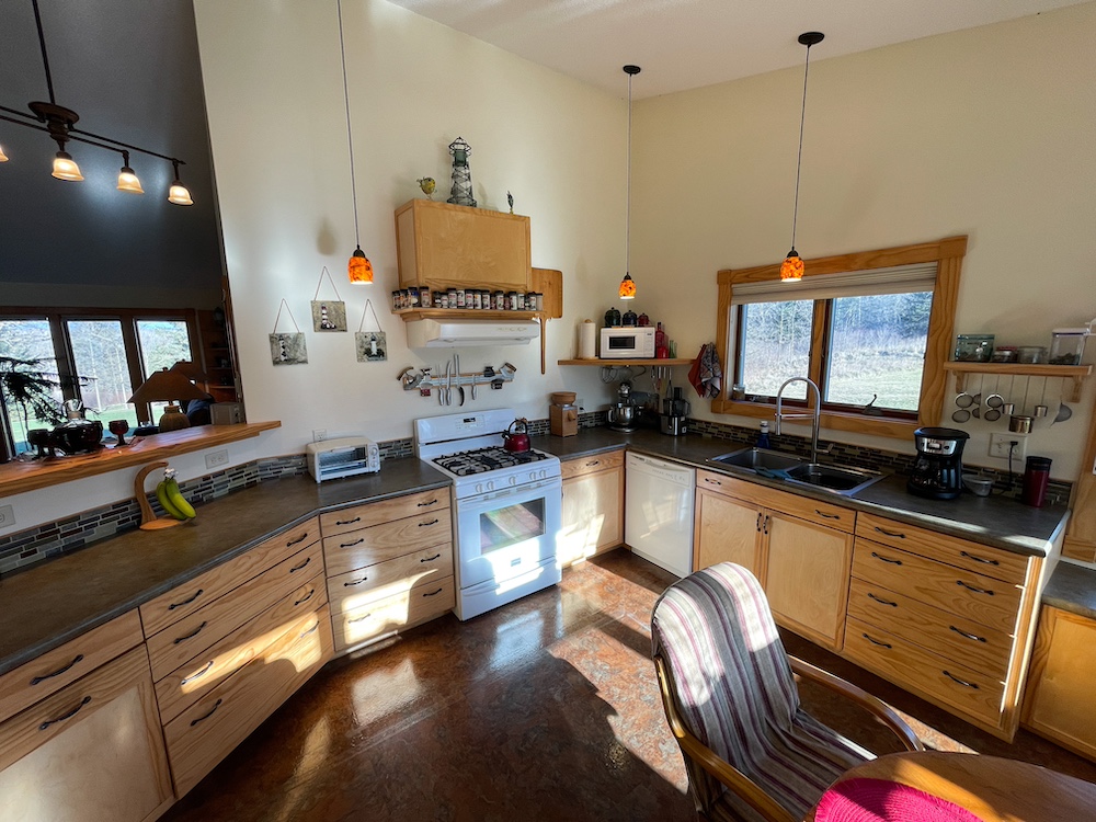 The primary residence was constructed in 2014 with design elements focused on efficient and functional single-level living. The home provides three bedrooms, two bathrooms, and approximately 1,564 square feet on a slab-on-grade foundation with in-floor heating throughout. Smartside composite siding is used on the exterior, and Anderson 400 series windows are installed. A generator transfer switch is integrated into the electrical system for optional backup power. The 500-gallon propane tank, gas fireplace, and fiber optic internet service support year-round living. The interior features modern touches and fixtures, natural light from well-placed windows, and the kitchen has been used for seasonal seed starting and similar activities due to its exposure and available light. Outdoor spaces include a 16 by 32 front deck positioned for evening sunsets and a 10 by 10 rear deck used for morning coffee with a sunrise view.
