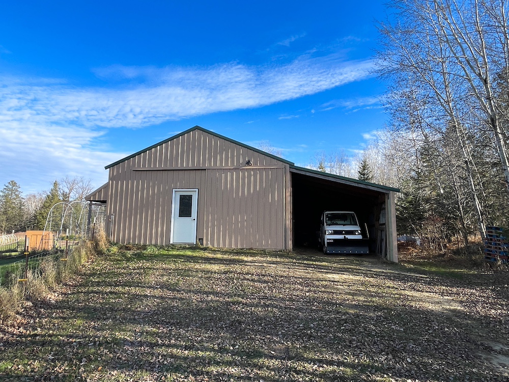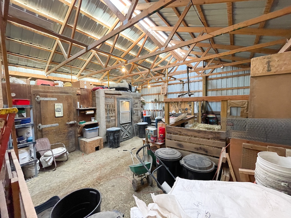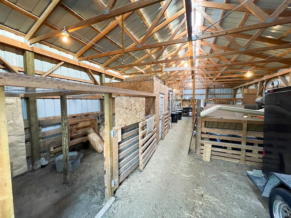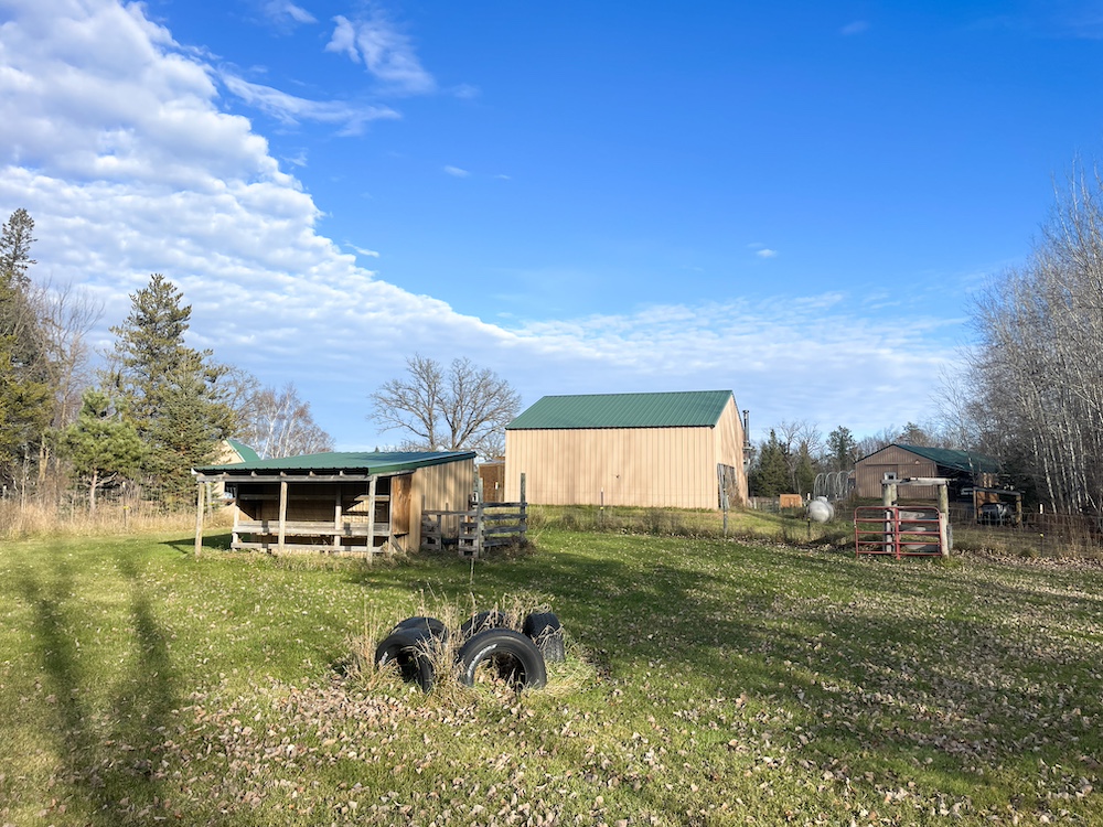 Agricultural and utility buildings are located throughout the main farm area. A 20x40 machine shed provides storage for equipment. A 28x28 heated and insulated shop with a powered overhead door supports year-round work and storage. The 36 by 48 pole barn contains multiple functional spaces, including a chicken coop, milking room, hay storage, and stalls suitable for livestock. Attached to this barn is a 16 by 32 aviary and two fenced pastures. In addition to these, there are three larger pastures on the property, each containing a loafing shed for shelter. All structures were built within the past eleven years and are in a condition that supports ongoing farm-related use.