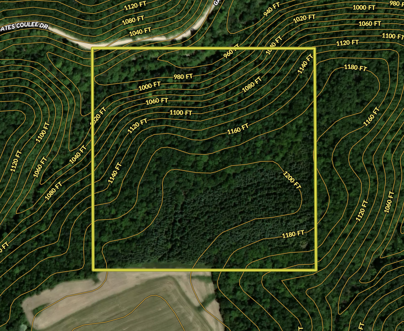 Here is a hard-to-find all-timbered hunting property in Houston County. The property is located just Northwest of Money Creek. There is a recorded deeded easement access road off Gates Coulee Drive. The access is constructed well and leads to a trail that will take you to the top of the bluff. The road is solid and will allow access for ATV or UTV use. Once you are up top, you will find about 10 acres of mature pines in the Southeast section of the property. In the far Southeast corner, you will also find some walnut trees. The pines make for great thermal cover for the local deer herd. There is a ton of deer sign all over the property. The property is in an area well-known for the quality of deer, with many landowners managing for older age class bucks. The property is enrolled in RIM (reinvest in MN), which makes the property not buildable. Here are some notes about some of the things you can and can’t do with the RIM easement per the Houston County SWCD Office; This property could have up to 4 acres for a food plot- It will need to be approved by Houston Co SWCD and the state so they will need to do a site visit to agree with you on the location-based on erosion control. You may harvest the timber when it is ready; you will need to work with the Houston County DNR to have them write a Wood Harvest Plan. You are allowed to trim the understory of the pine trees with no consultation with them. If you want to add a water hole or pond, you can do so with Houston County SWCD approval- There could be some cost-share options for a pond to be built. Adding trails for Timber Stand Improvement can also be approved by the SWCD office. You are allowed to put up deer stands and box blinds. If you want to have your camper there for a weekend or week for deer or turkey hunting, they are ok with that as long as you are not killing the vegetation.