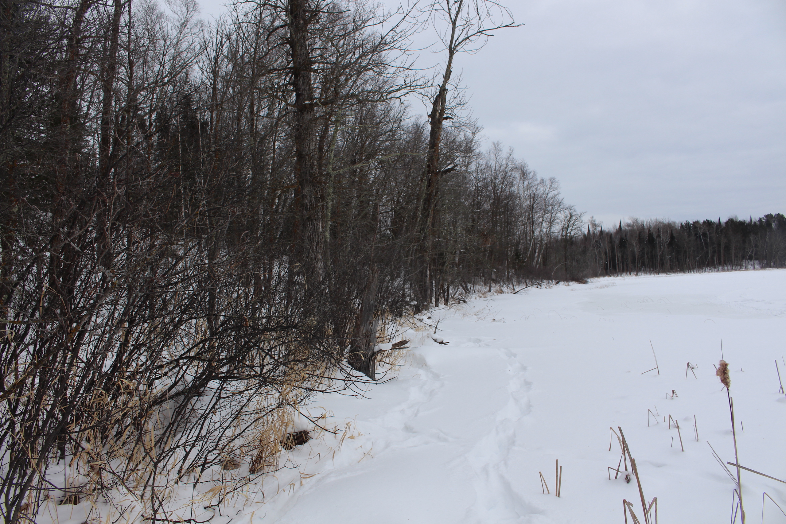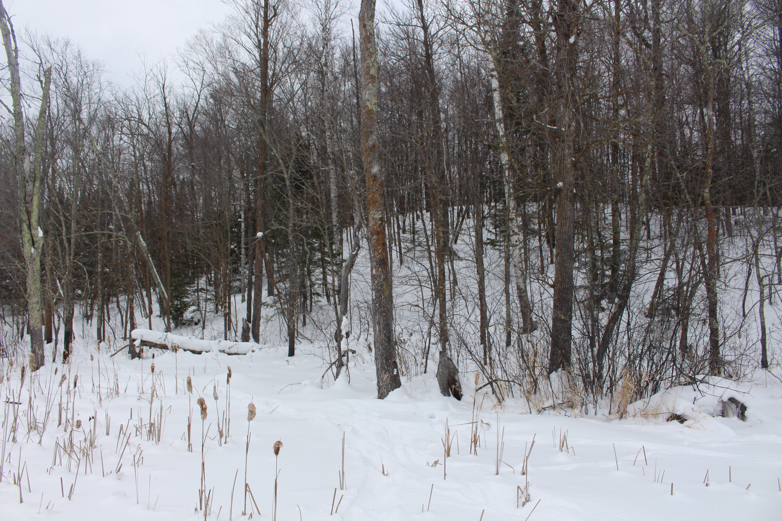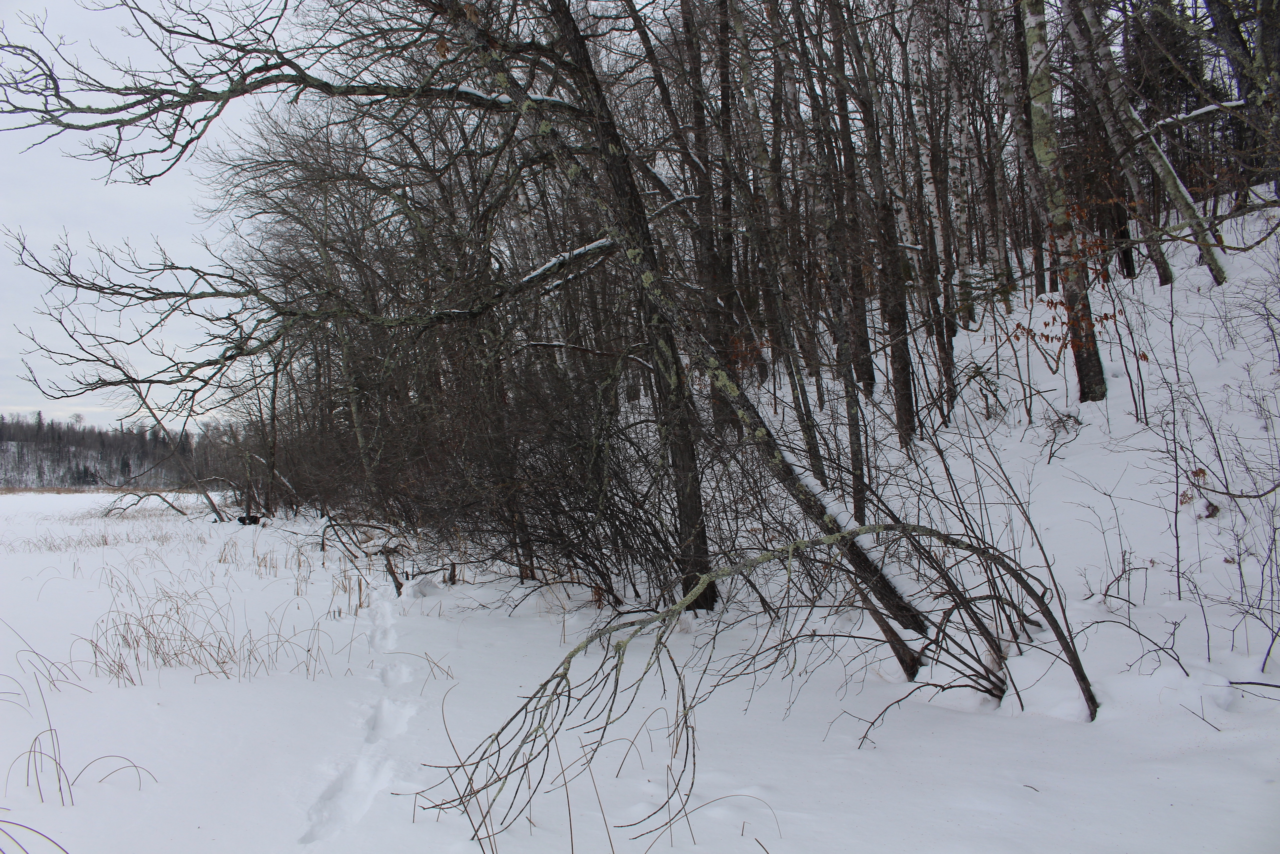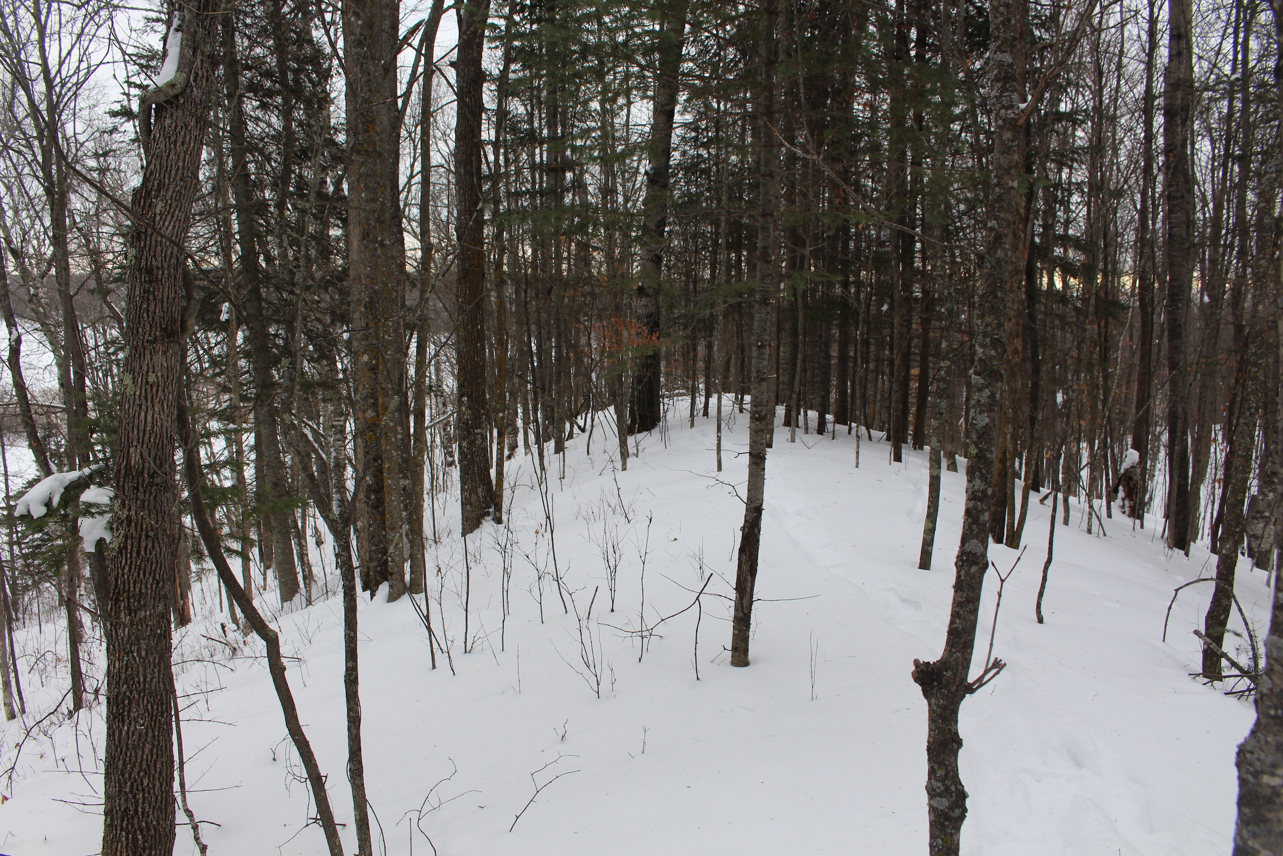 This is one heck of an all-around property! First off it’s a large acreage property as far as lakefront properties go. Itasca County website property details report shows the property as having 2,572 feet of frontage on Nashwauk Lake approximately. The way this property is set up gives ultimate privacy! Also, it’s tucked along the west shoreline with part of the acreage having a small bay in front of it with a point of land coming out that would be a beautiful spot to watch various birds and other wildlife hang out around. The northern half of the land is more looking out at the main lake. There are also only a few cabins scattered around the lake so it has a very Northwoods feel to it! The land is made up of the mostly high ground. It has some very cool topography features given it has longer-running ridges and also some rolling hills. This created excellent areas for deer to bed upon hillsides out of the wind or to catch more direct sun. Considering the snow depth and time of year I was surprised to see the amount of deer sign I did on the property. The property is an excellent deer, bear, and grouse habitat. The lake has lots of great spots to set up for hunting waterfowl. The hills and ridges are made up of a mix of mature aspen, maple a few oaks, and various other northern MN tree types. Access to the property the seller has procured a “permit to cross” from the county as well as an easement to cross a property coming in along the gravel road. The permit to cross starts at the public boat access parking area and then works its way into the property from there. MN DNR Lakefinder shows the lake as having crappie, bluegill, northern pike, largemouth bass, tullibee, and several other species. If this property sounds like it might be that hunting, fishing Northwood’s and lake life paradise give me a call today to set up your private showing!