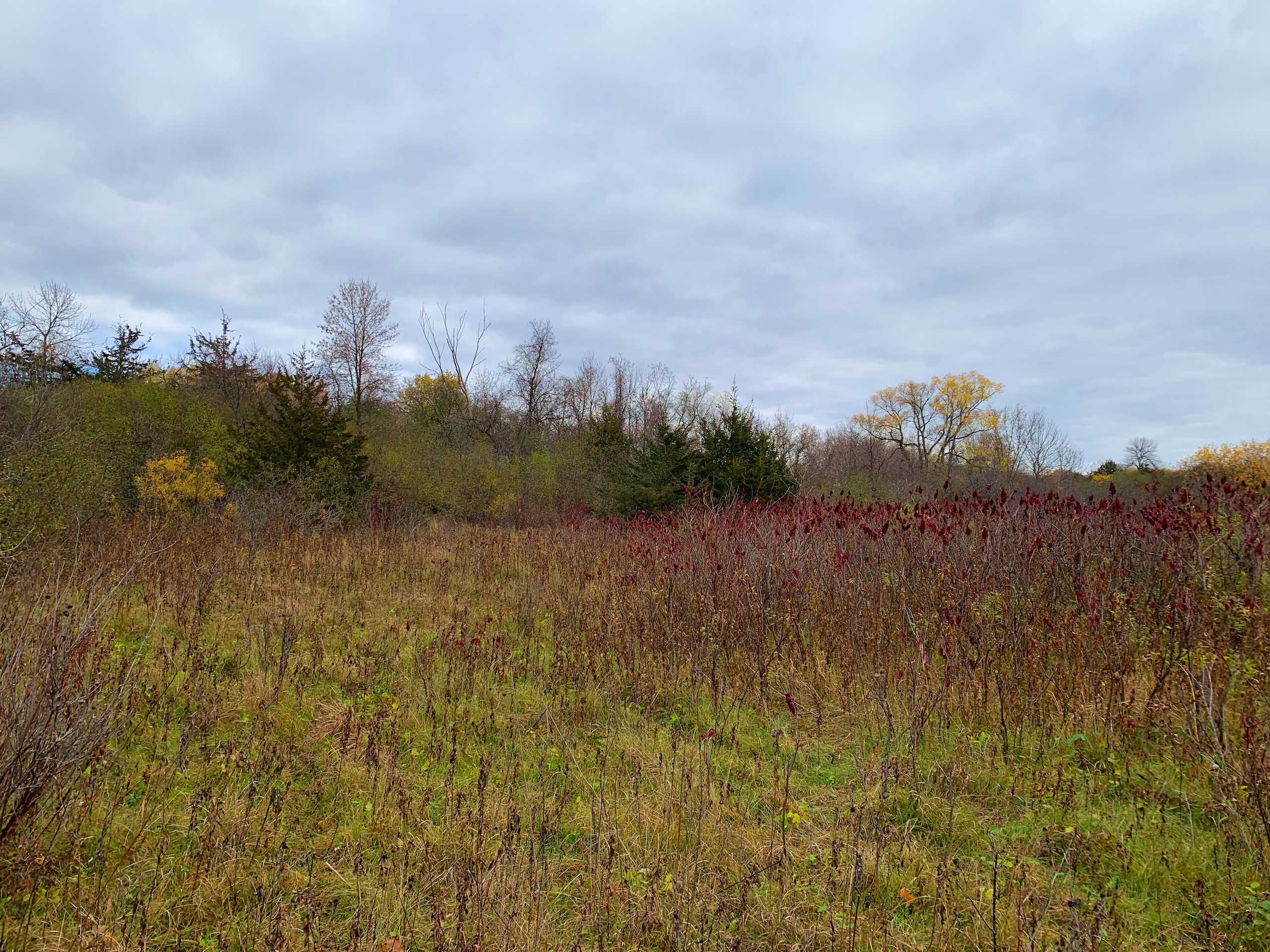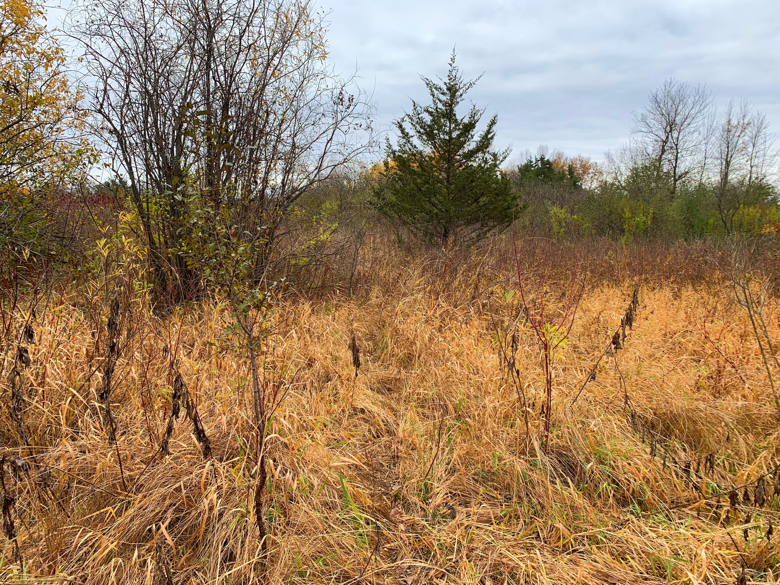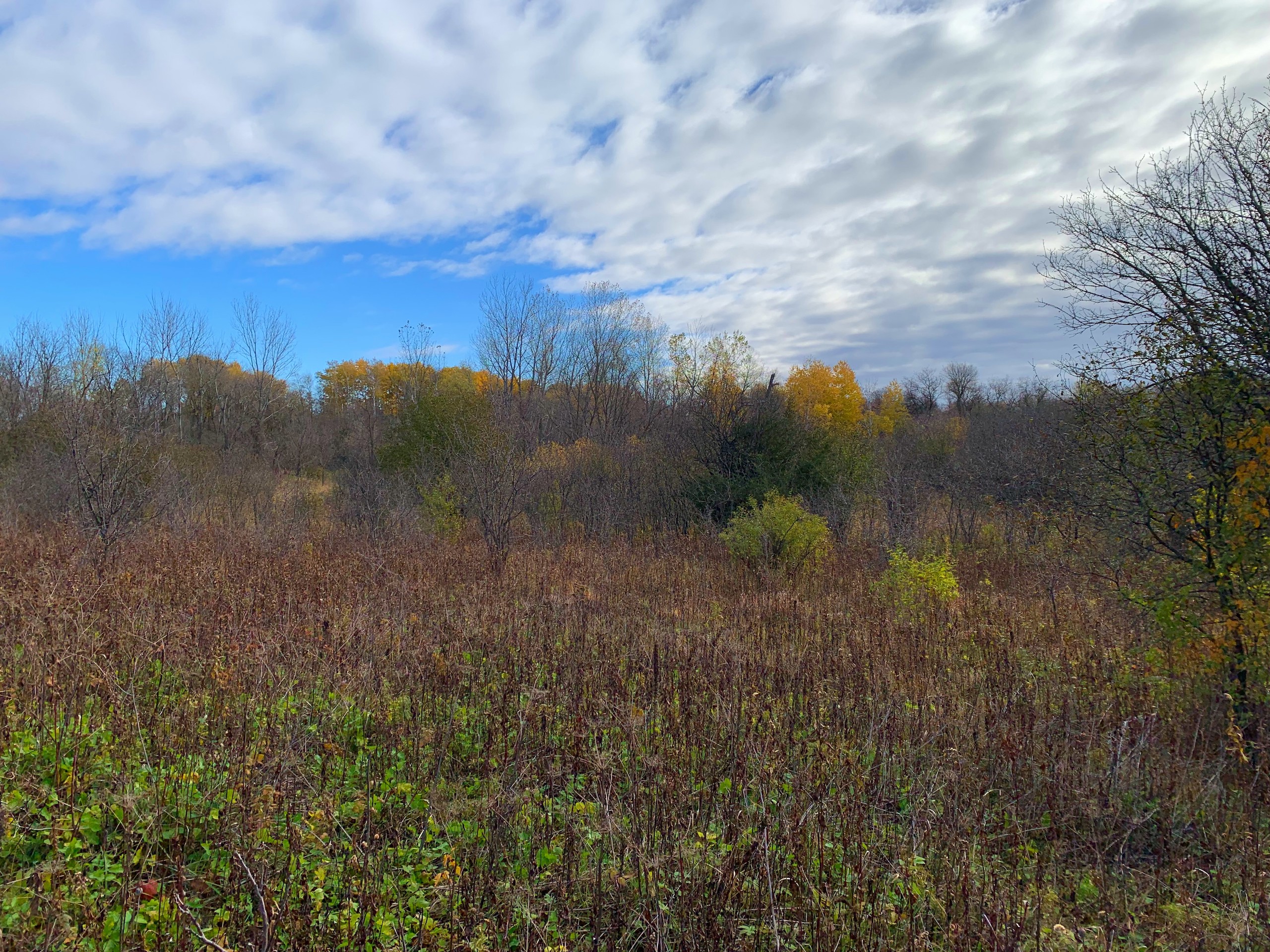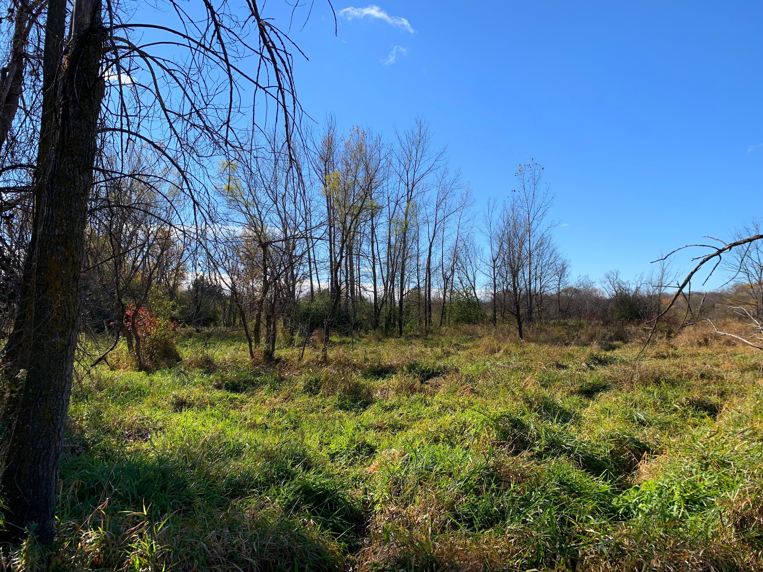 Generally speaking, access to the property is basically right on the NW corner via an existing road approach which by my mapping and the sellers’ comments is just within the boundary of the property. Moving into the property then, the NW part of the property is a mix of wooded areas, cedar trees, sumac, and other brushy species with mixed more open grass areas which would be ideal for food plots. The SW/S portion of the property is a cattail slough which you’ll notice has a little bit of open water in it for waterfowl hunting but also serves as wintering/seclusion cover. Moving to the eastern part of the property, there are flowing creeks which I assume are being spring-fed, the larger block of wooded area that stretches from the N to S property line, and then another more open grass area with dotted trees along the eastern property line.