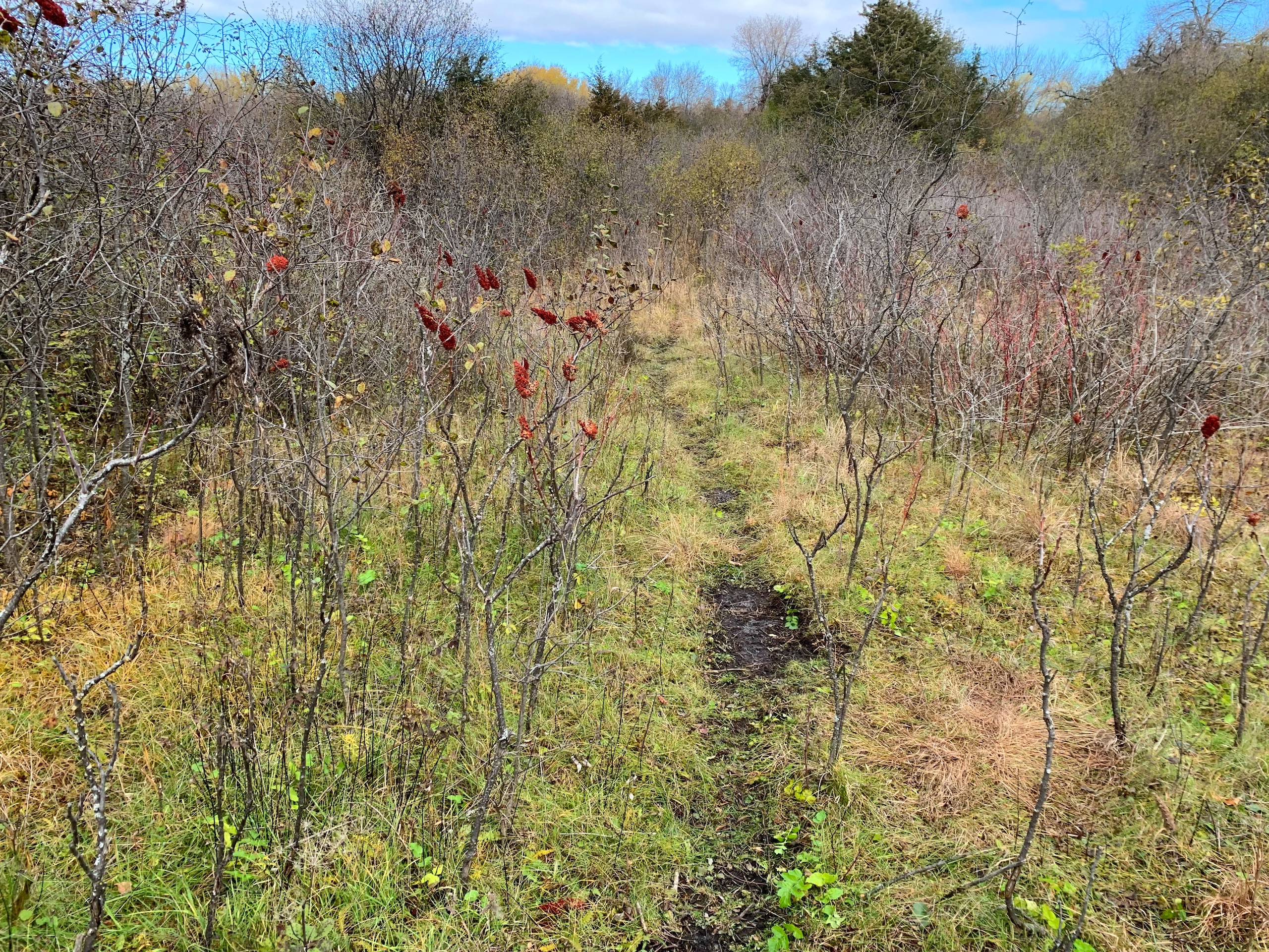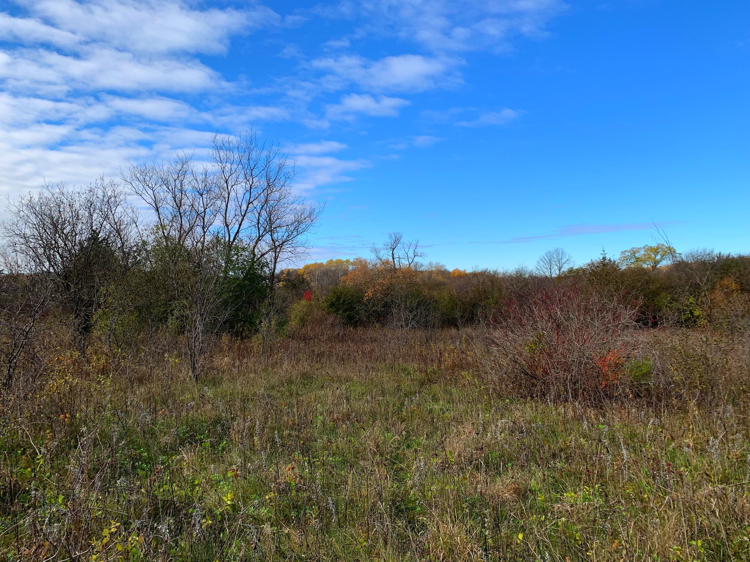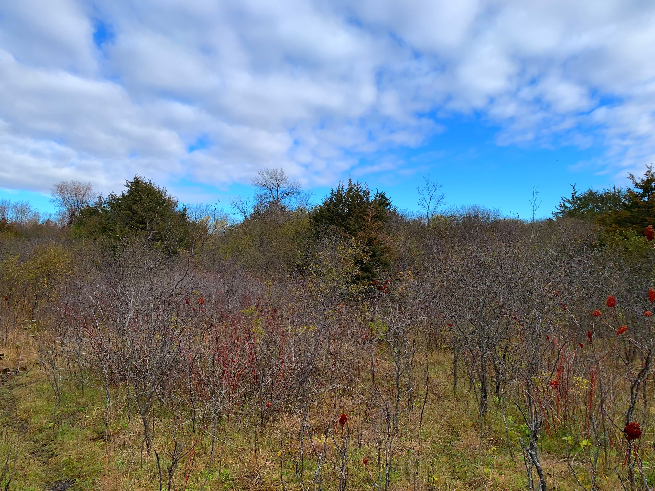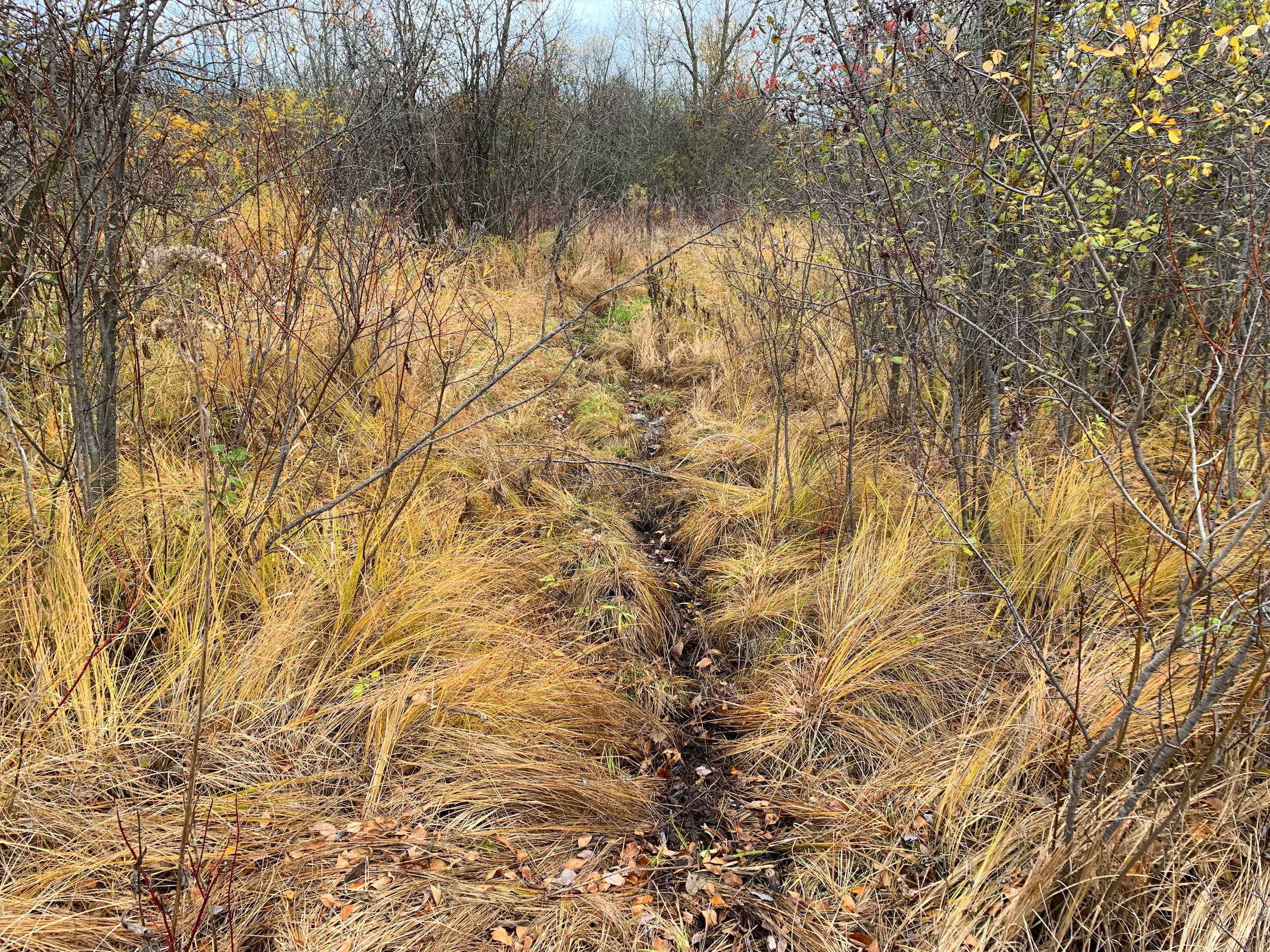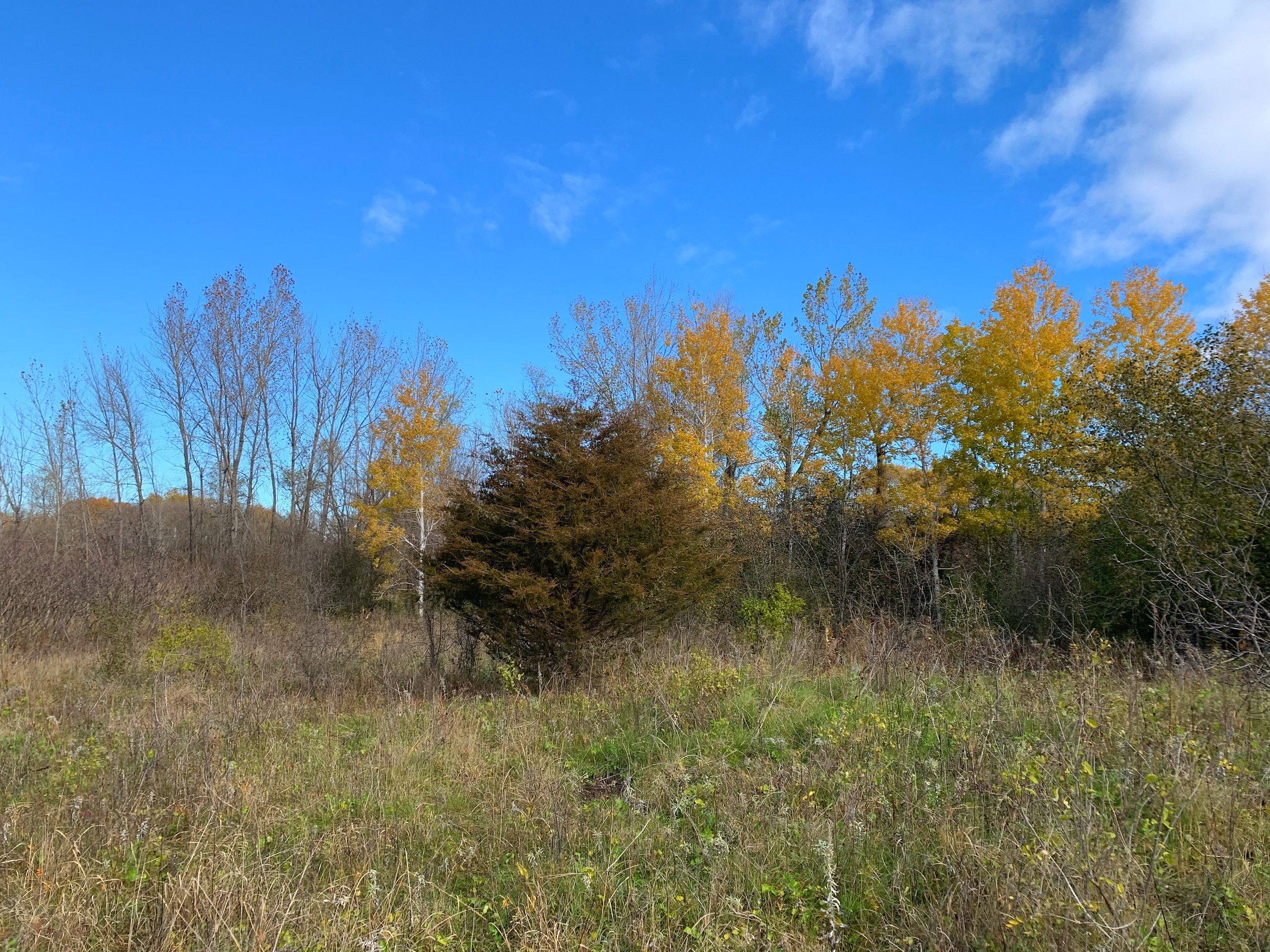 Generally speaking, access to the property is basically right on the NW corner via an existing road approach which by my mapping and the sellers’ comments is just within the boundary of the property. Moving into the property then, the NW part of the property is a mix of wooded areas, cedar trees, sumac, and other brushy species with mixed more open grass areas which would be ideal for food plots. The SW/S portion of the property is a cattail slough which you’ll notice has a little bit of open water in it for waterfowl hunting but also serves as wintering/seclusion cover. Moving to the eastern part of the property, there are flowing creeks which I assume are being spring-fed, the larger block of wooded area that stretches from the N to S property line, and then another more open grass area with dotted trees along the eastern property line.