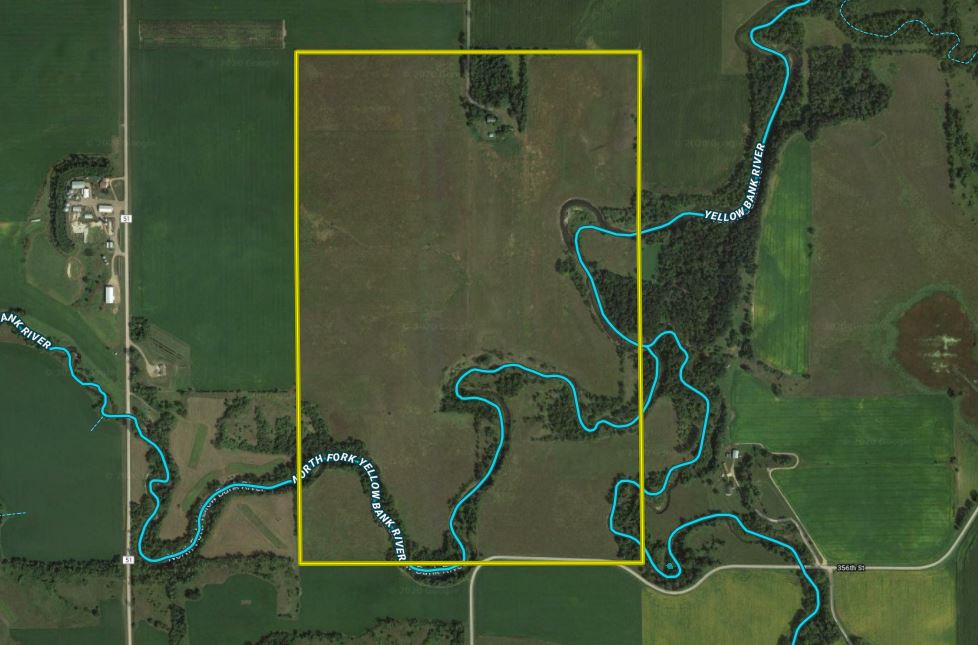 Upon my initial viewing of the aerial photos for this property, I knew it was a unique piece and would be a good property. Then, I physically walked it, and to say it didn’t disappoint is an absolute understatement. Make sure you scroll to the end of the pictures to see some updated aerial drone pics but picture this; you have a property that sits in the middle of two sections, there is a quarter-mile dead-end road to get to it from the north, a low traffic township road along the south side and sandwiched between the two is a habitat complex of rolling restored prairie and grasslands hills with about as nice of a wooded river corridor winding through the middle as one could ask for. Upon cresting the hill to look at the river bottom, the deer were literally scattering like rats. Top this off with hearing and flushing multiple pheasants, ducks/geese flying around, ducks in the river, and a turkey crossing into the property. All in all, it didn’t take long to see that this wasn’t just a good property but a great one with attributes that one dreams about! The real key for the property is not only the restored prairie/grasslands but the north and south Fork Yellow Bank River run through the property and converge on the eastern property line which then continues generally north through the property. I instantly had dreams of not only the deer living on the property but the number of bucks that would be cruising the river corridor in the rut. The prairie/grassland portion of the property is enrolled into multiple CRP contracts which total approx. 102 acres with a 2020/2021 CRP year (payable Oct. 2021) providing just under $15,000 of income. These contracts are in place until 2027 and 2028 (more information on these and maps available). There is also approx. 75.61 acres that were old-growth brome CRP which expired in 2020. This is actually beneficial as the area is now planned to be planted into soybeans for 2021 which will allow for herbicide treatment to knock out the bromegrass leaving the field perfect for attempts to re-enroll into CRP or, one could just leave it as tillable ground. Portions of these areas would also be dynamite for larger food plot areas. Since there is extra work associated with breaking up the old brome sod, the seller has agreed to rent back these 75.61 acres for just over $6,000 which matched the old CRP annual payment. The seller has contacts for a renter in the area which would pass along to a new owner. All in all, for 2021 the gross income is just under $22,000 with property taxes for all parcels associated totaling approx. $4,500. This provides a net after property taxes income of just over $17,000 for 2021. Keep in mind that quotes for CRP on this now tillable ground and/or potential rent after 2021 are higher. There is an old farm place on the North end of the property that would be a great place for a cabin or hunting lodge and there is a drilled well in place. So, if you’re looking for not only a property that is absolutely one of a kind, will provide opportunities for multiple species, and also provides an annual income, you have to come to check out this Yellow Bank River gem!