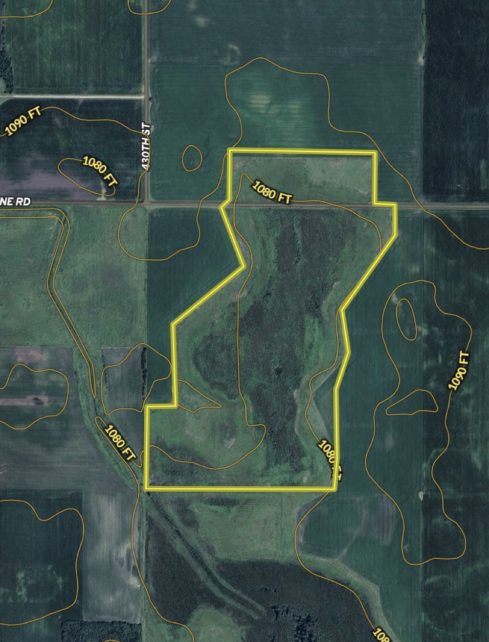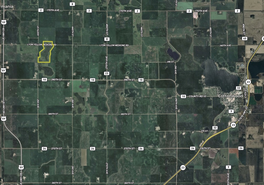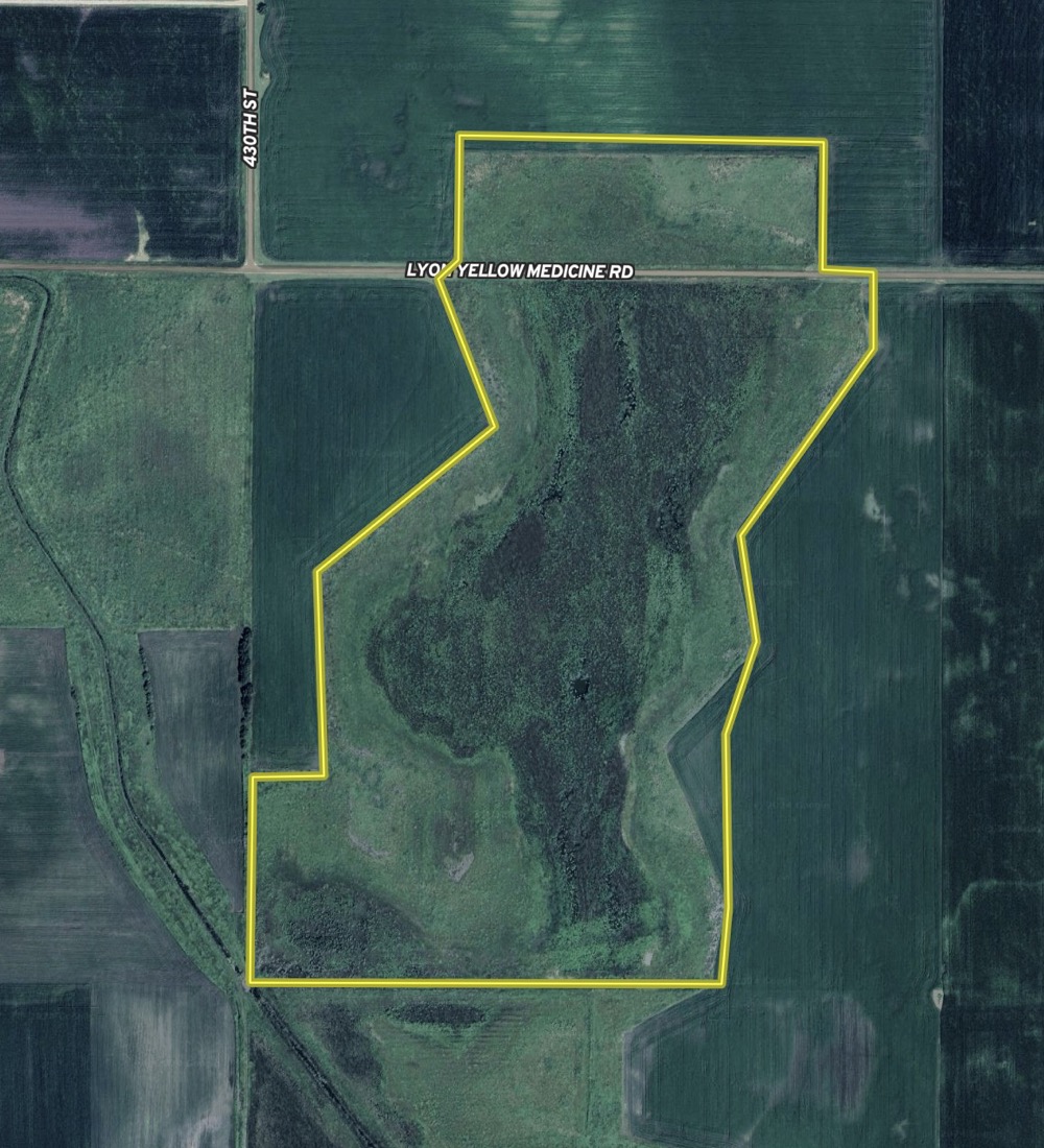 16.1 surveyed acres are north of Lyon Yellow Medicine Road, which means they are in Yellow Medicine County. The other 94.91 surveyed acres are south of the road in Lyon County.