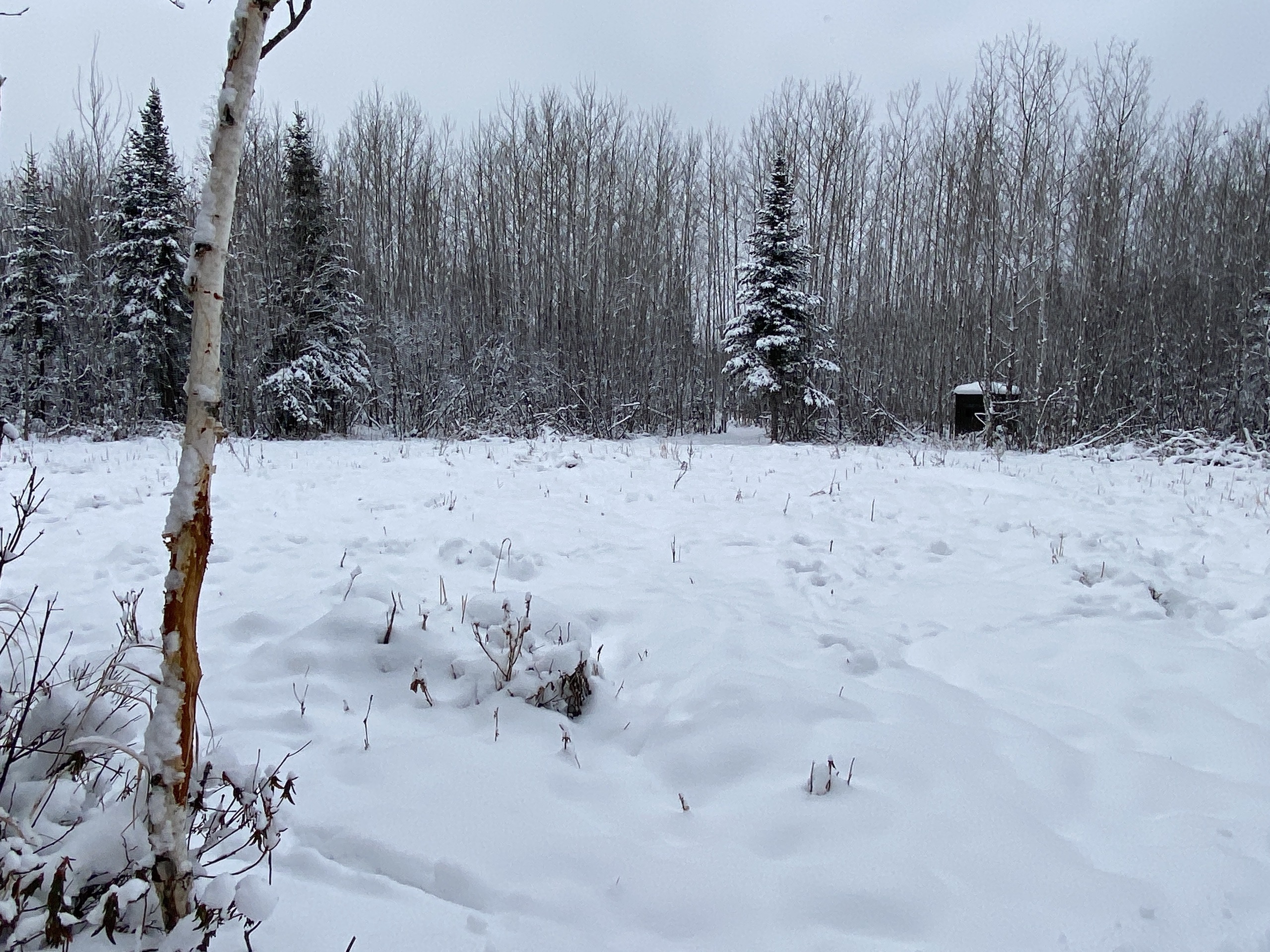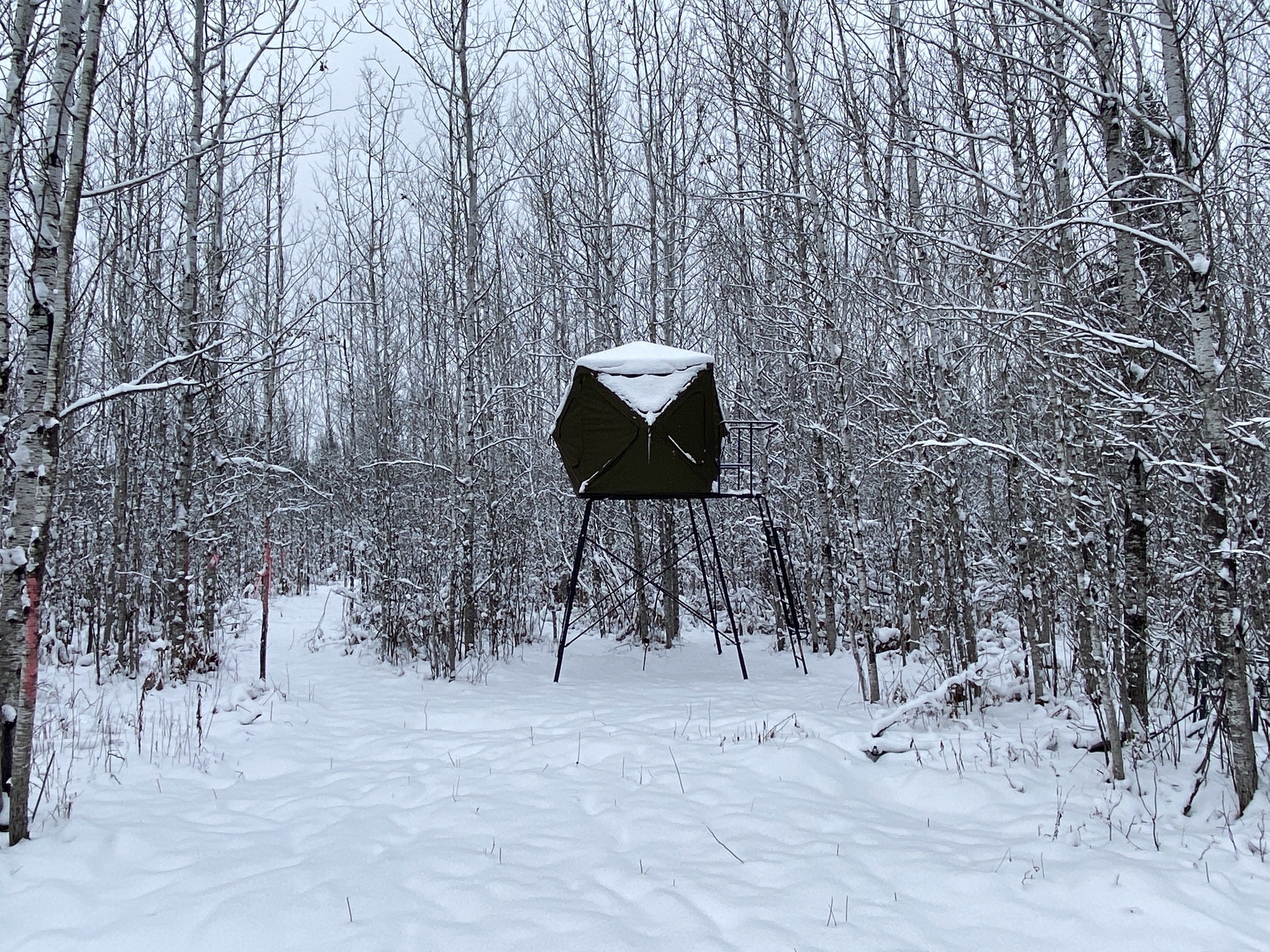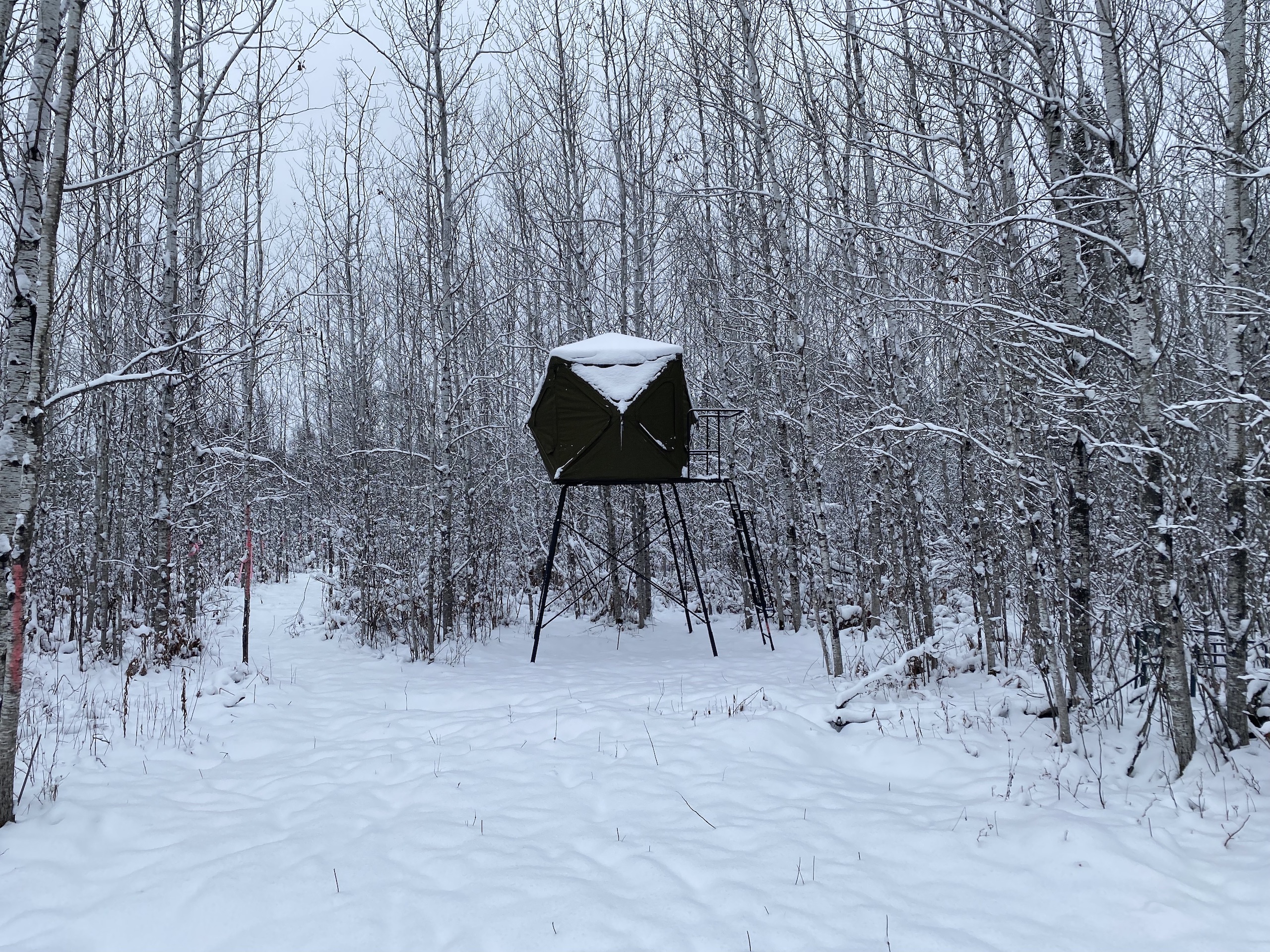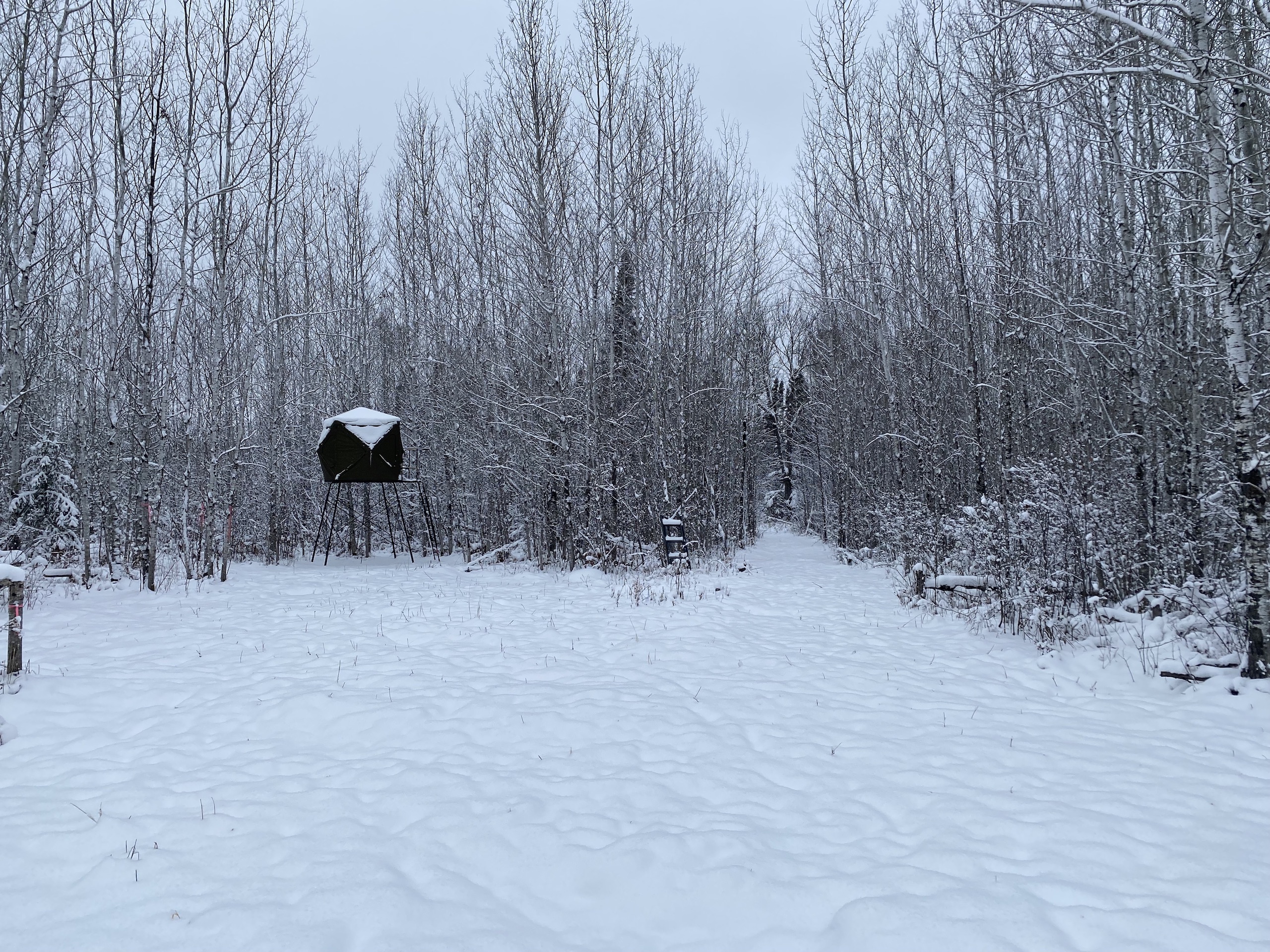 I first checked out the property in the summer, and the plots were looking super good. When listing it and taking pictures, there was snow on the ground, but it was still very apparent that deer were using the property and hitting the two plots to the south finding food under the snow. Perhaps the food mix in those plots or the awesome bedding cover and browse mix also right up to those plots. That said, it’s no surprise the seller has had some pictures of a couple of great bucks in the last couple of years. One of which he had a close encounter with but couldn’t pull off on a stud of a buck which he also has sheds to. The seller provided some game camera photos included in the photos on this listing from the last couple of years. The seller has the driveway coming in good to be able to drive his truck into his camper site. Then from there, a person can access the trail system. The timber on the property is a super nice mix of aspen, spruce, fir, etc. Also, some alder areas and mixed brush with grassy pockets have great deer cover. Getting back to the first plot behind the camper, the seller has a box blind on the ground that overlooks that plot with a small trail out the back side to sneak out easier if deer are in the plot. The seller also has a super nice heavy-duty hub-style blind on a platform on the back plot and main trail system, and a ladder stand farther to the north just off of that same trail system. The camper would also go with the property. This property will be excellent if you want to hunt deer, bear, grouse, or trap. The seller has also had pictures of a moose a few times on the property. Also nearby are thousands upon thousands of acres of public lands and excellent fishing lakes. If this sounds like the Northwoods getaway you’ve been looking for, I suggest not waiting around on this one!