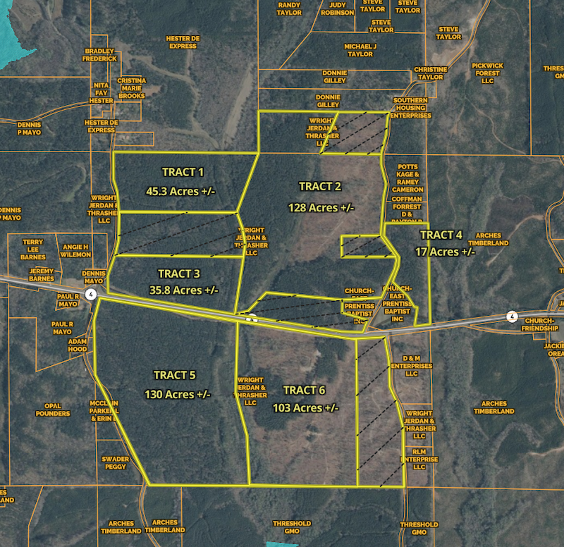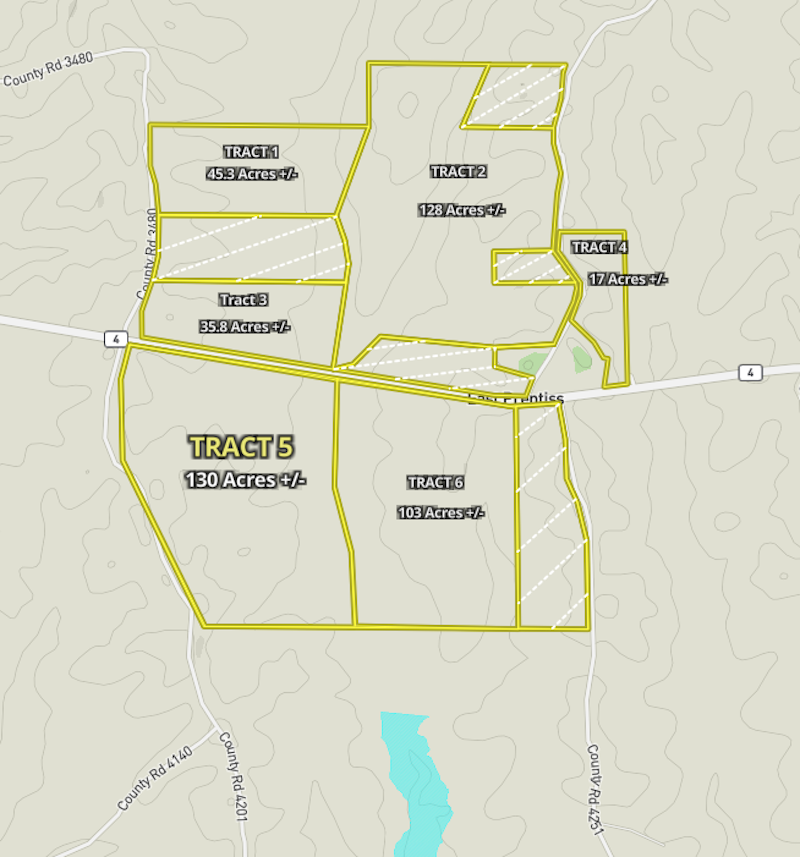Tract 5 consists of approximately 130± acres and is part of a larger multi-tract offering located near Bay Springs Lake. This tract features Highway 4 and county road frontage, providing convenient access and flexibility for a variety of uses. Utilities are available offering great home sites, hunting, and recreational opportunities. The property was timbered within the past few years, allowing for new regenerative growth that has created a favorable wildlife habitat. Scattered hardwoods remain throughout the tract and along SMZs, offering diversity in cover and natural travel corridors. With good topography and the potential for interior road development, the tract is well-suited for hunting and recreational use, including green field and shooting house placement with efficient access. The tract is located approximately 2 miles from Bay Springs Lake and offers nearby access to Bay Springs Marina, Old Bridge Beach, and the Jamie Whitten Lock and Dam. Additional outdoor opportunities are available approximately seven miles away at the John Bell Williams Wildlife Management Area. The property is approximately four miles from the Natchez Trace Parkway and approximately 16 miles from Booneville. Tract 5 may be purchased individually or in combination with additional available tracts .**Being sold per acre/per survey at $2,500 an acre, the final purchase price for each tract shall be calculated using the final surveyed acreage**. Option to purchase additional tracts.