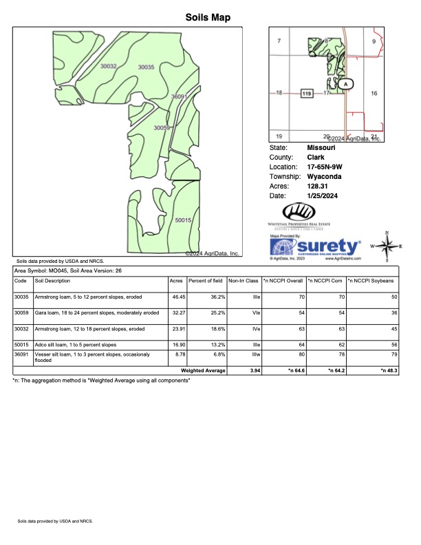 Located in a great area of Northeast MO, this nice tillable and investment property offers great deer and turkey hunting! This property is located about 3.5 miles North of Wyaconda and has ideal access right off State Highway A, just a half mile south of U.S. Highway 136. This property features 105.5 +/- acres currently in bean and corn rotation and cash rented for $180/tillable acre. There are also 17.9 acres of CRP that just expired in Sept 2023 and will be converted back into production for 2024. Along with a nice income, this property offers great hunting! The timber block on the south end and timbered draws provide excellent cover and travel routes for deer and turkeys! Two ponds hidden in the timber provide great water sources for wildlife. If you are looking for a farm that provides a nice income stream in a top-notch hunting county of Northeast Mo, give Listing Agents Jeff Propst and Stephen Stockman a call for more information or to set up a showing!