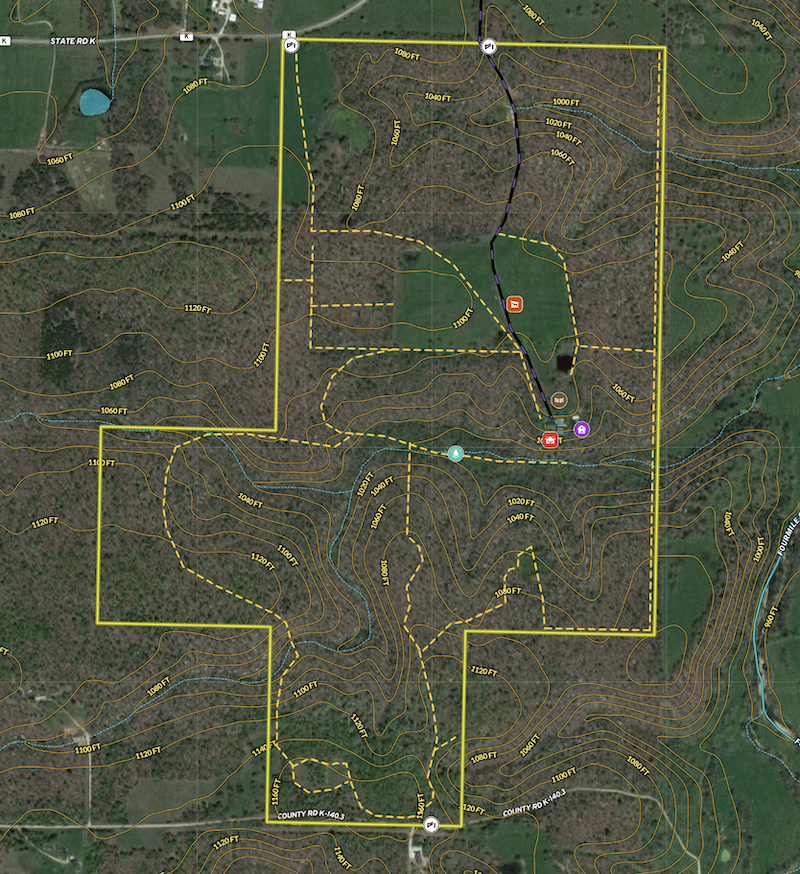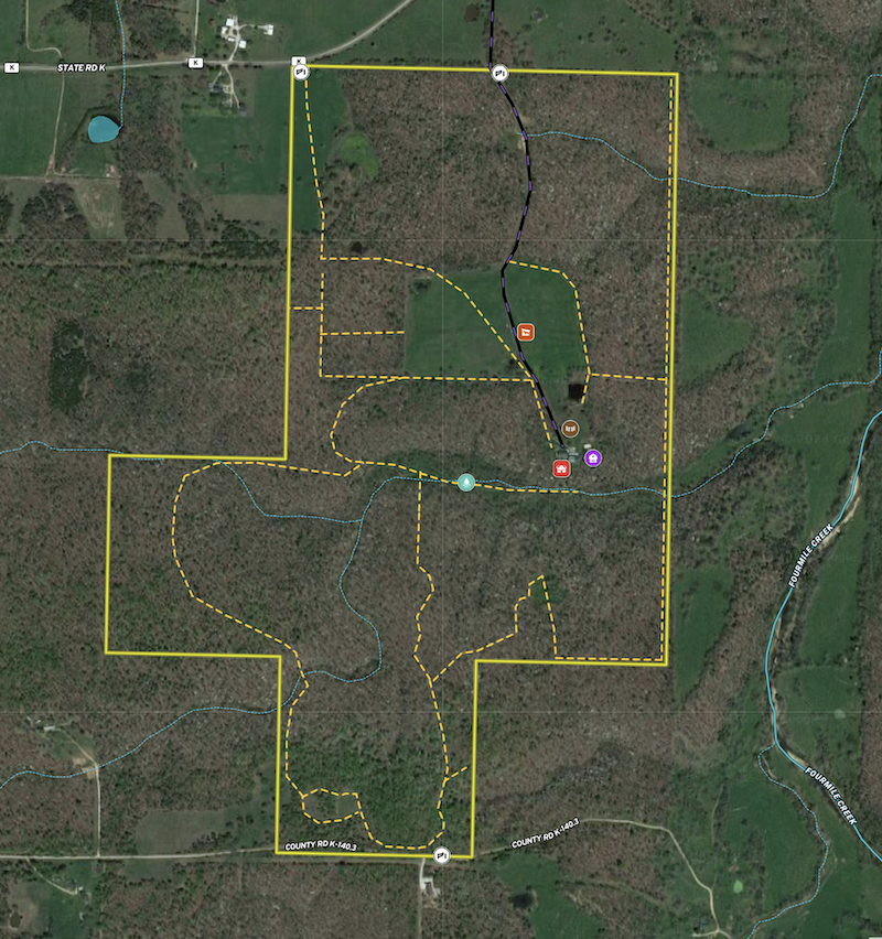 Food plot, Trail network, Tree stand/Blinds, Internal Road Network, Gated entrance, Livestock facilities, Equine facilities