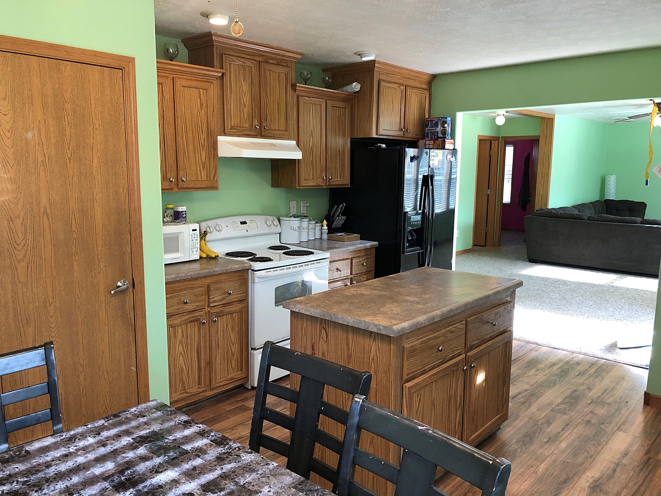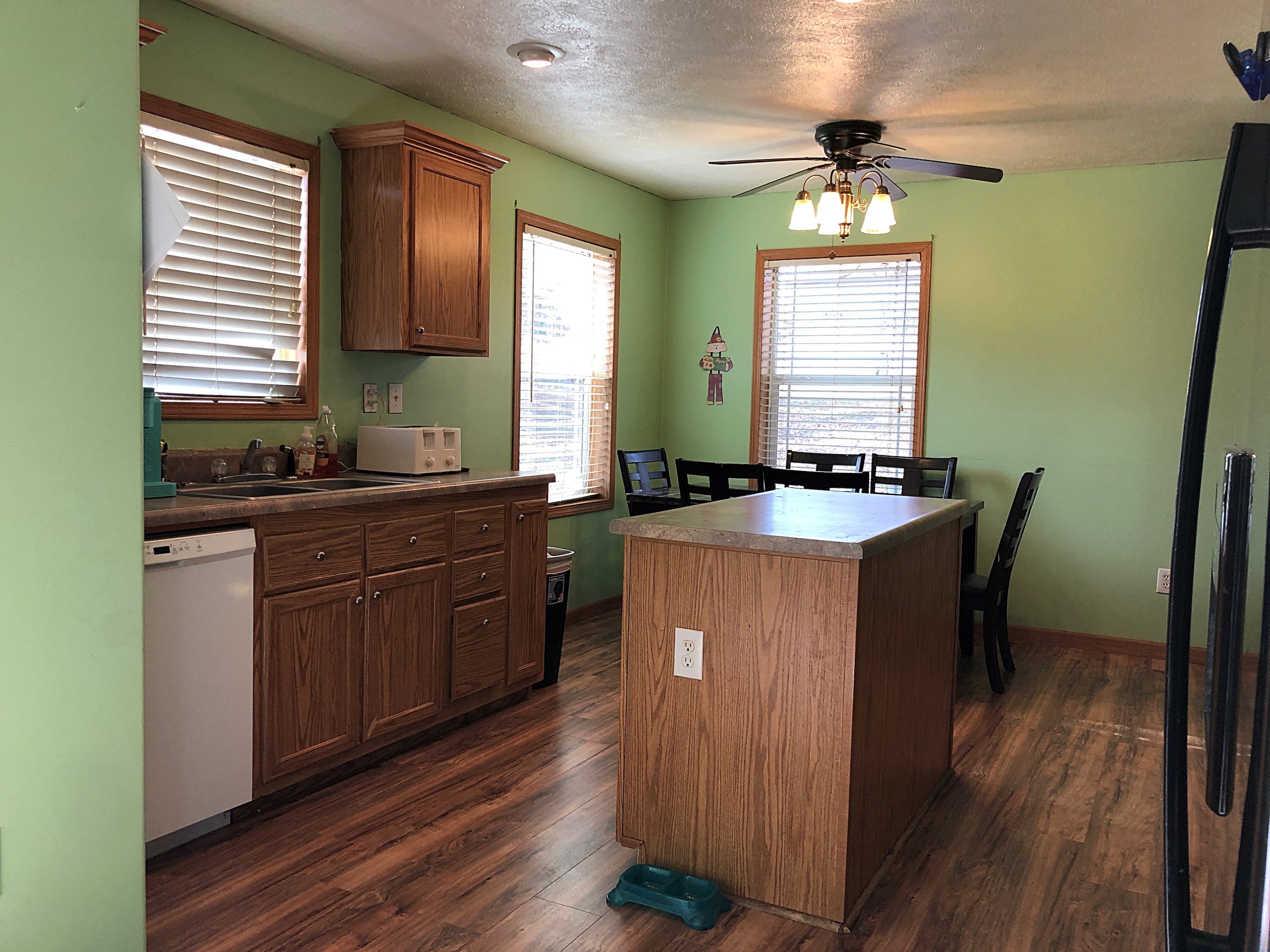 - Eat-in kitchen has an island, pantry, and dishwasher