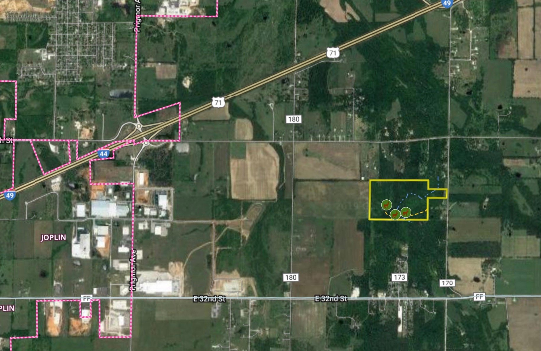 Location, Location, Location!!! This excellent property is located two miles east of Prigmore Avenue and a half-mile north of 32nd Street. It is a rarity when this quality of a hunting property with such an outstanding building site, approximately 300 +/- feet of road frontage, becomes available. The frontage leads to and opens up into the majority of the property, which is secluded and a sanctuary for bucks to reach larger and older age classes. It is bordered on the west by pastures and hayfields, and additional timber tracts lay to the north, south, and east. A high percentage of excellent timber covers the rolling landscape, including bearing oaks and mature walnut trees. There are a number of funnel-armed open meadow areas perfect for food plots and managing game movement. Grove Creek, which is a wet weather creek, runs across the southeastern portion of the property. An excellent trail runs from the entrance along the southern boundary through the timber to a large open area located on the western side of the property. It is clear enough and wide enough to easily accommodate a pickup. If you are looking for a solid investment, hunting, privacy, and a beautiful building site with road frontage all within 5.5 +/- miles of Joplin, look no further!! Just give me a call if you have any questions or would like to book a private showing!