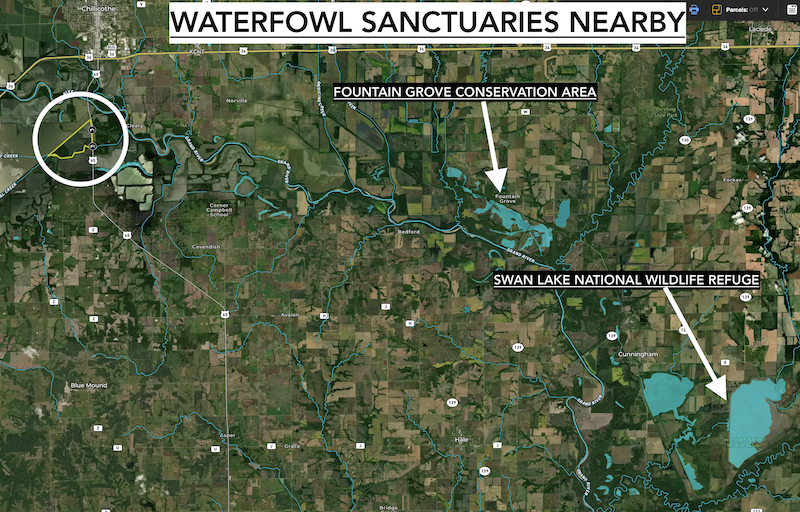 - Within 20 miles of Swan Lake National Wildlife Refuge and Fountain Grove Conservation Area