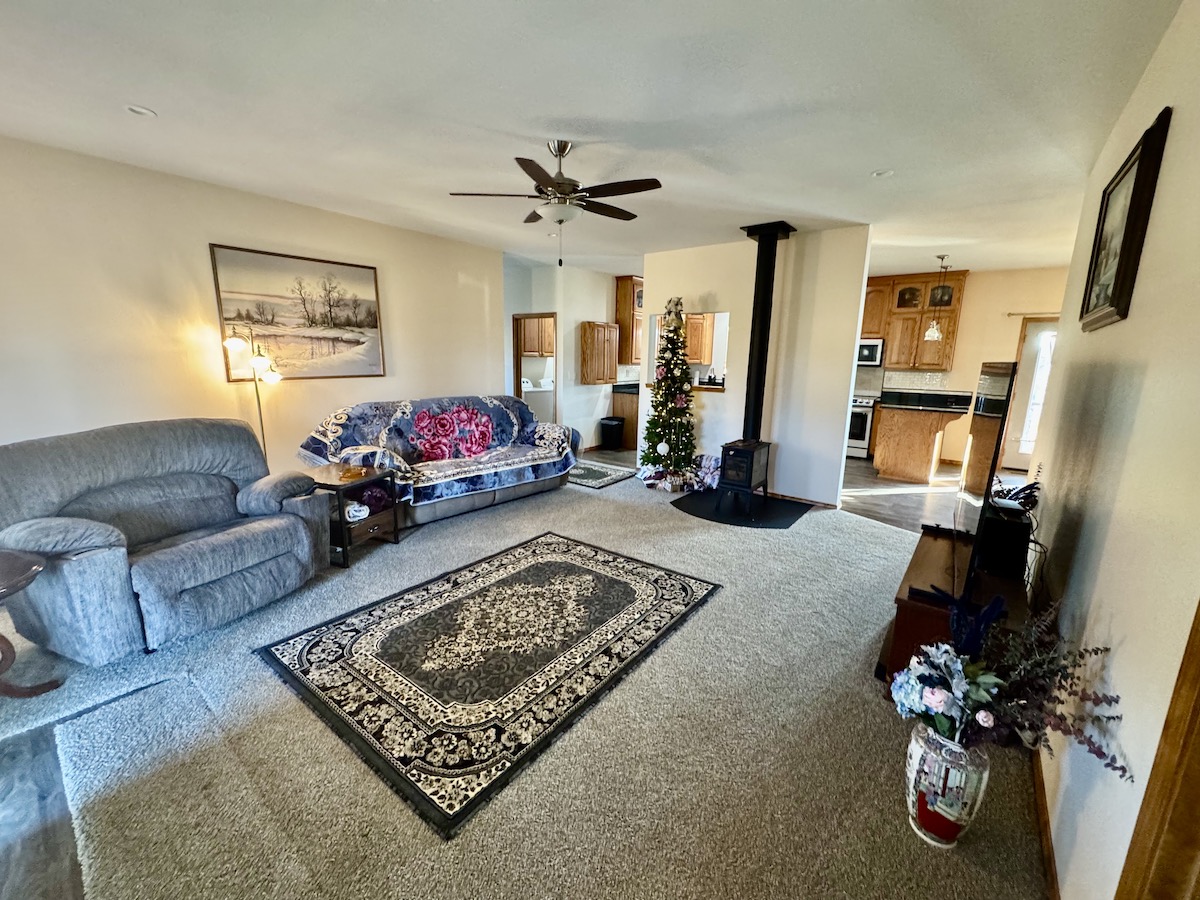 - Open floor plan with wood stove