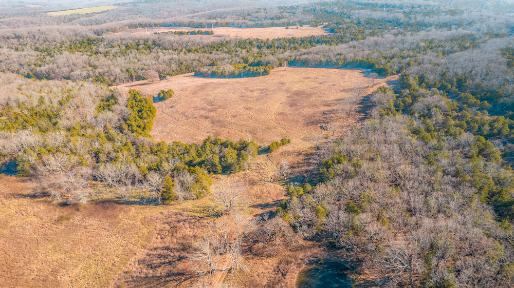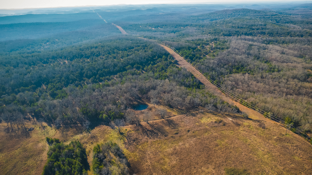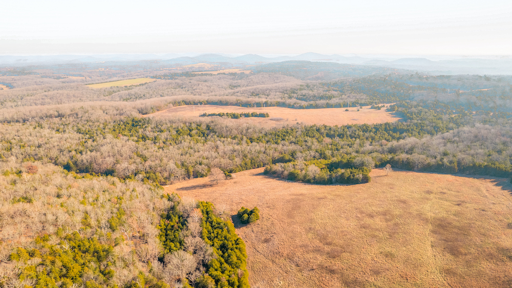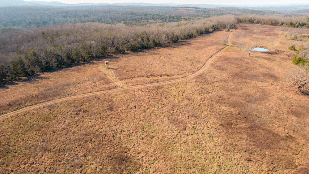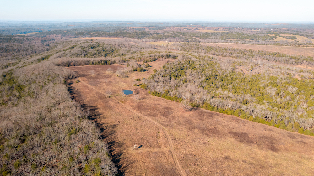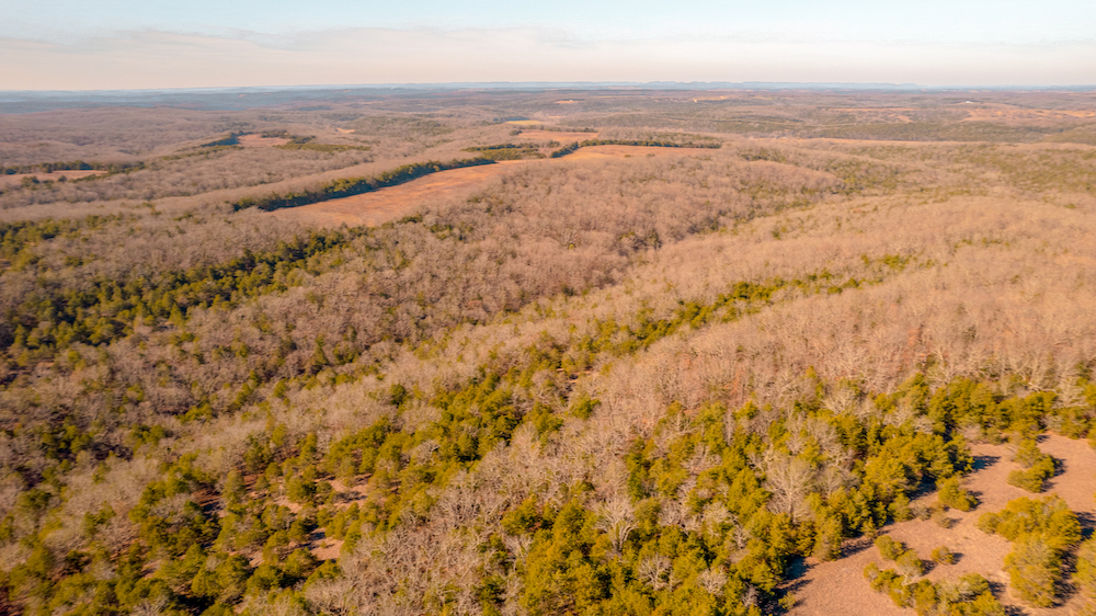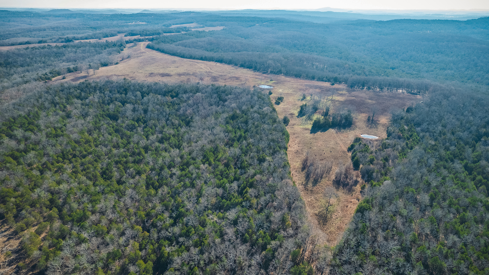 The land showcases classic Ozark character with massive ridges rolling into sweeping valleys, offering dramatic elevation changes, long-range views, and a true sense of openness. Large open areas are scattered throughout the ranch, allowing flexibility for pasture, riding areas, camping locations, or wildlife habitat improvements, while timbered ridges and draws create natural structure and diversity.