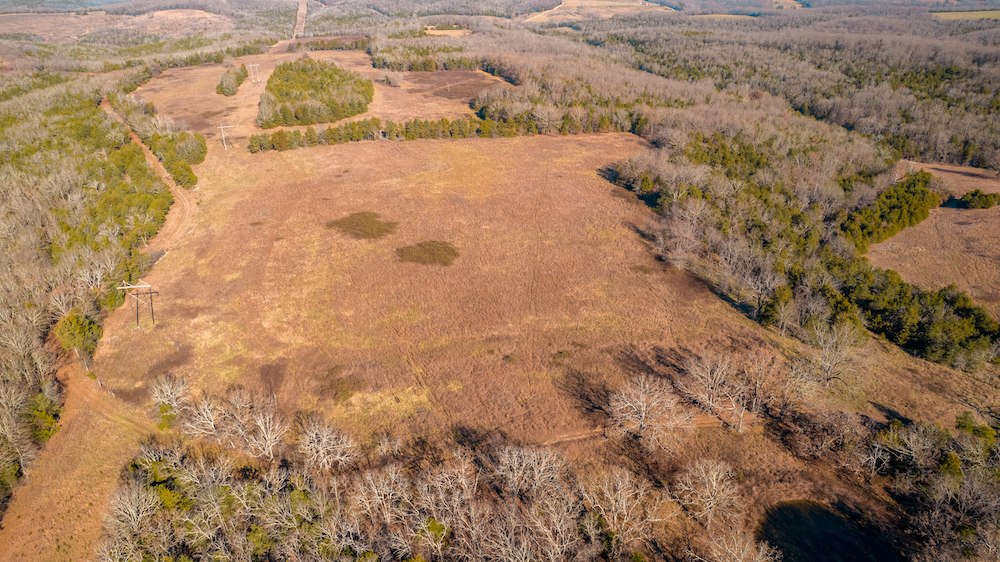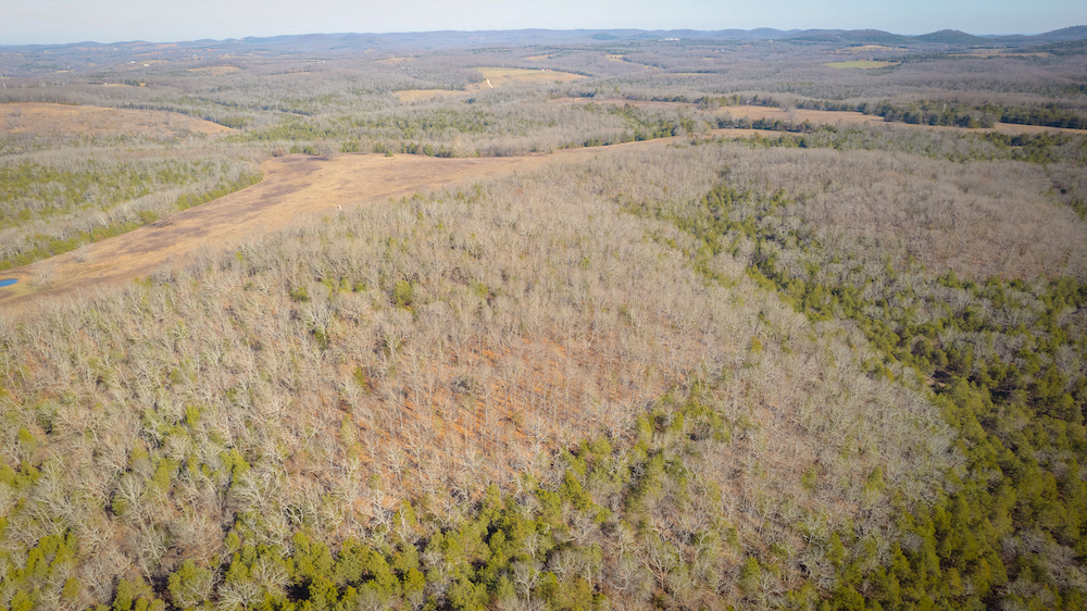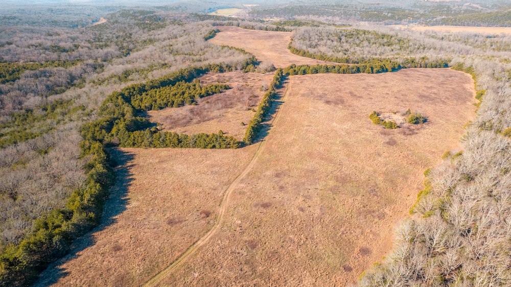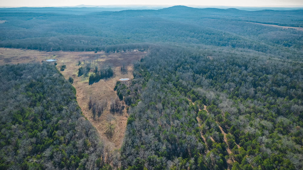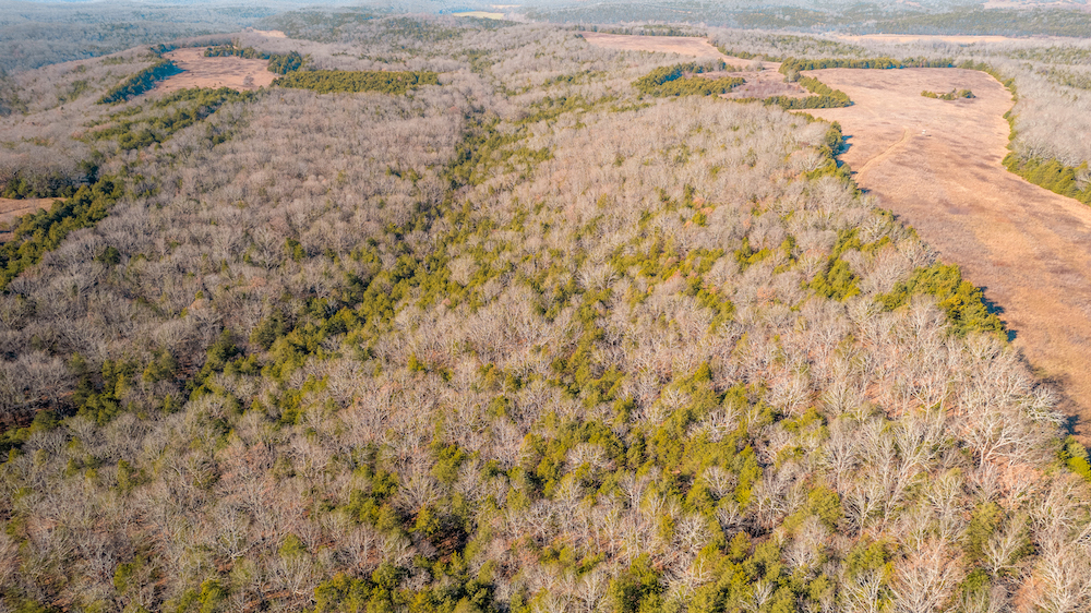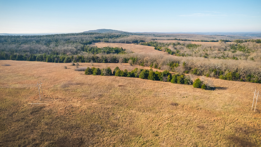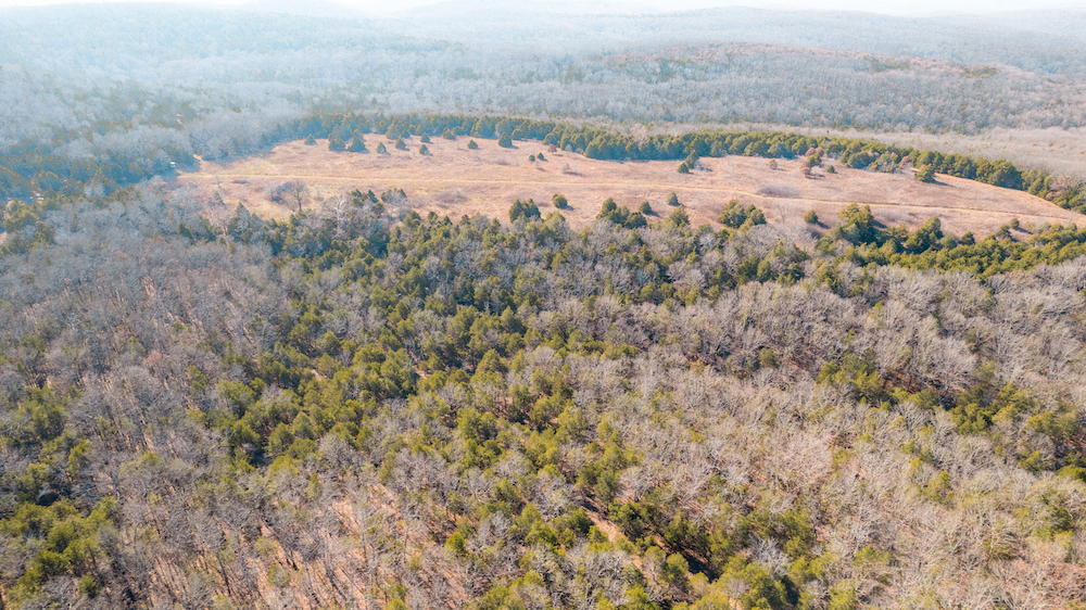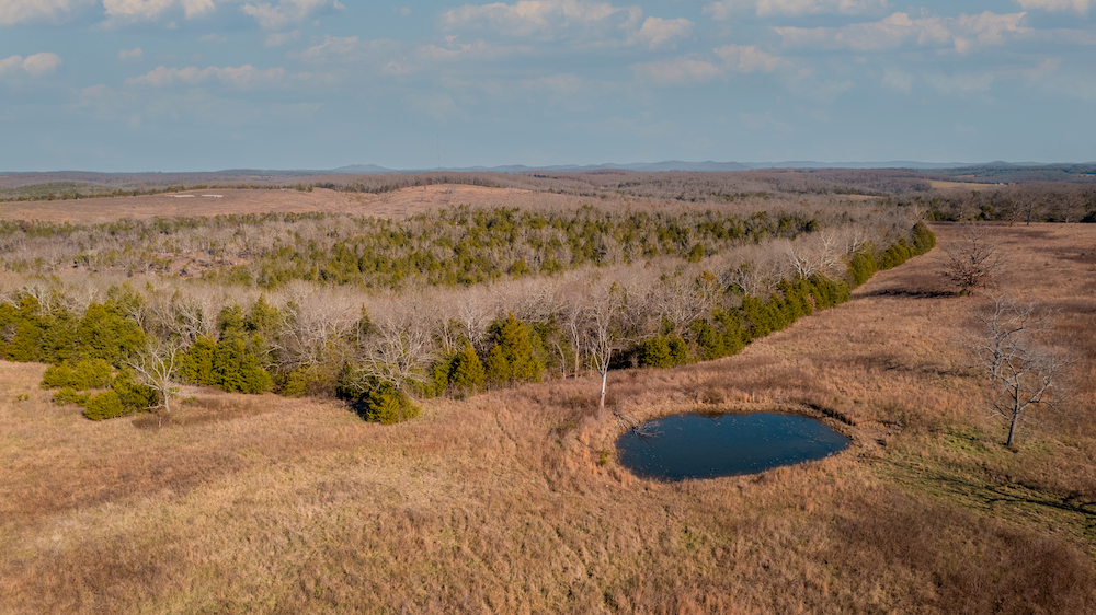 The land showcases classic Ozark character with massive ridges rolling into sweeping valleys, offering dramatic elevation changes, long-range views, and a true sense of openness. Large open areas are scattered throughout the ranch, allowing flexibility for pasture, riding areas, camping locations, or wildlife habitat improvements, while timbered ridges and draws create natural structure and diversity.