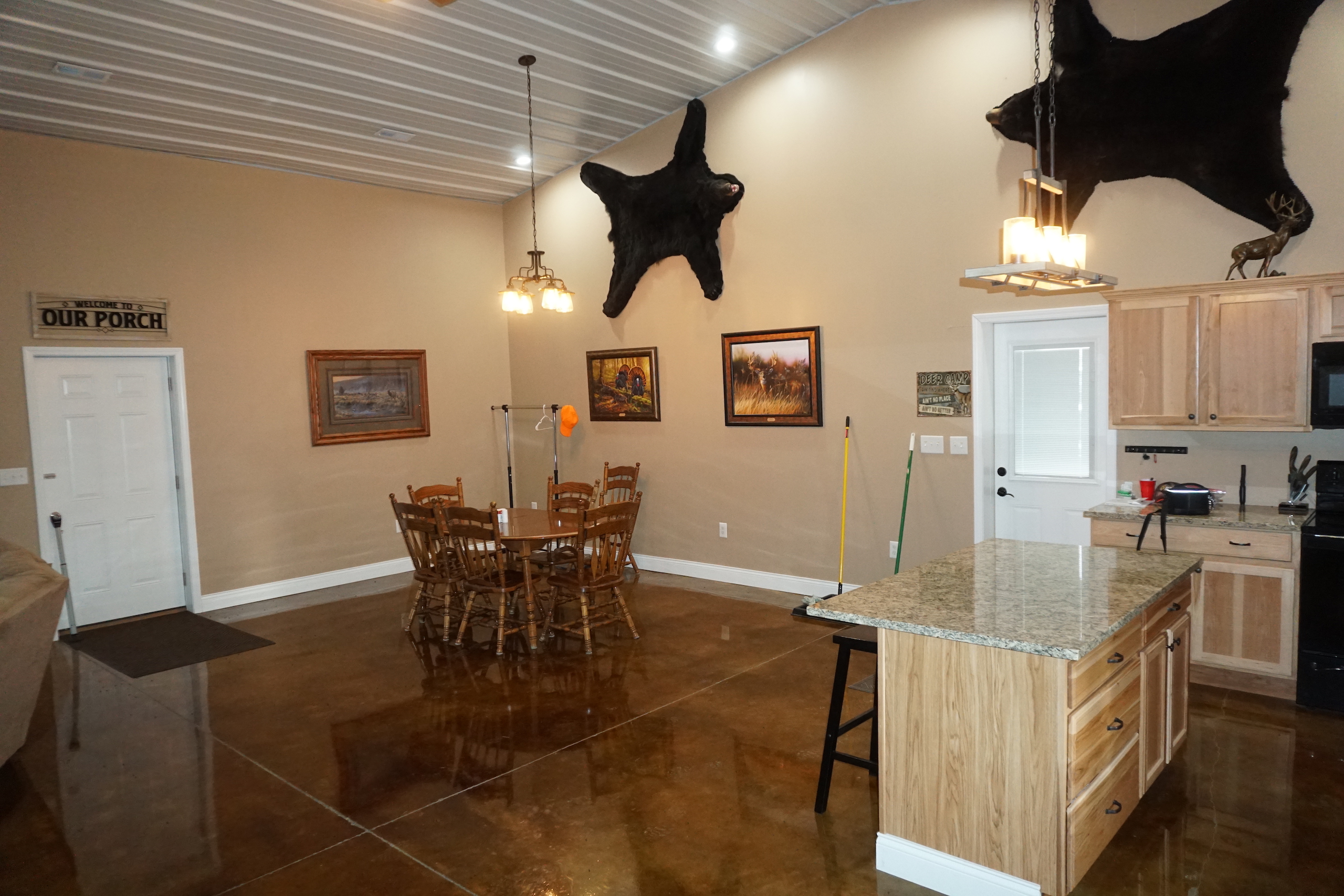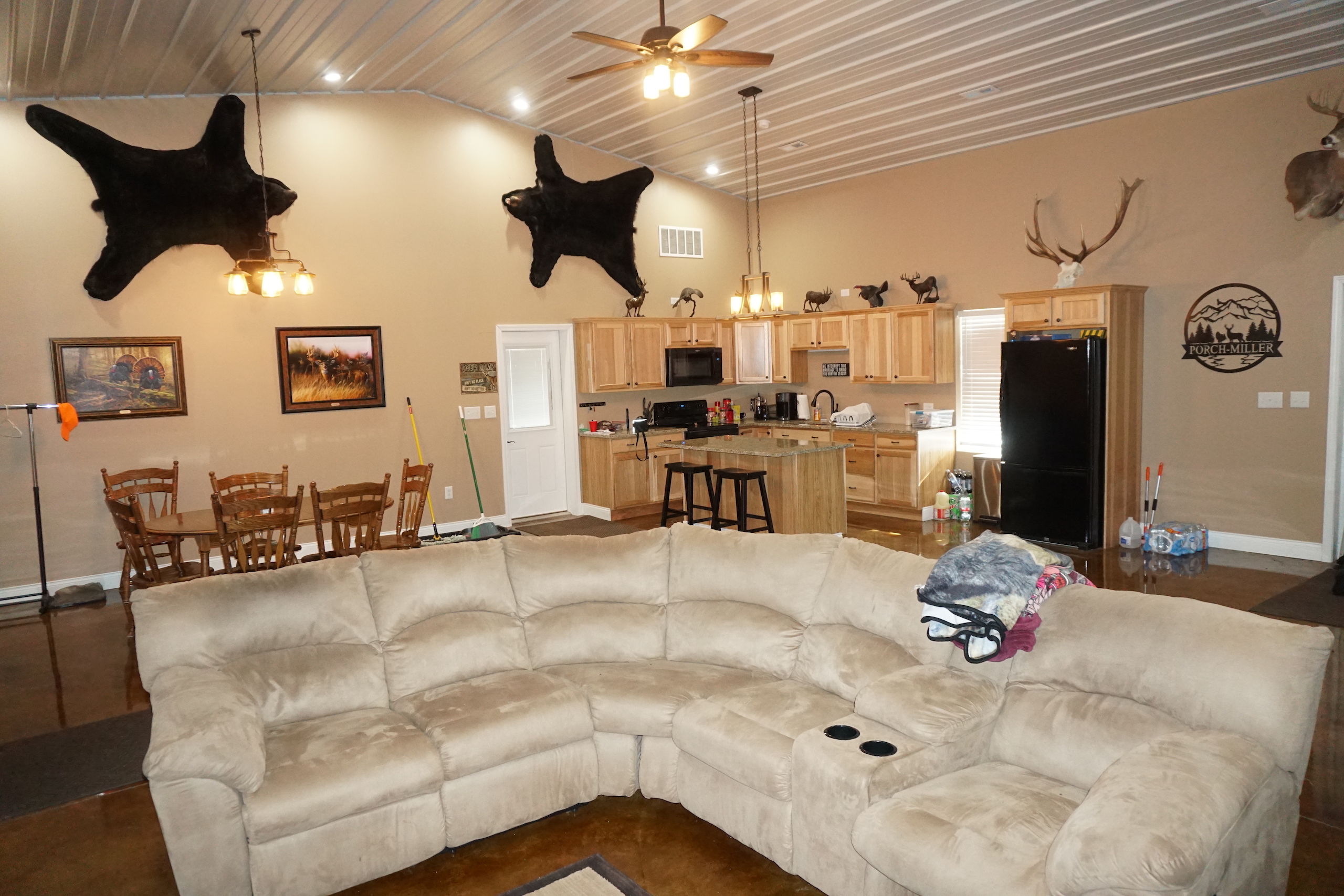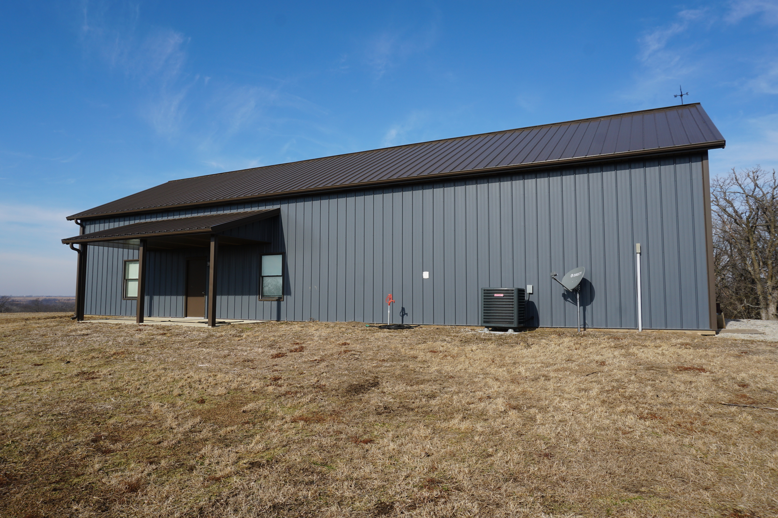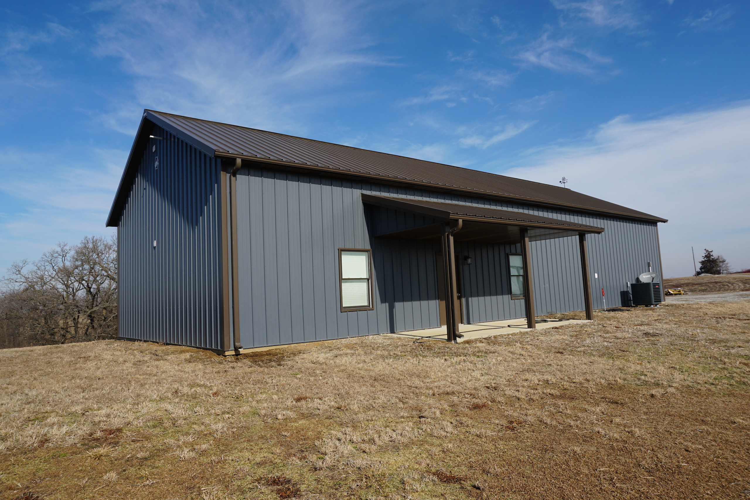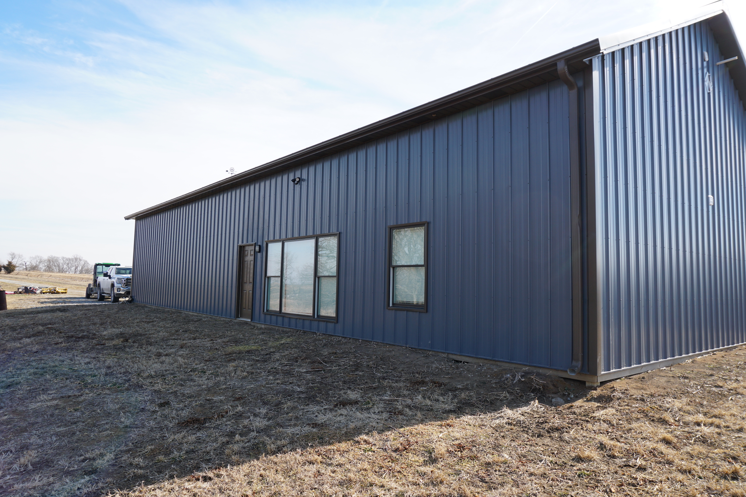 - Beautiful, custom built Morton lodge on the south end of the property features 4 bedrooms, 2 baths, open kitchen and living area, and garage area