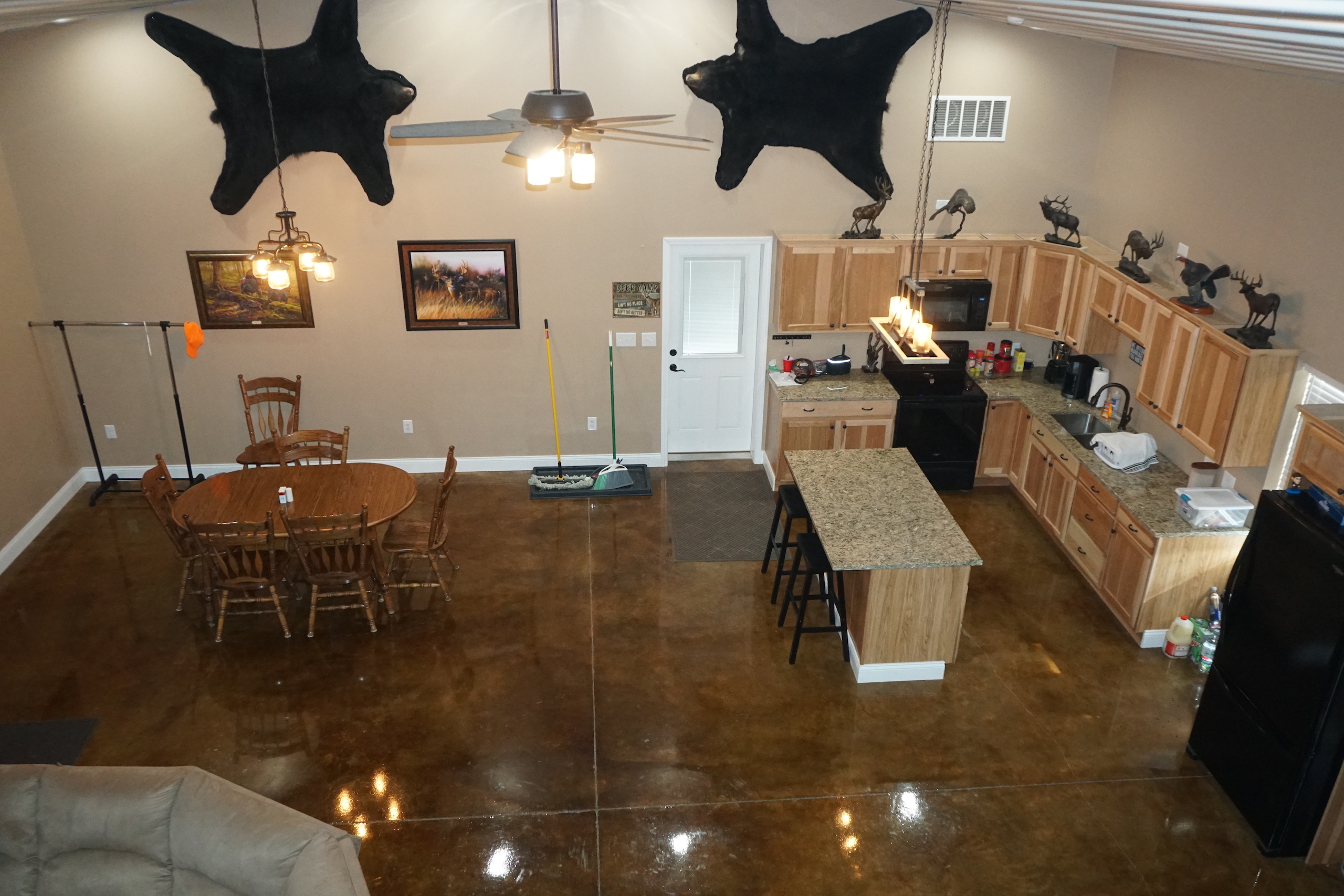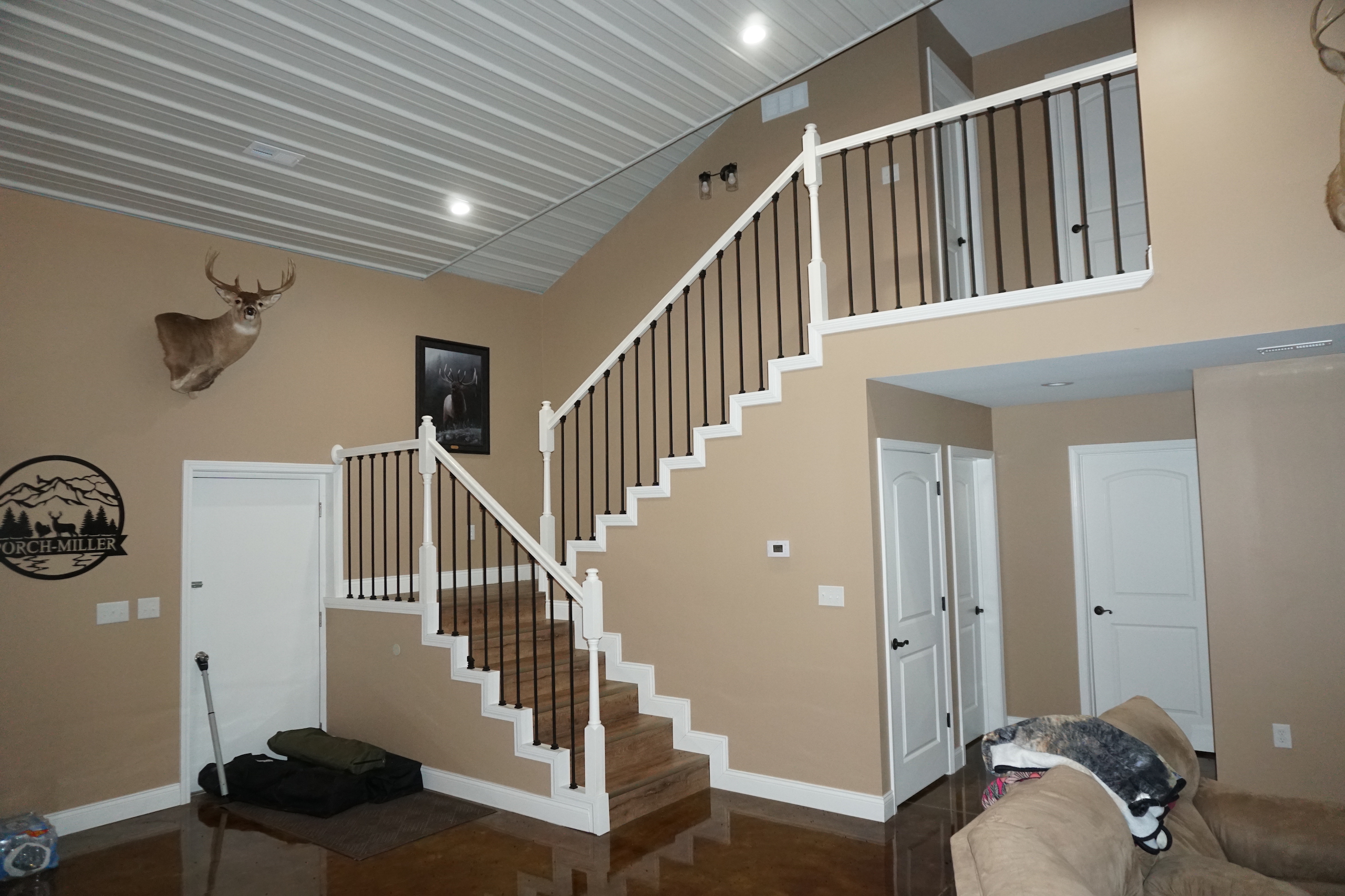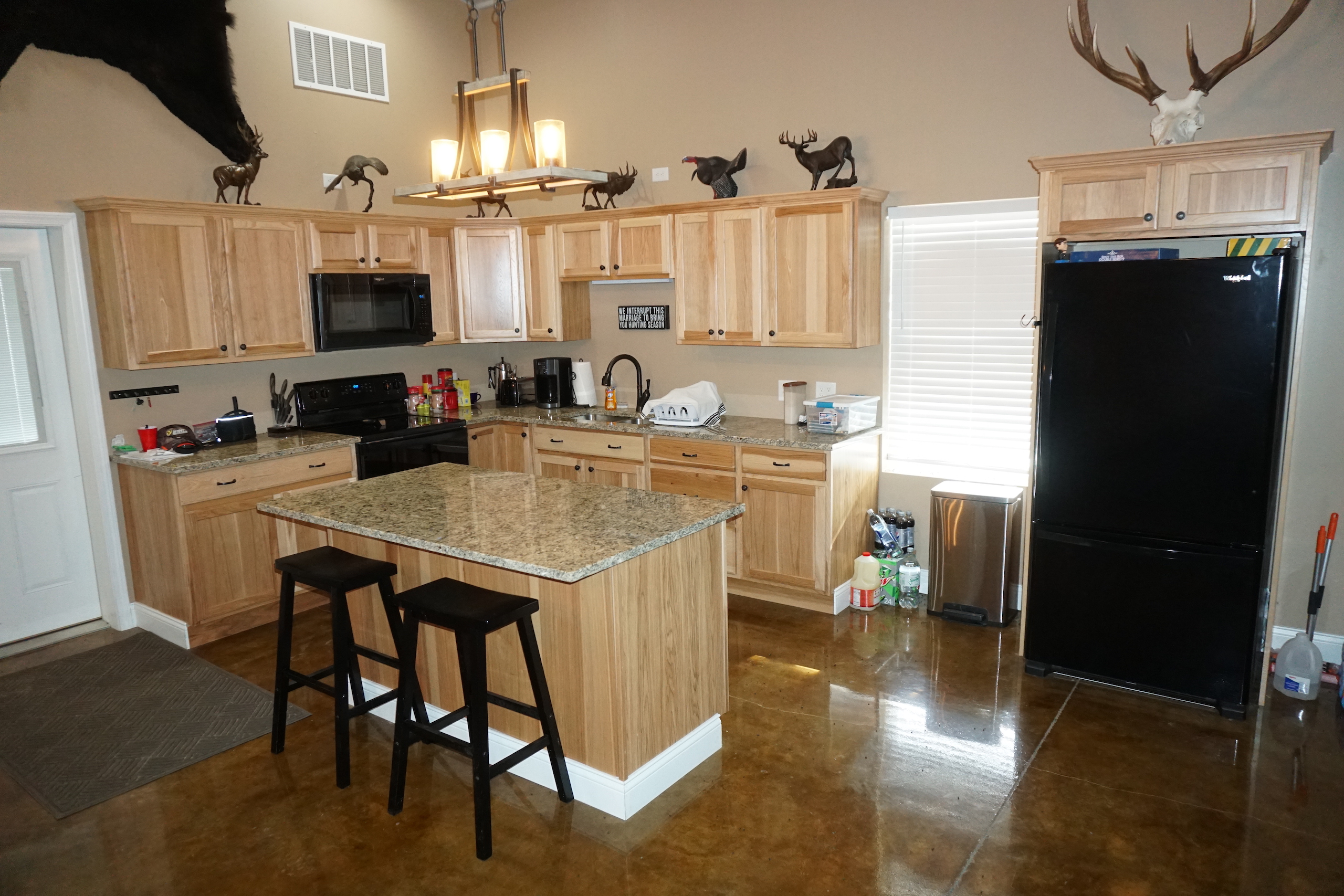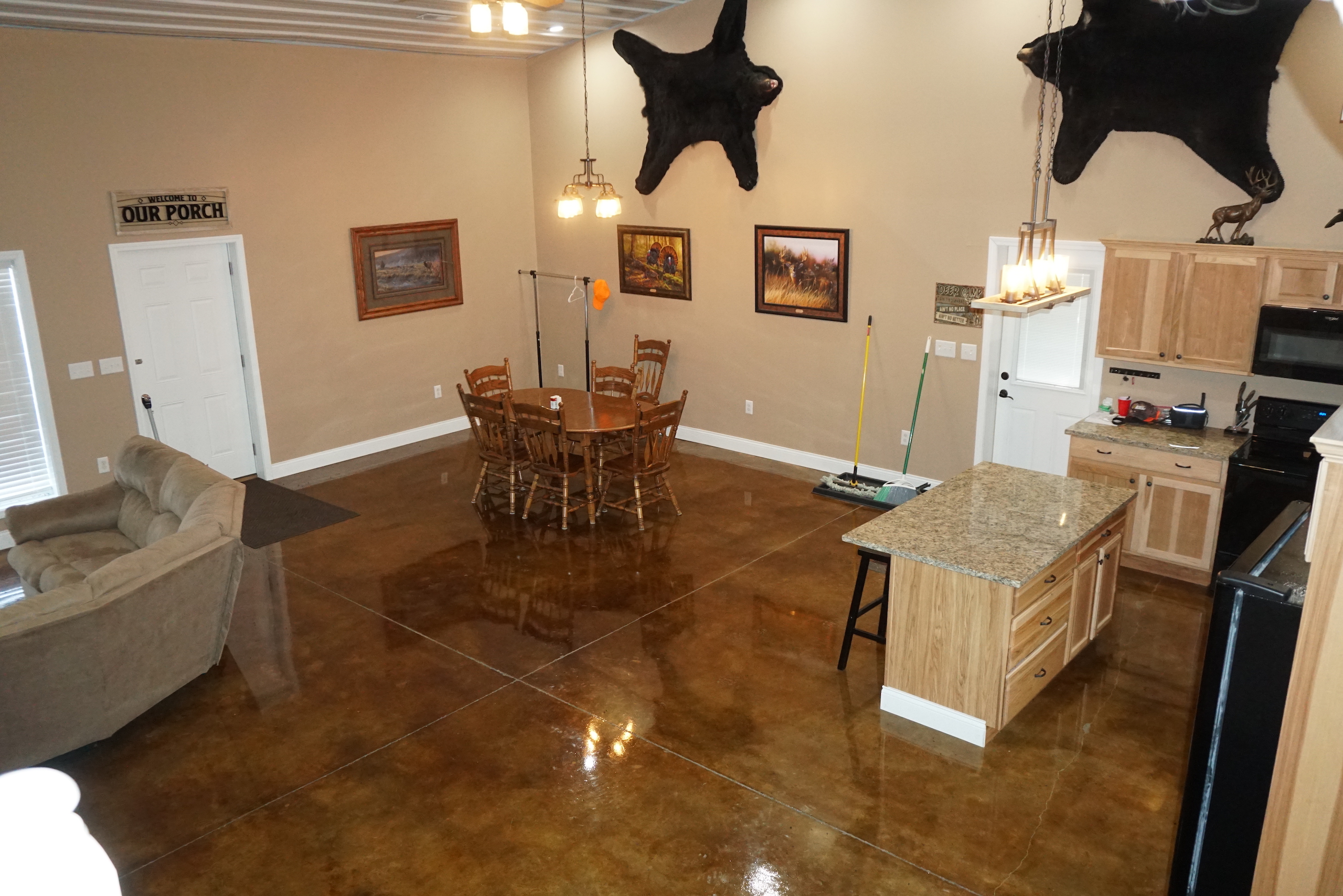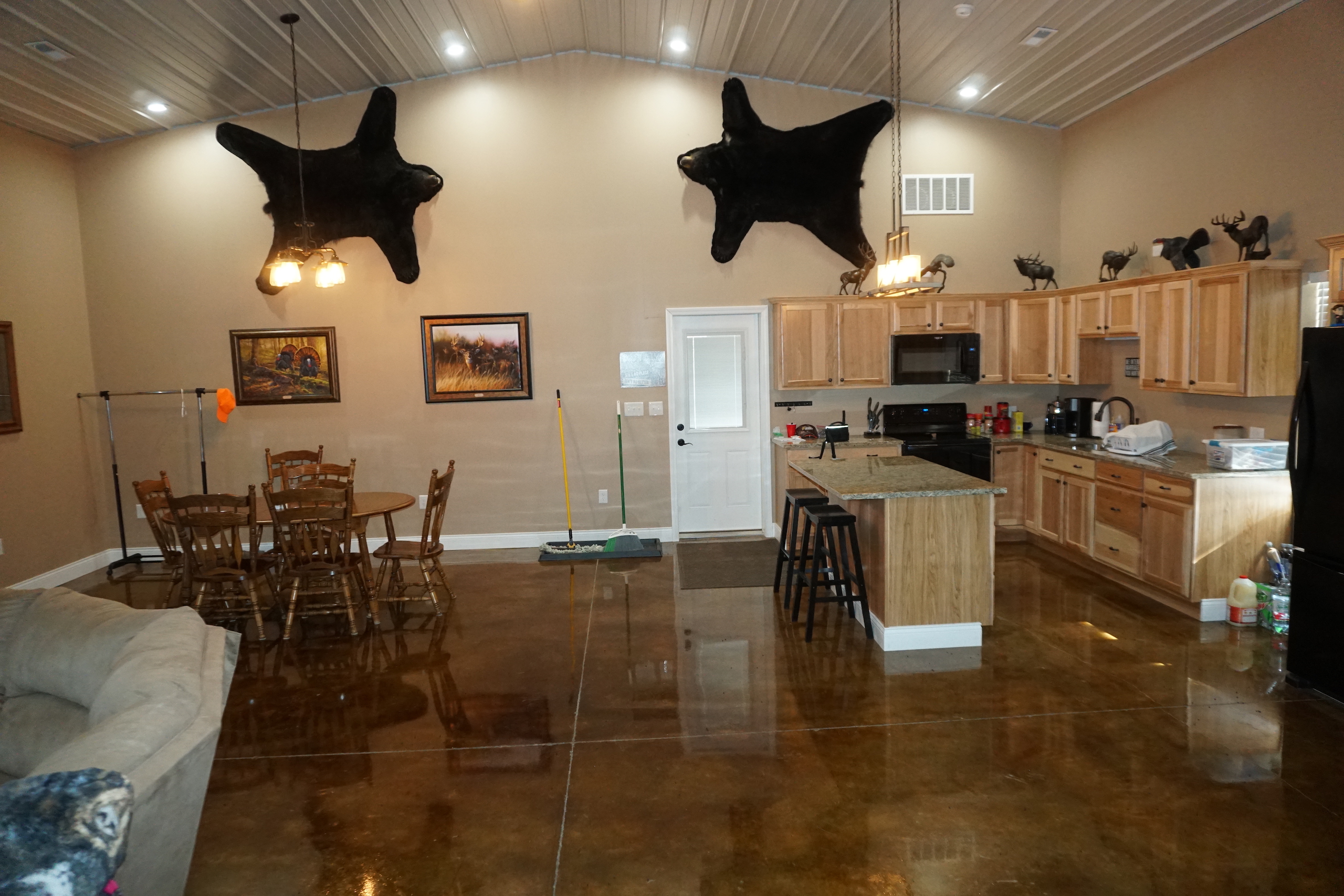 - Beautiful, custom built Morton lodge on the south end of the property features 4 bedrooms, 2 baths, open kitchen and living area, and garage area
