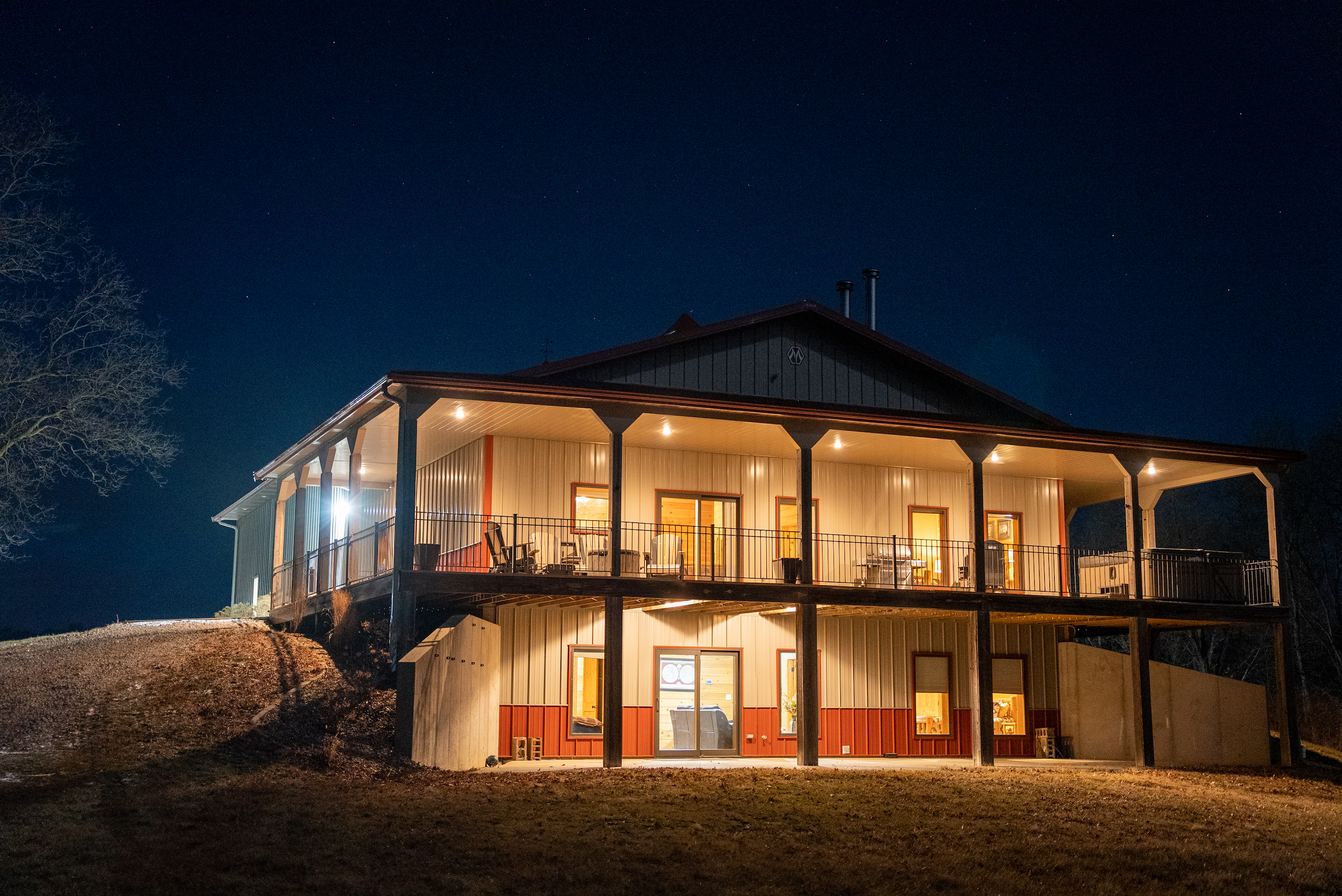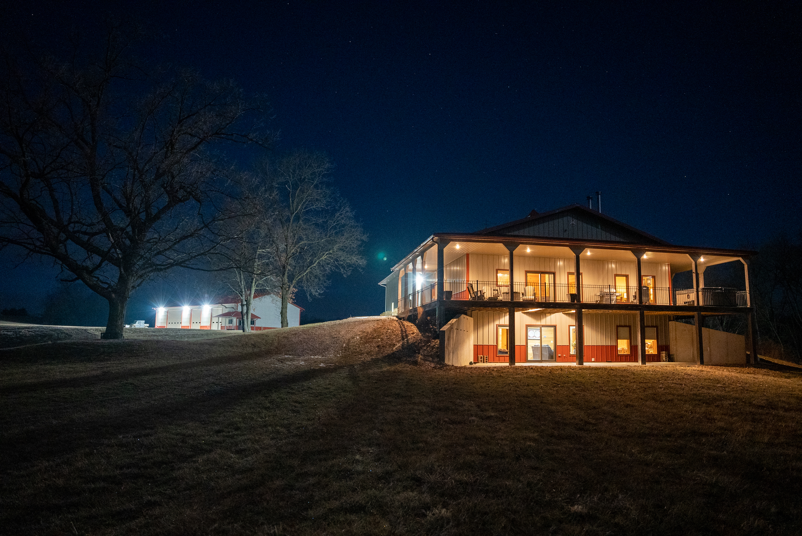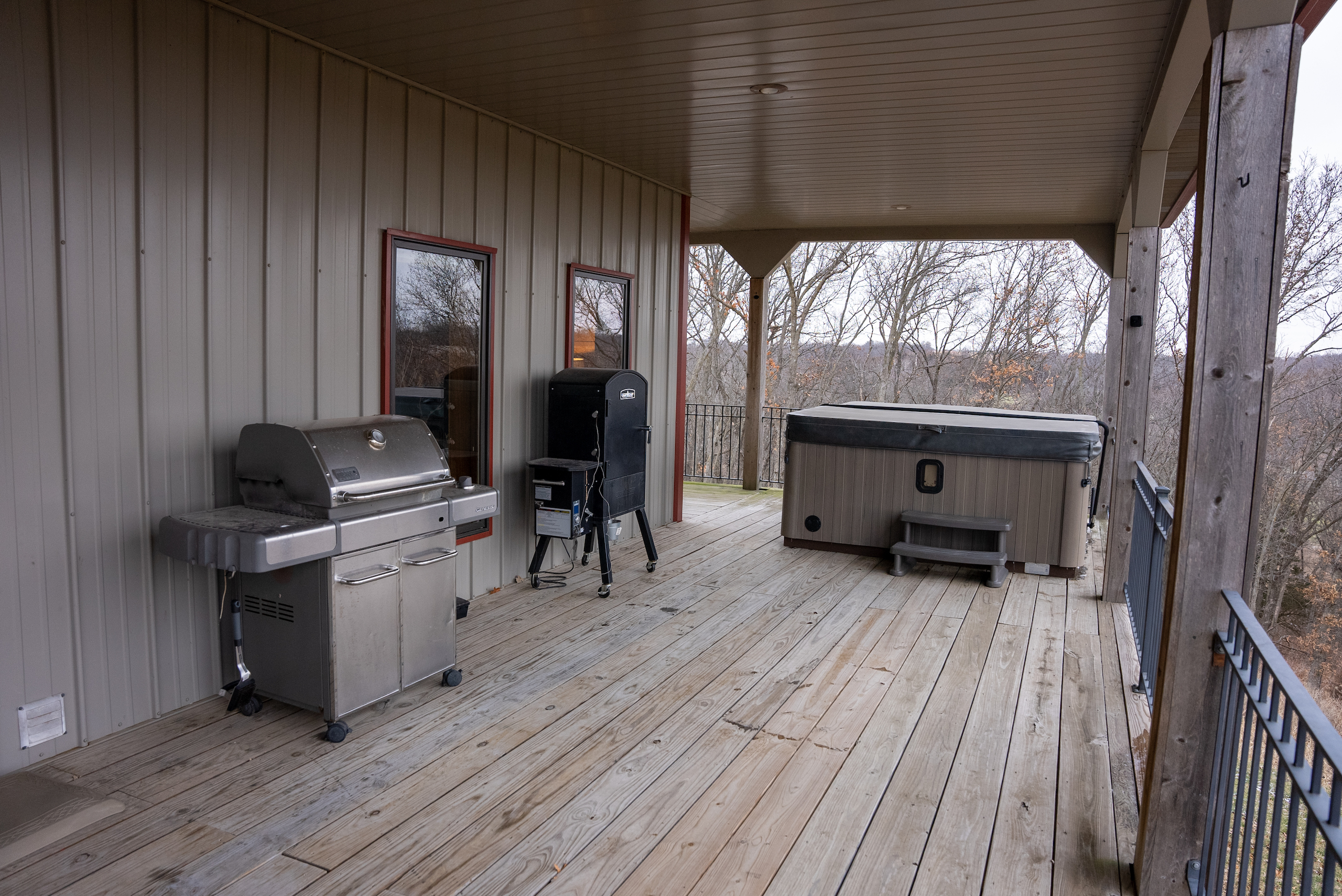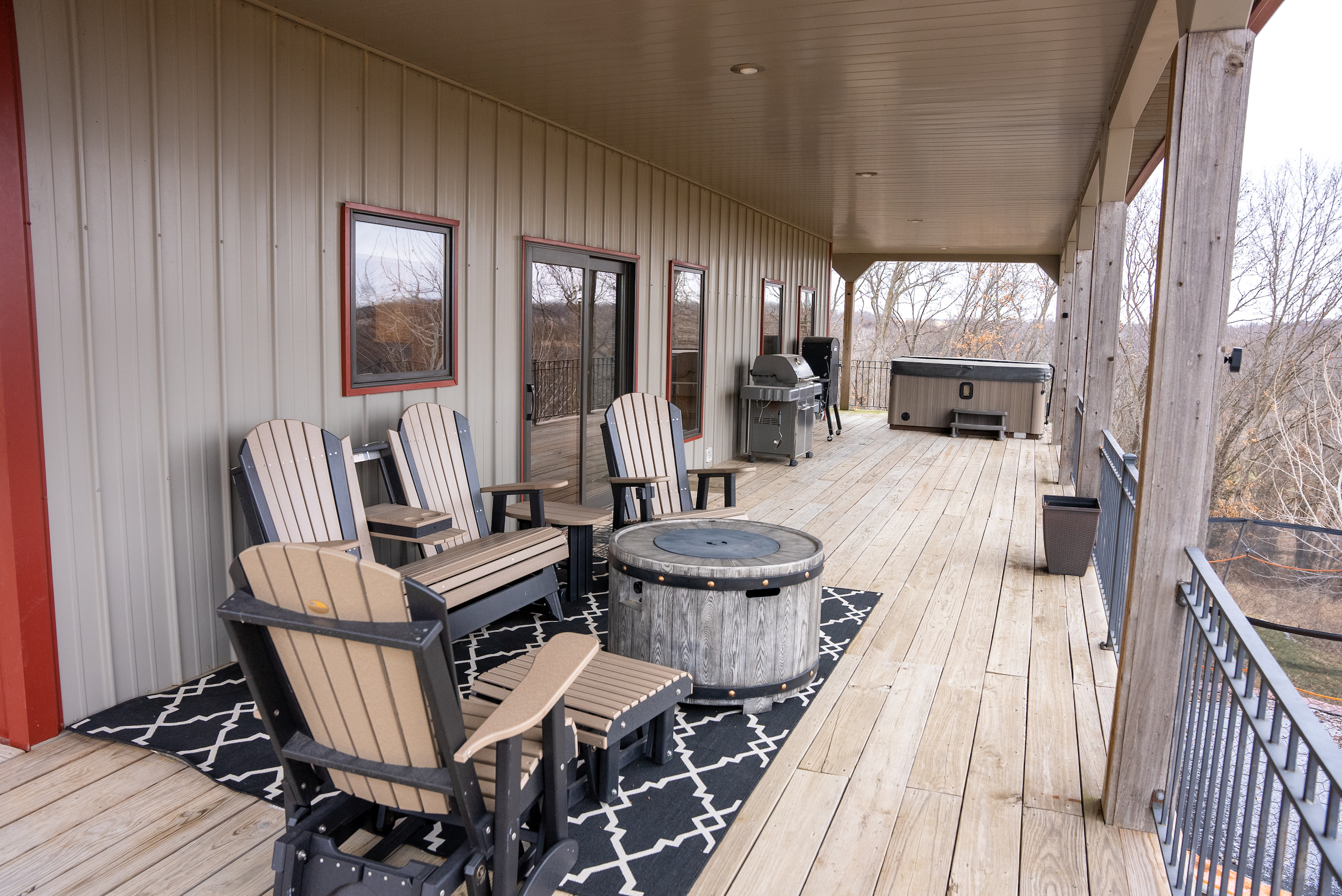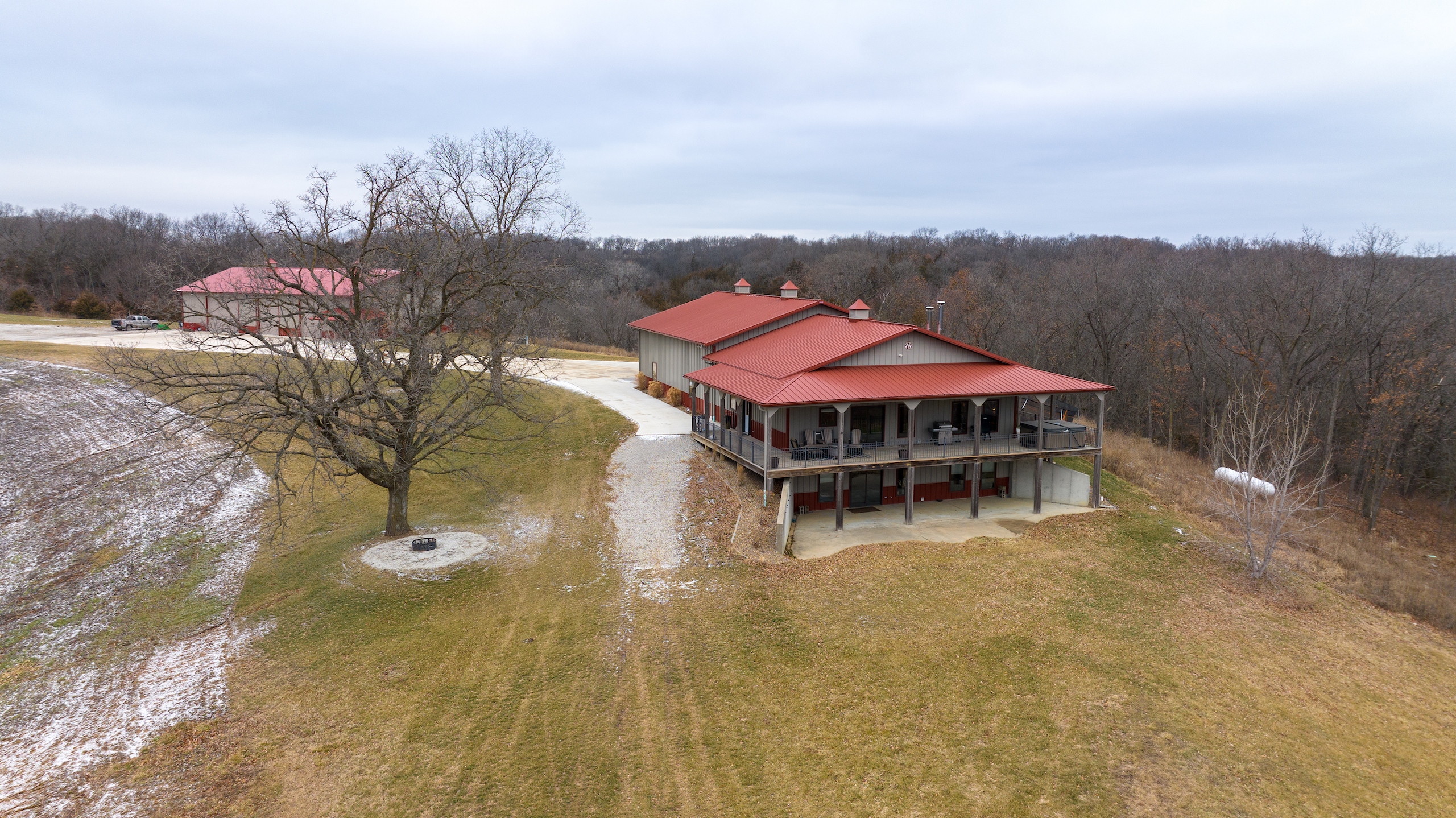 - Lodge and Barn Details. Super secluded lodge/home that is approx 4600 sq foot featuring 5 bedrooms, 4 bedrooms, 3 fireplaces, the lodge has two levels, upper level has expansive 12x90 wrap around deck with a million dollar view of the farm and features a nice large hot tub and fireplace.
