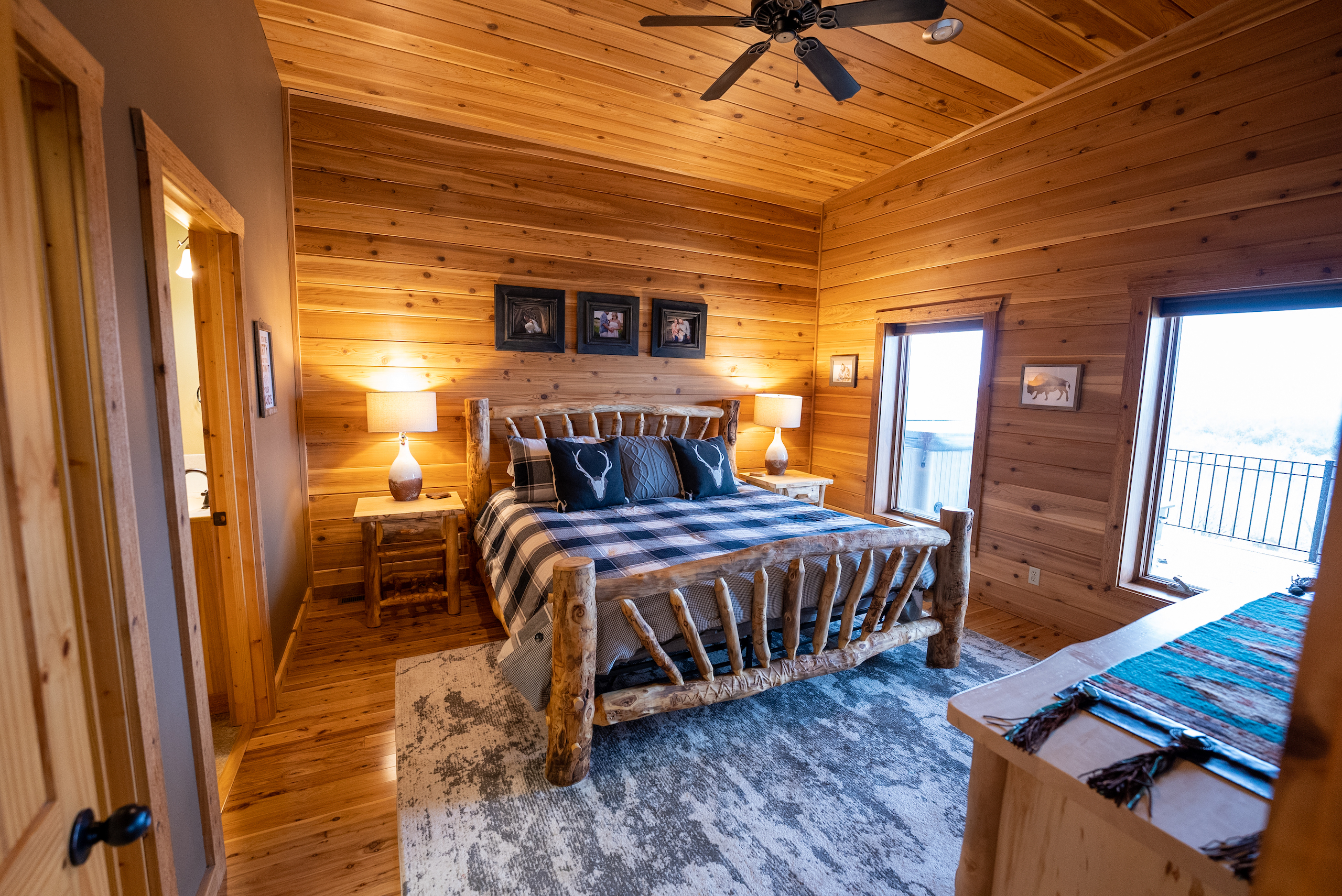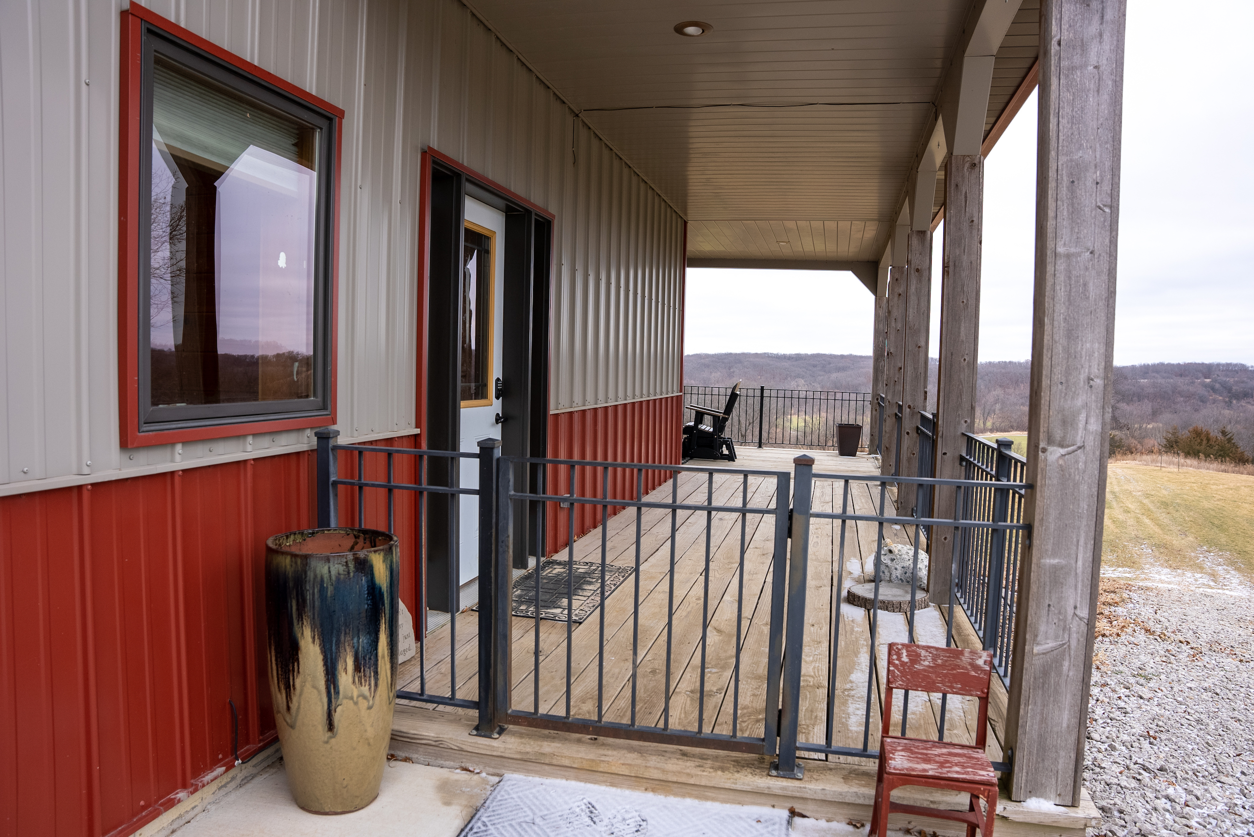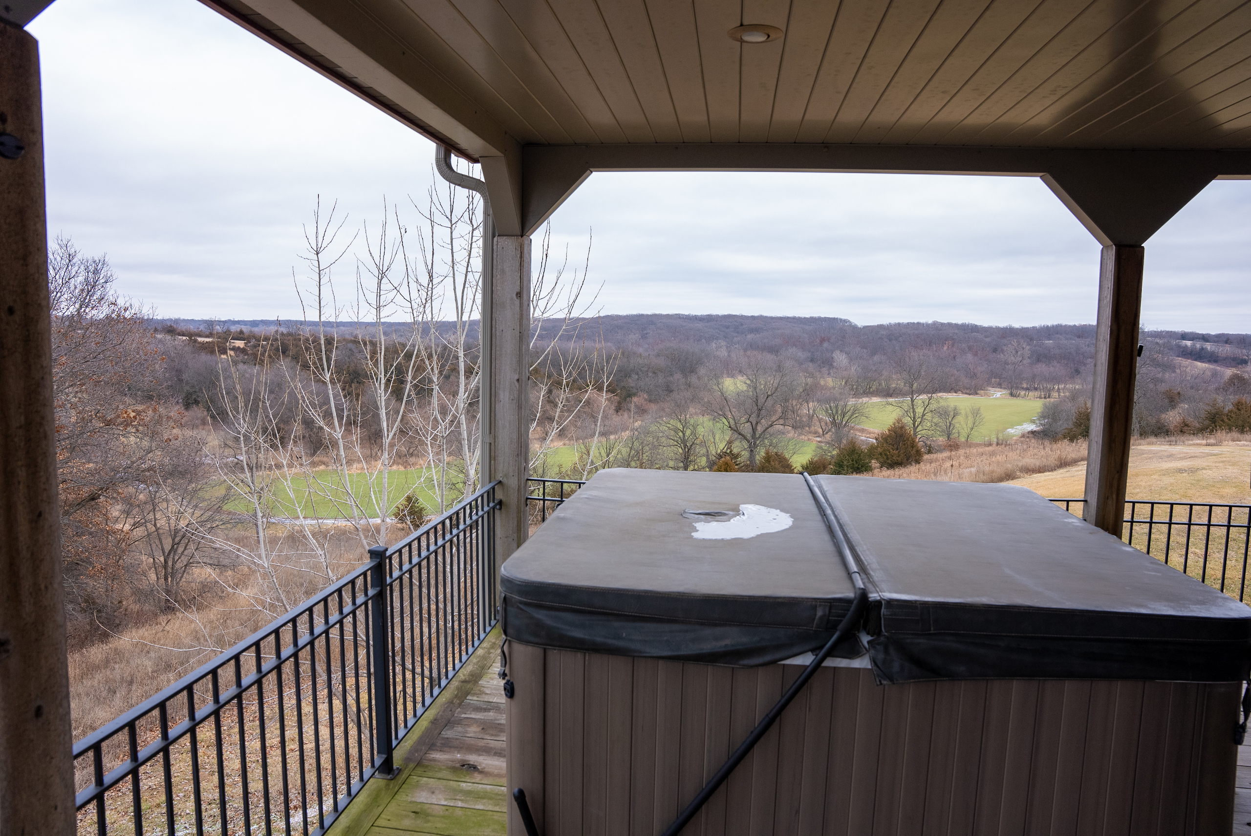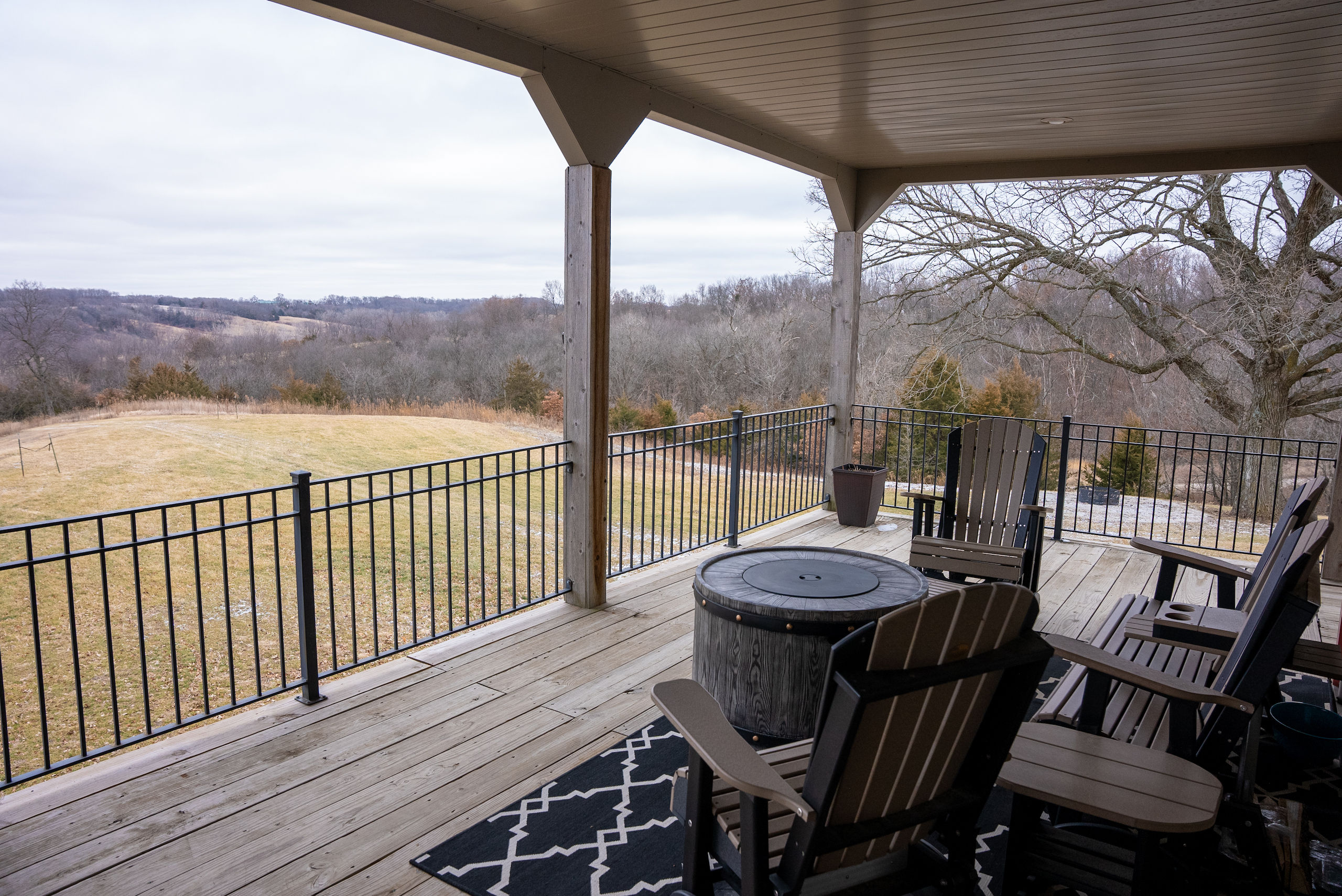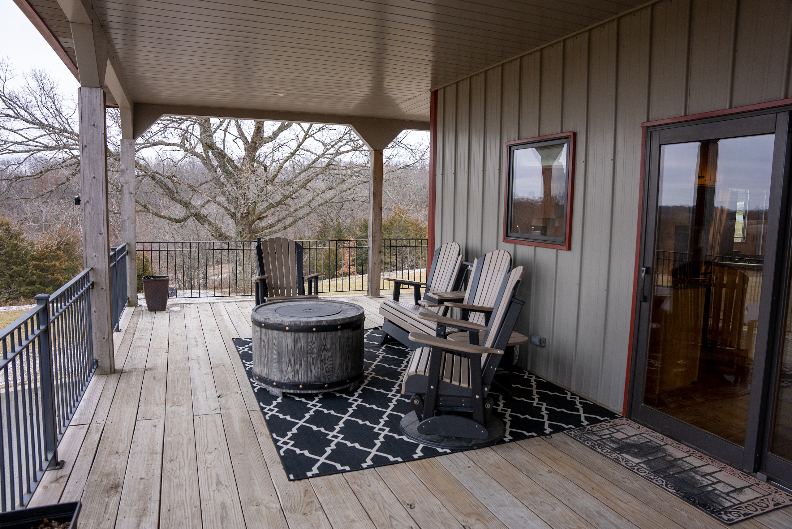 - Lodge and Barn Details. Super secluded lodge/home that is approx 4600 sq foot featuring 5 bedrooms, 4 bedrooms, 3 fireplaces, the lodge has two levels, upper level has expansive 12x90 wrap around deck with a million dollar view of the farm and features a nice large hot tub and fireplace.
