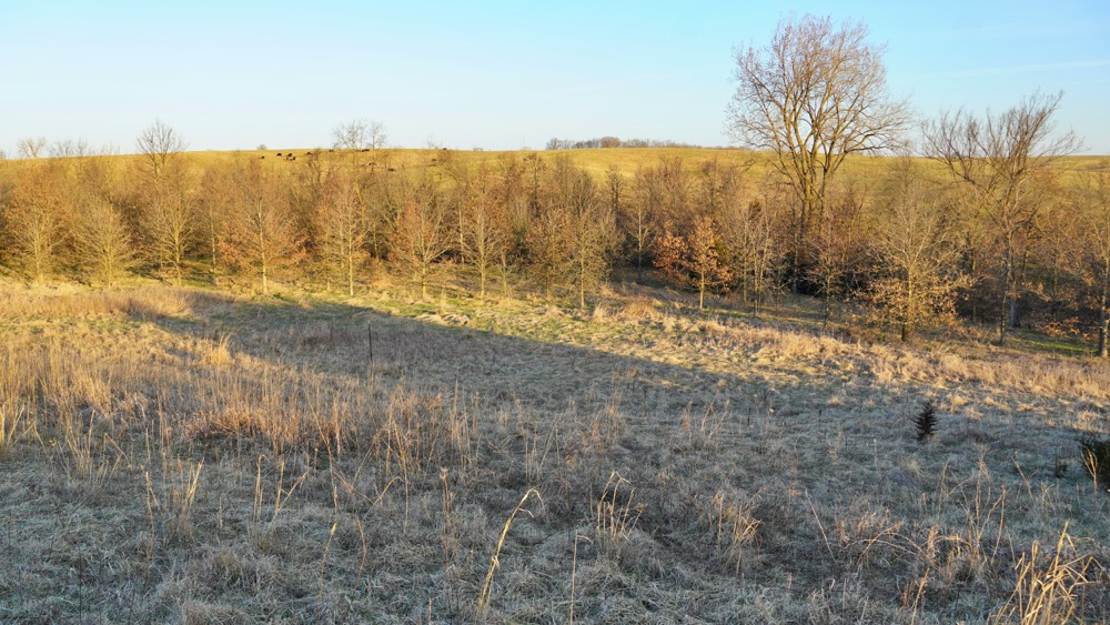 The property features scenic views overlooking rolling pasture hills, often dotted with grazing cattle, providing a true countryside feel and a beautiful potential build site.