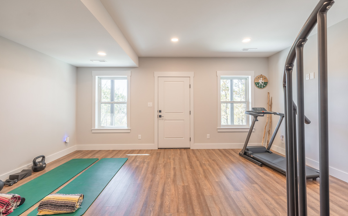 - Lower-level fitness area with treadmill, dumbbells, and yoga space