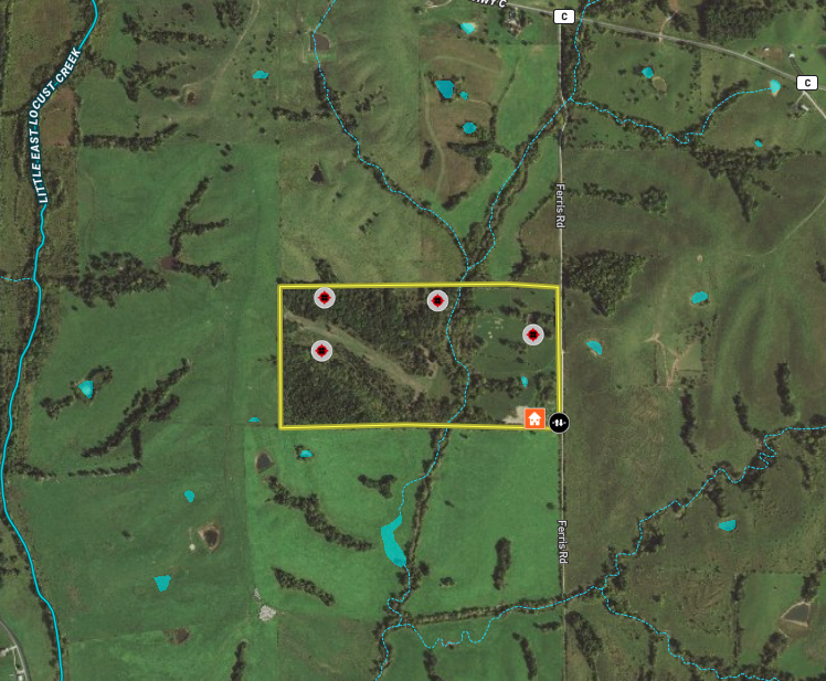 This secluded property is fenced and gated and sits at the end of a county-maintained gravel road with a beautiful 40’X60’ combination home and shop building with rustic living quarters. 60% of this property is wooded with valleys and draws, while the remaining 40% is open fields with 8 acres of strategically placed food plots. Along with a great mix of green and grain food plots and the bedding cover, there are also three mature Pear trees and 10 Hybrid “Snow Pear” trees that have been fenced for the past 4-years. There are approximately 28 acres on the east side of Little East Locust Creek, and 52 acres on the west side of the creek accessible via an established UTV/tractor crossing rocked for a solid base. There are 15 acres of thick cedar and timber in the SW corner of the property that has been maintained and treated as a sanctuary for the past five years. Strategically placed roads, creek crossings and pathways, four Redneck “Buck Palace” box blinds, and four 20’ “Duke” by X-Stand - heavy-duty ladder stands have been strategically placed to make this one of the most prime hunting properties in the area. We’ve spoken about the land. Now let’s talk about the 40 X 60 shouse located perfectly on the property to enhance the entire experience.