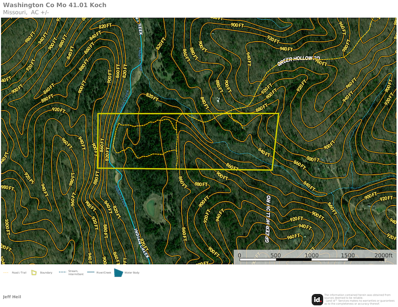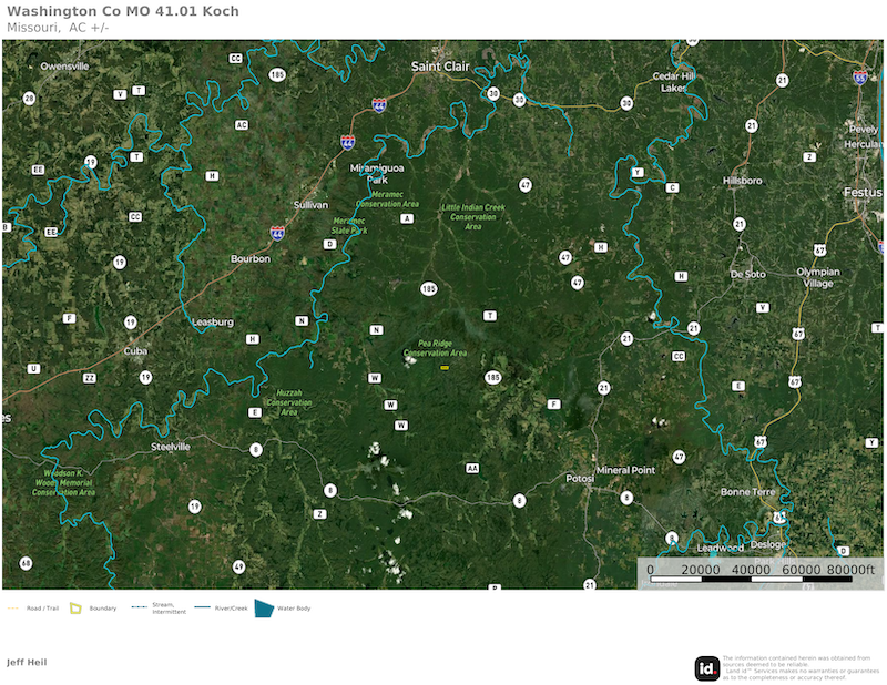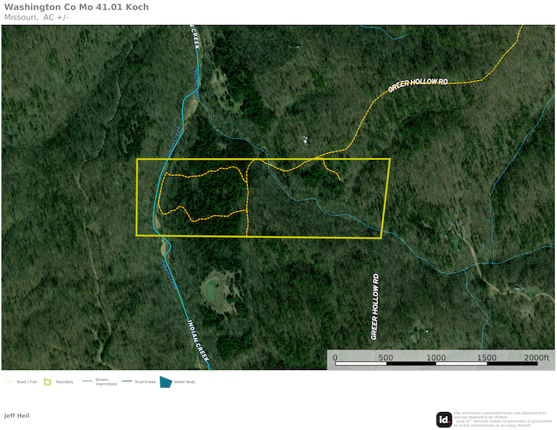 This surveyed 41.01 +/- acres lies behind a locked gate with access via easement. Two creeks are located on the property, one of them being Indian Creek. These year-round water sources can be used for recreation and further provide live water to the local wildlife. The timber is a mix of oaks, cedar, and some large shortleaf pine. There are multiple areas that have recently been cleared that can serve as food plots. Two of the cleared areas are situated along Indian Creek. The trail system leads to the creek and each open area so you can hunt different wind directions. The combination of woods, water, and seclusion creates a perfect habitat for deer, turkey, and other wildlife, making it a haven for hunting enthusiasts or nature observers. While offering a sense of complete isolation, this property is still conveniently accessible off of Highway 185 making it an easy trek to Sullivan or Potosi. With nearly unlimited public land in the neighborhood, the opportunities here are endless.