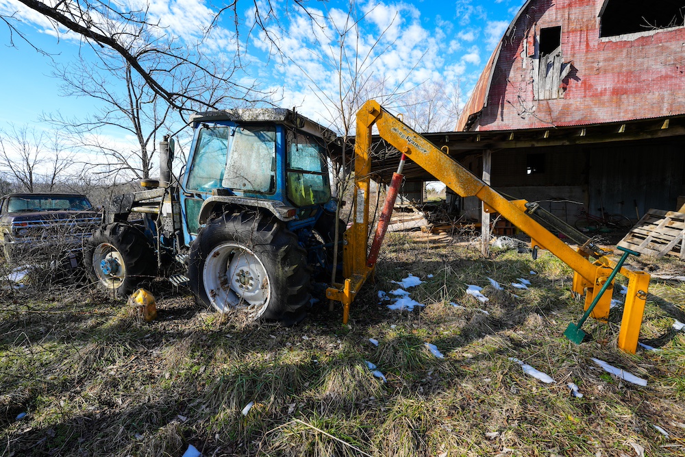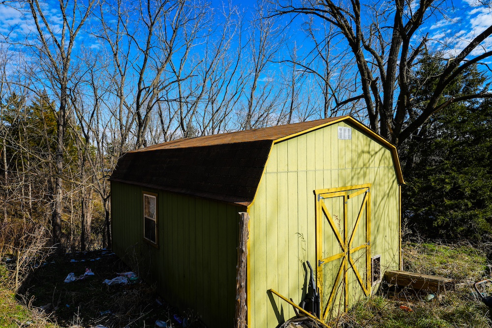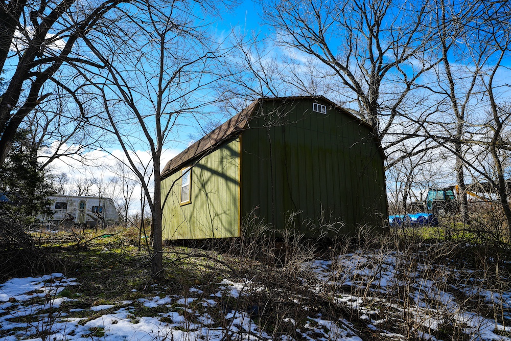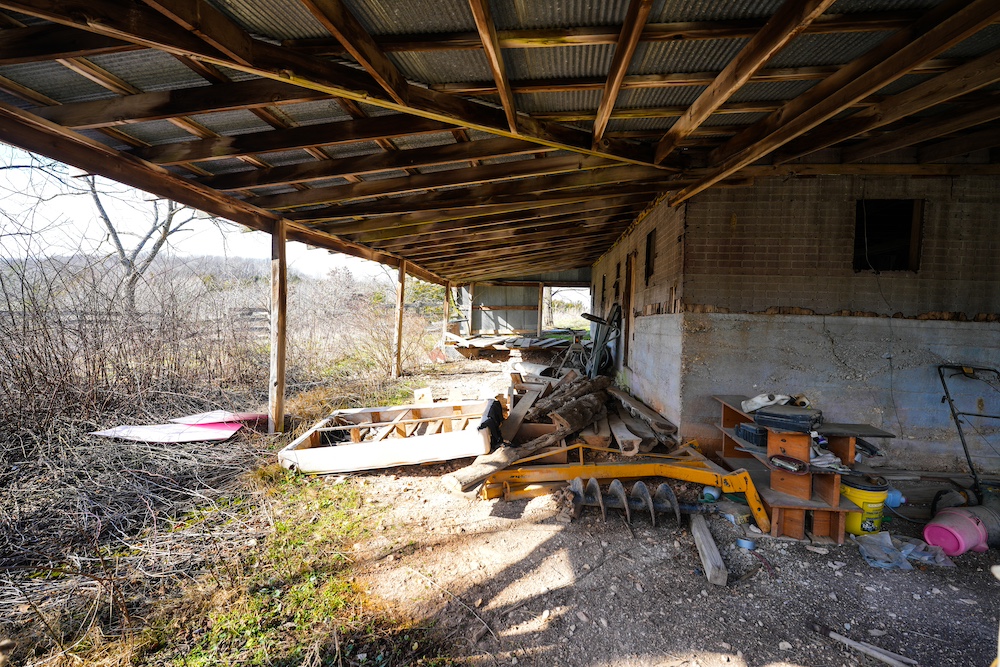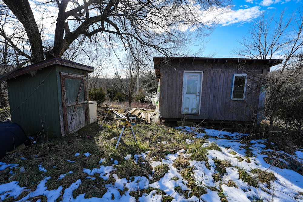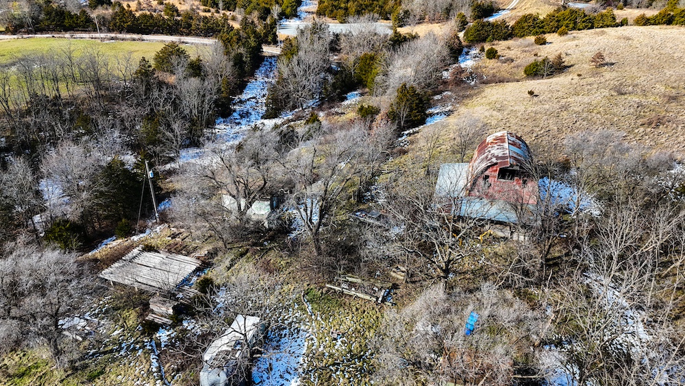 - Multiple sheds/cabins and large old barn.