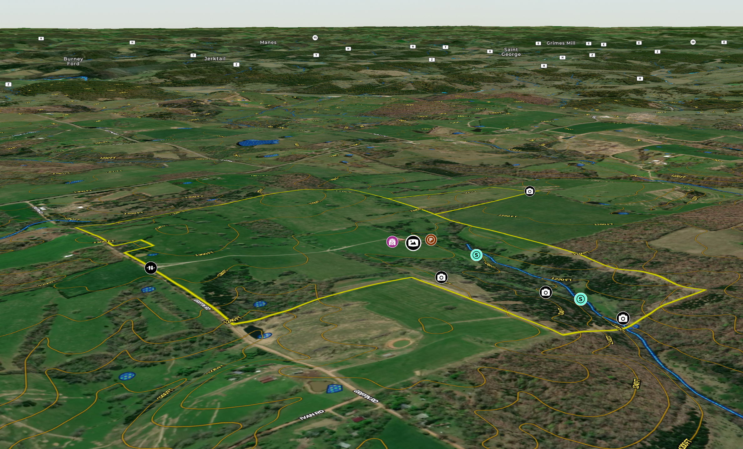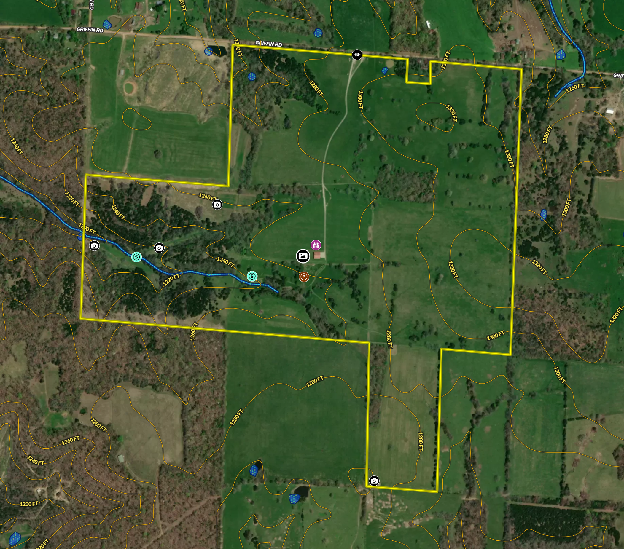 Food plot, Trail network, Internal Road Network, Gated entrance, Water control Structures, Livestock facilities, Equine facilities