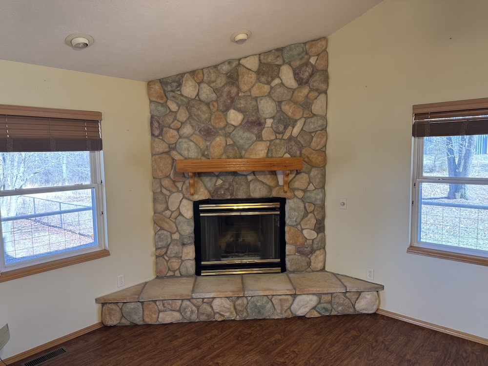 - Wood burning stone fireplace inside. Hardy outdoor wood burning furnace outside