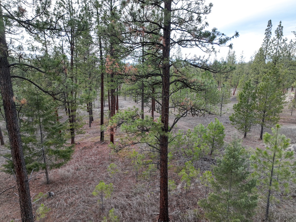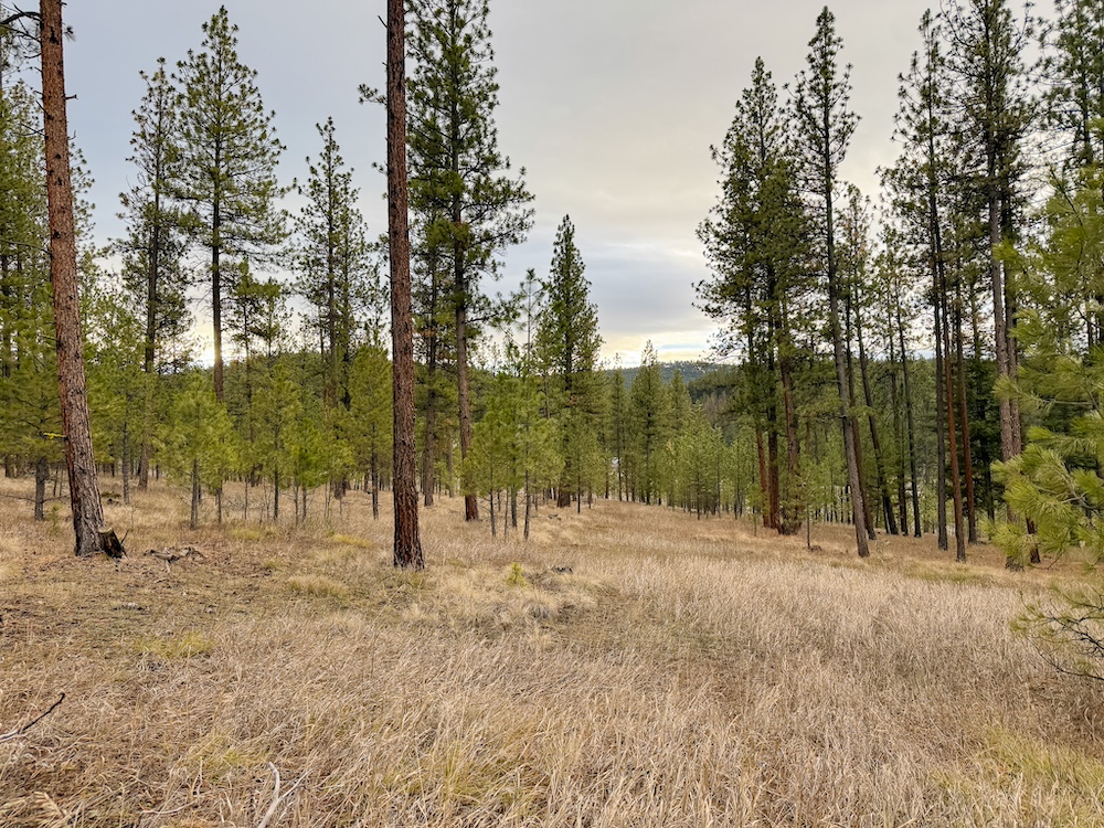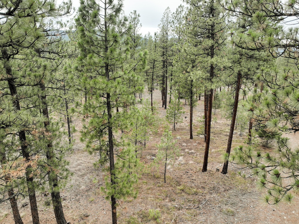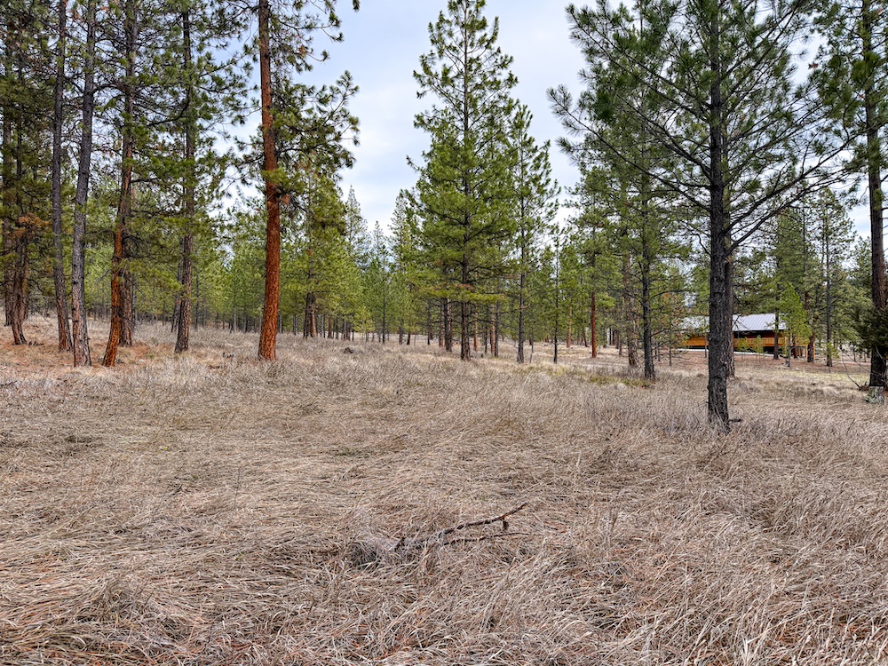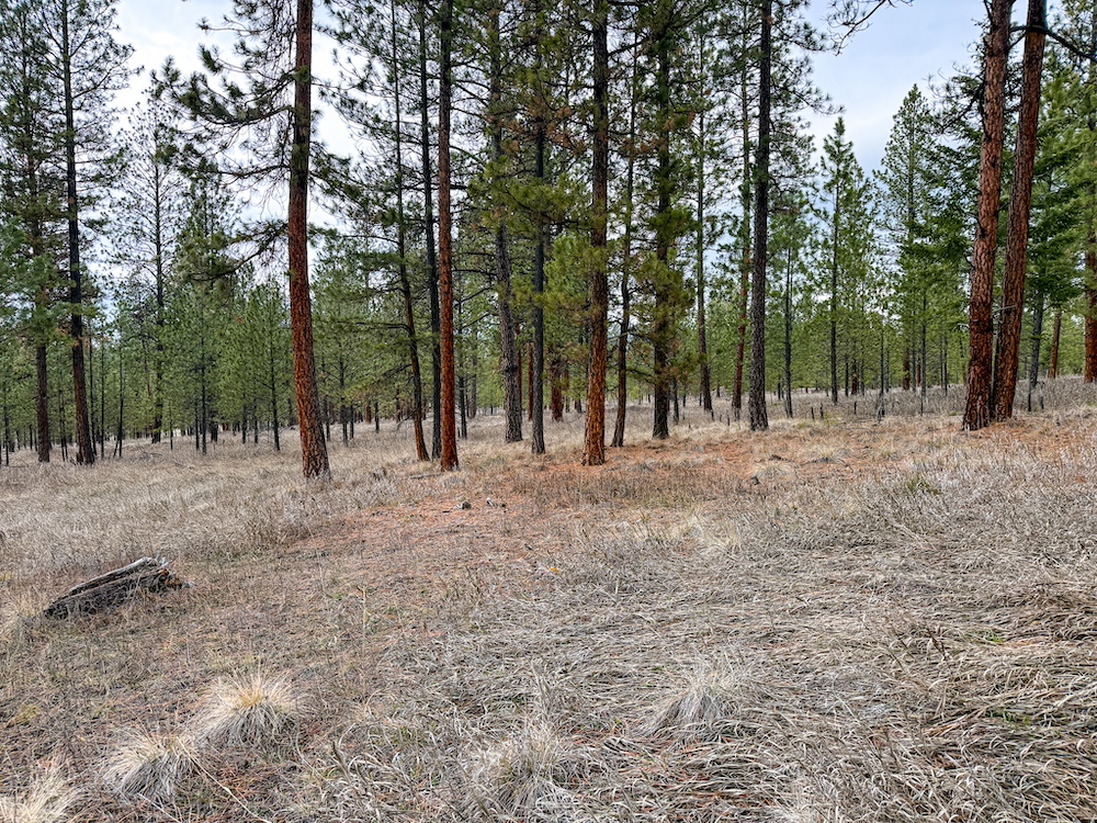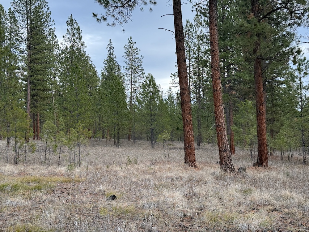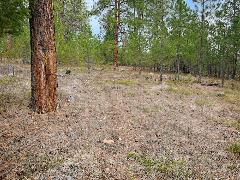 The land features an open stand of mature ponderosa pine, with scattered Douglas fir throughout. The spacing of the trees creates an open forest setting with good natural light and ease of movement, while maintaining a wooded character. The balance of usable ground and established timber supports a range of residential site layouts without extensive clearing.