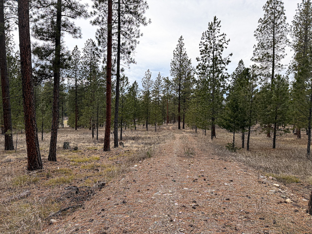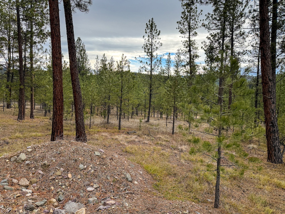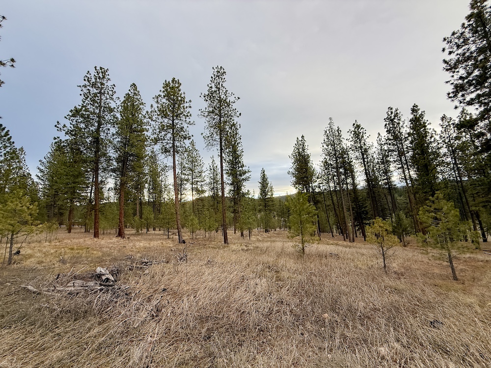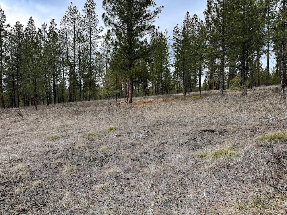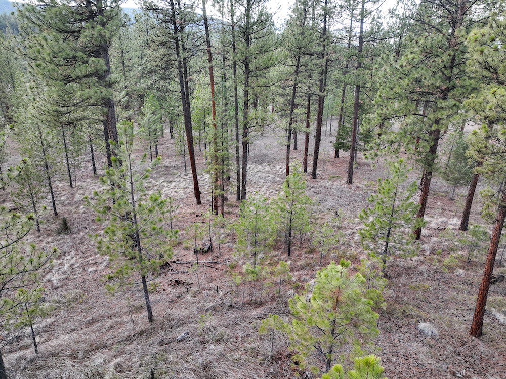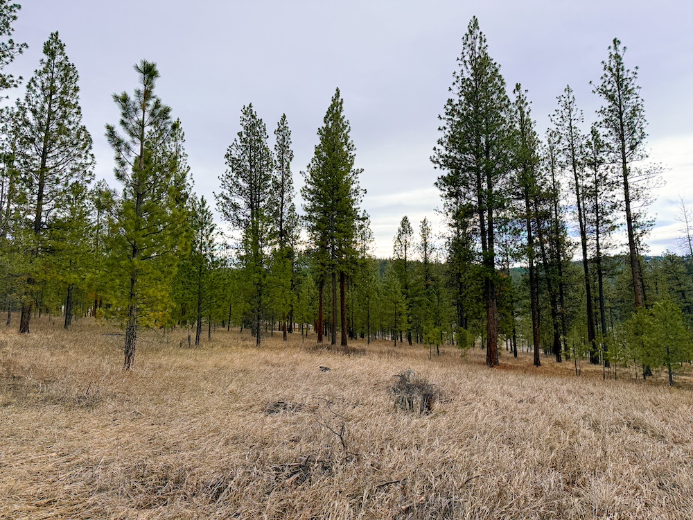 The land features an open stand of mature ponderosa pine, with scattered Douglas fir throughout. The spacing of the trees creates an open forest setting with good natural light and ease of movement, while maintaining a wooded character. The balance of usable ground and established timber supports a range of residential site layouts without extensive clearing.