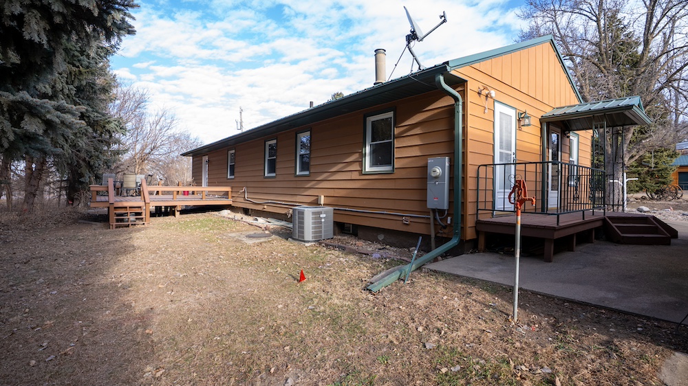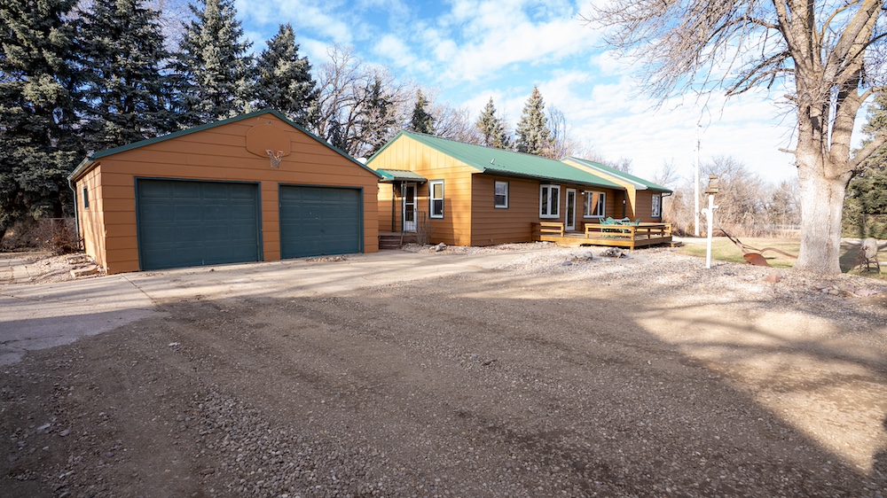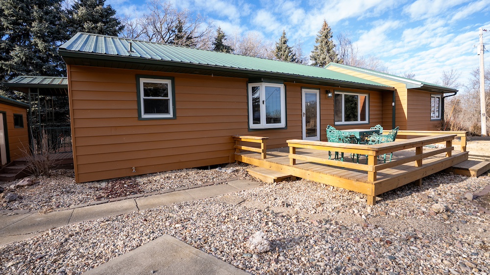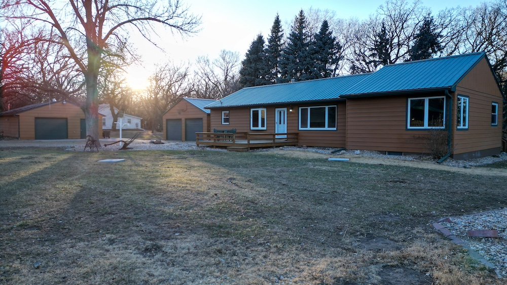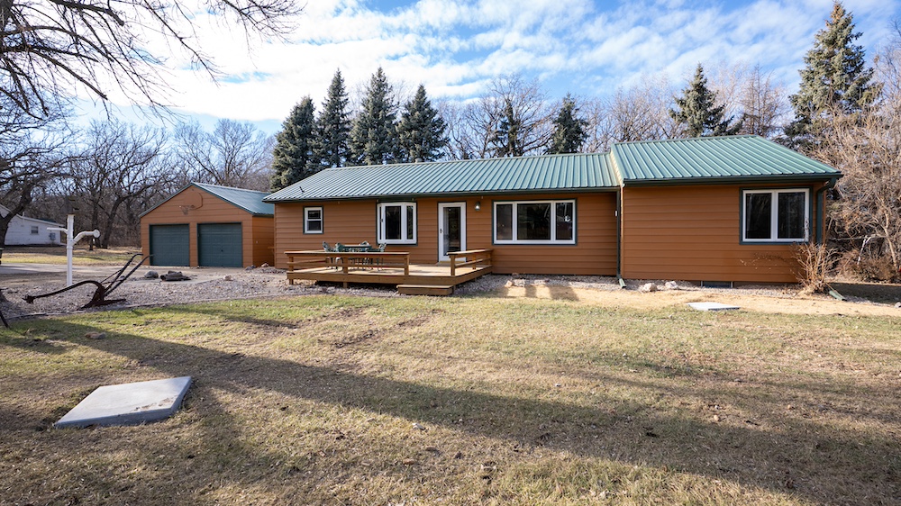 The home features four bedrooms and two bathrooms, providing ample space for family living or hosting guests. Front and rear decks extend the living space outdoors and offer places to enjoy the surrounding tree cover and quiet setting. The home is positioned back among mature trees, offering shade, wind protection, and a sense of seclusion while still allowing convenient access to nearby Yankton amenities and recreation areas.