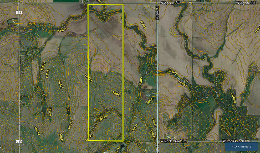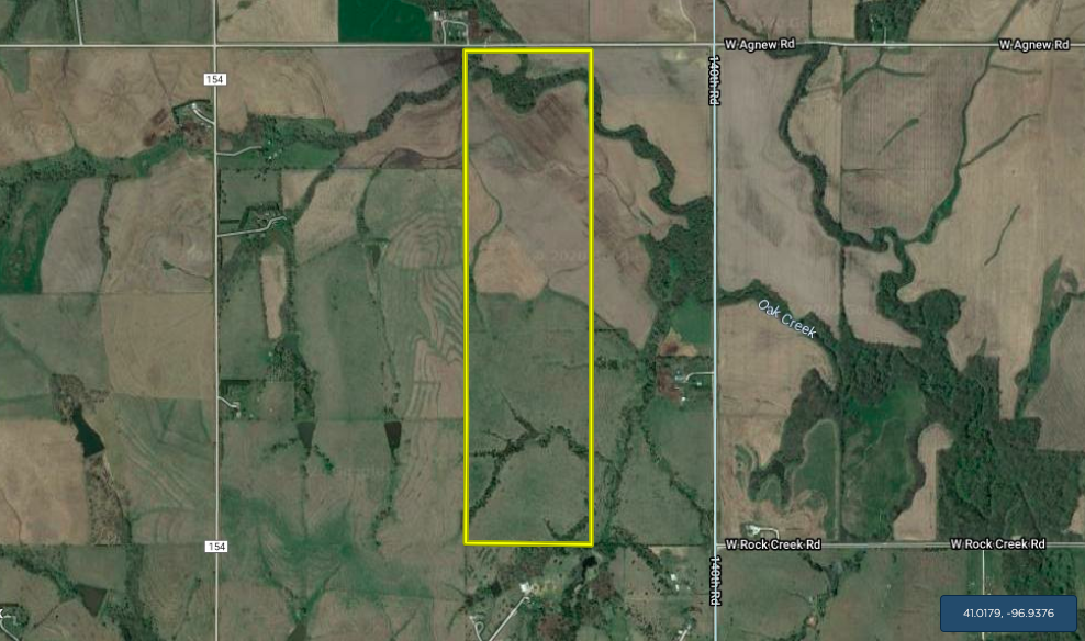 Here is a great opportunity at a combination farm that contains productive bottom ground tillable acres as well as scenic rolling pasture. Oak Creek gently winds through the northern portion of the property with the mature timber along the bank giving way to nearly flat tillable acres with primarily class II soils. The southern half of this property consists of gently rolling pasture with timbered draws. The combination of production acres, timber, and water sources make for a diverse property with some top-notch habitat. There are nearby grain markets, recreational opportunities at Branched Oak Lake and it’s only a short drive to downtown Lincoln. Call now for your private showing!