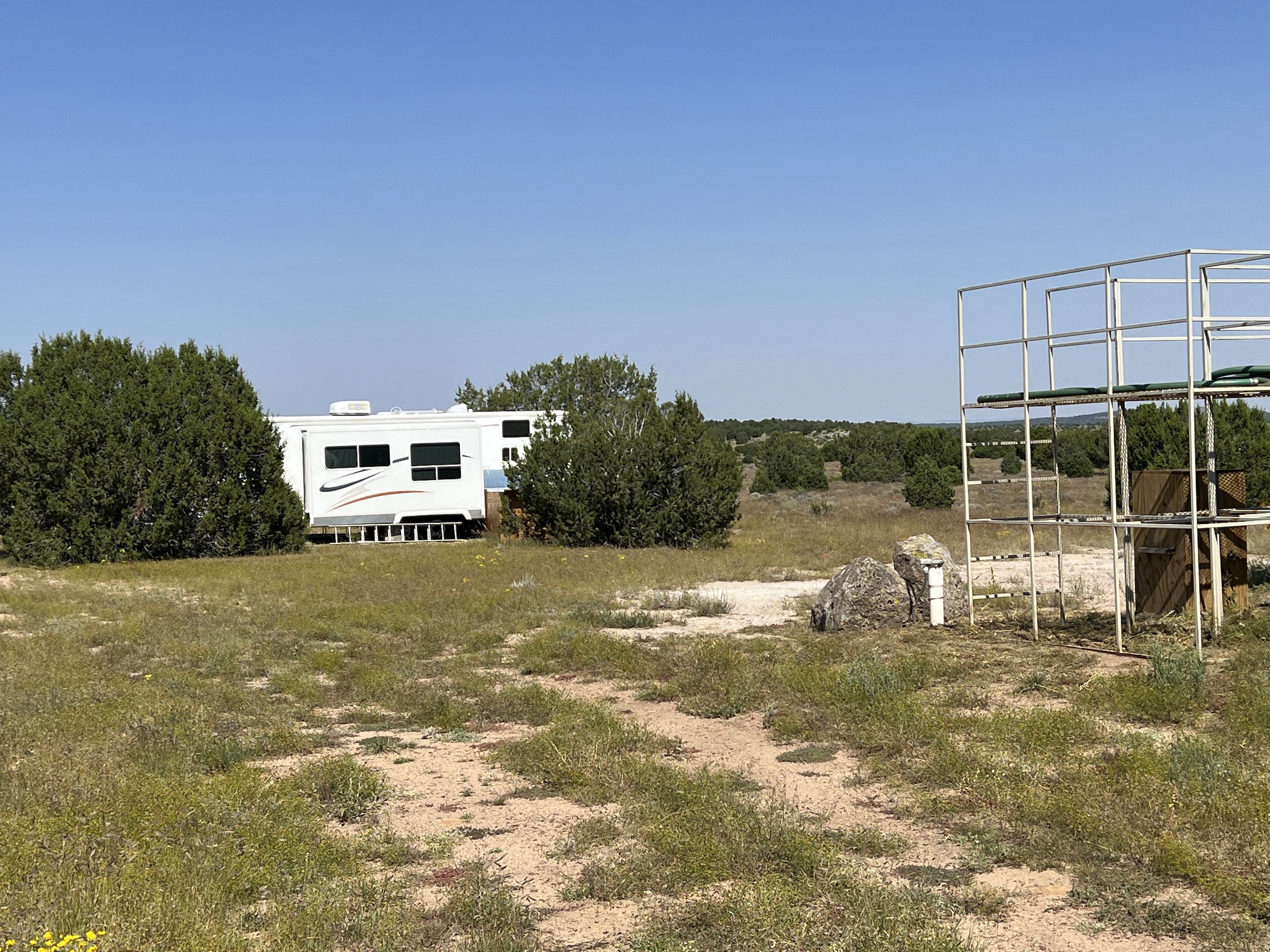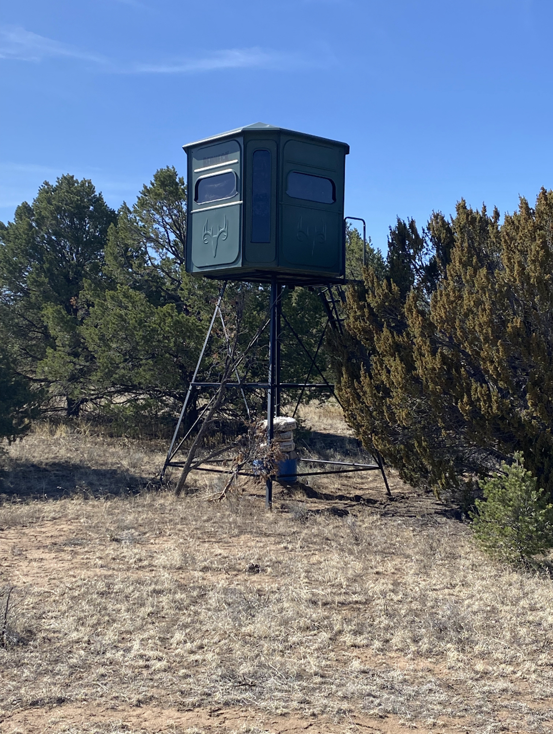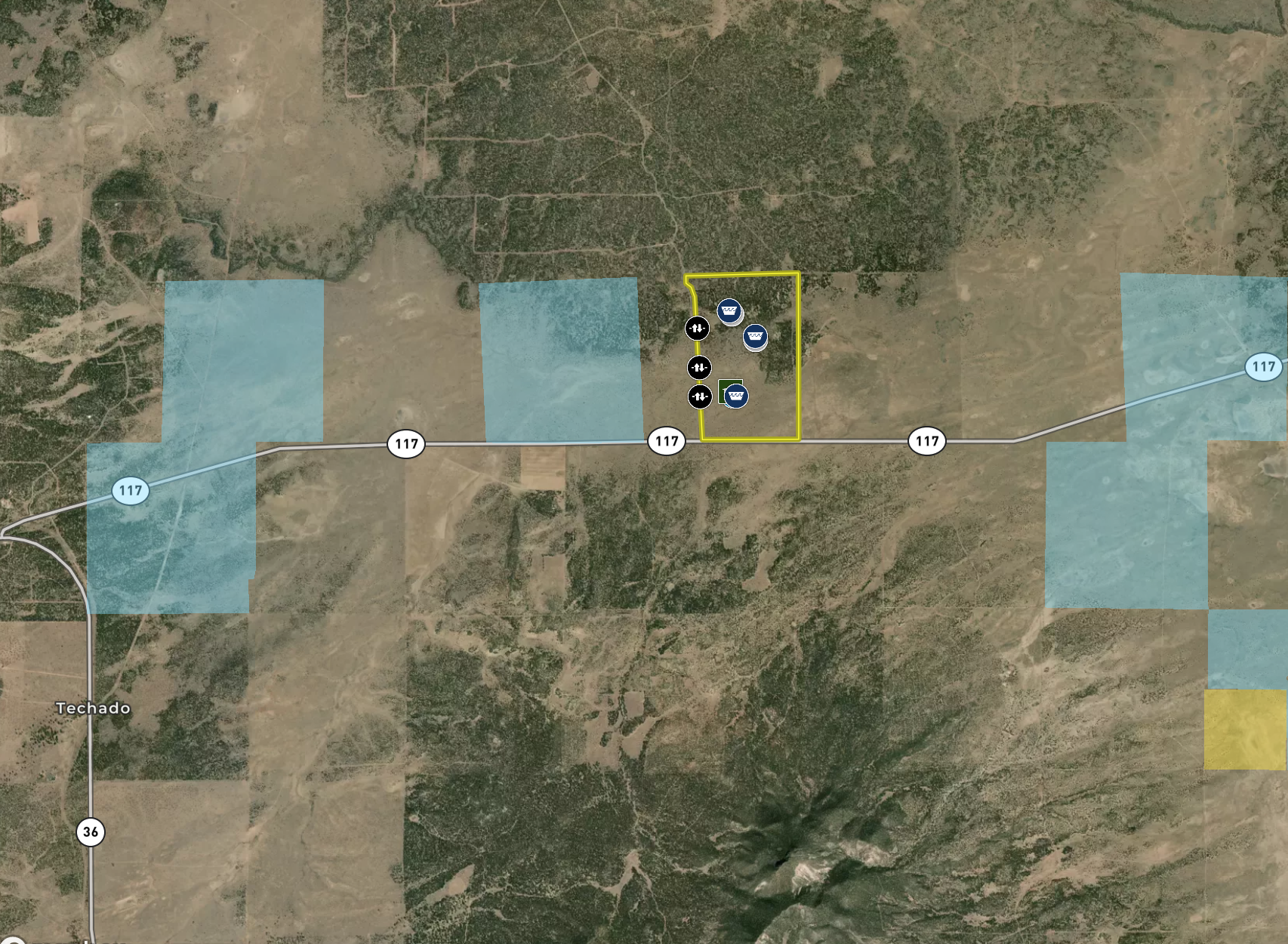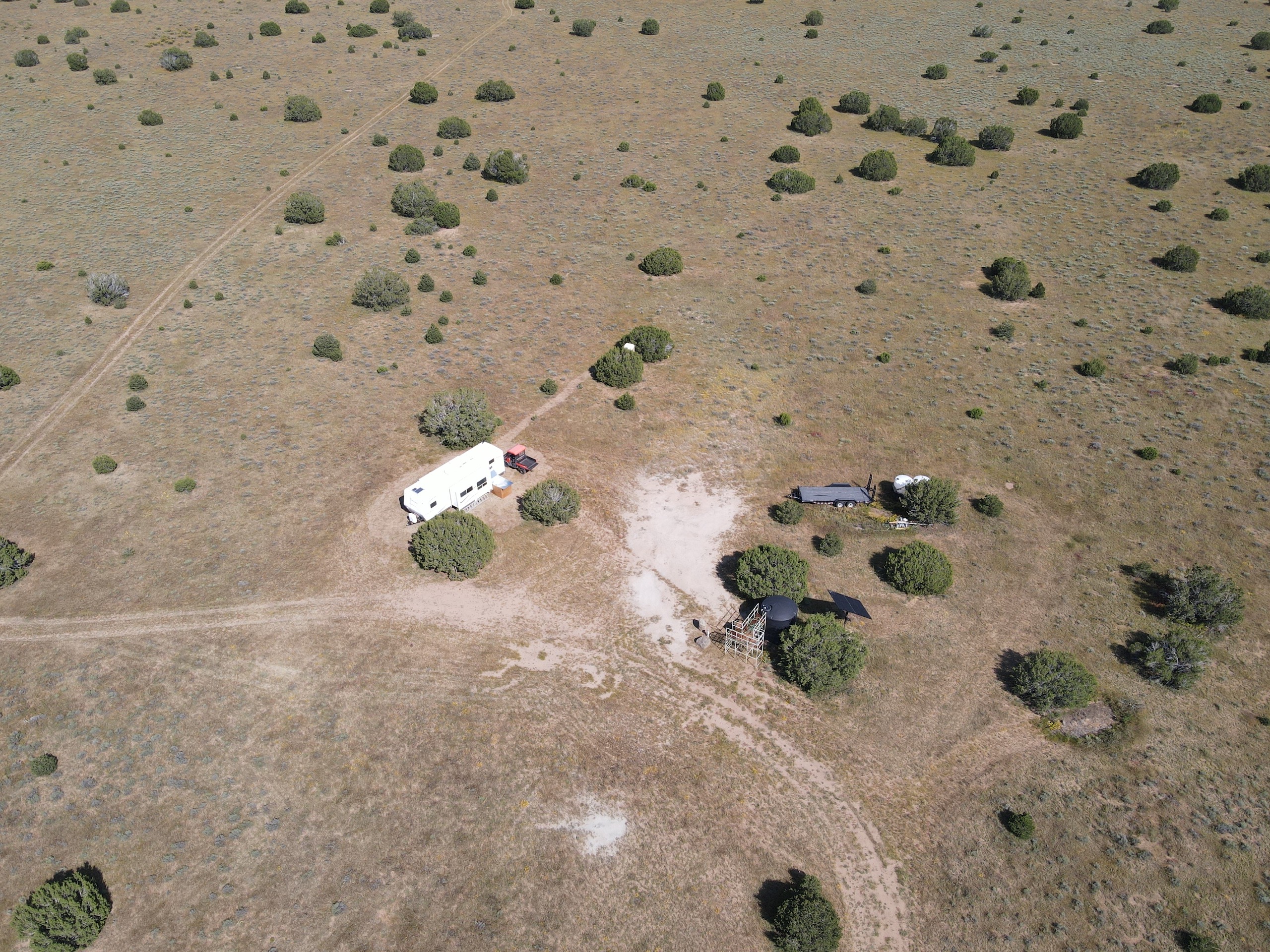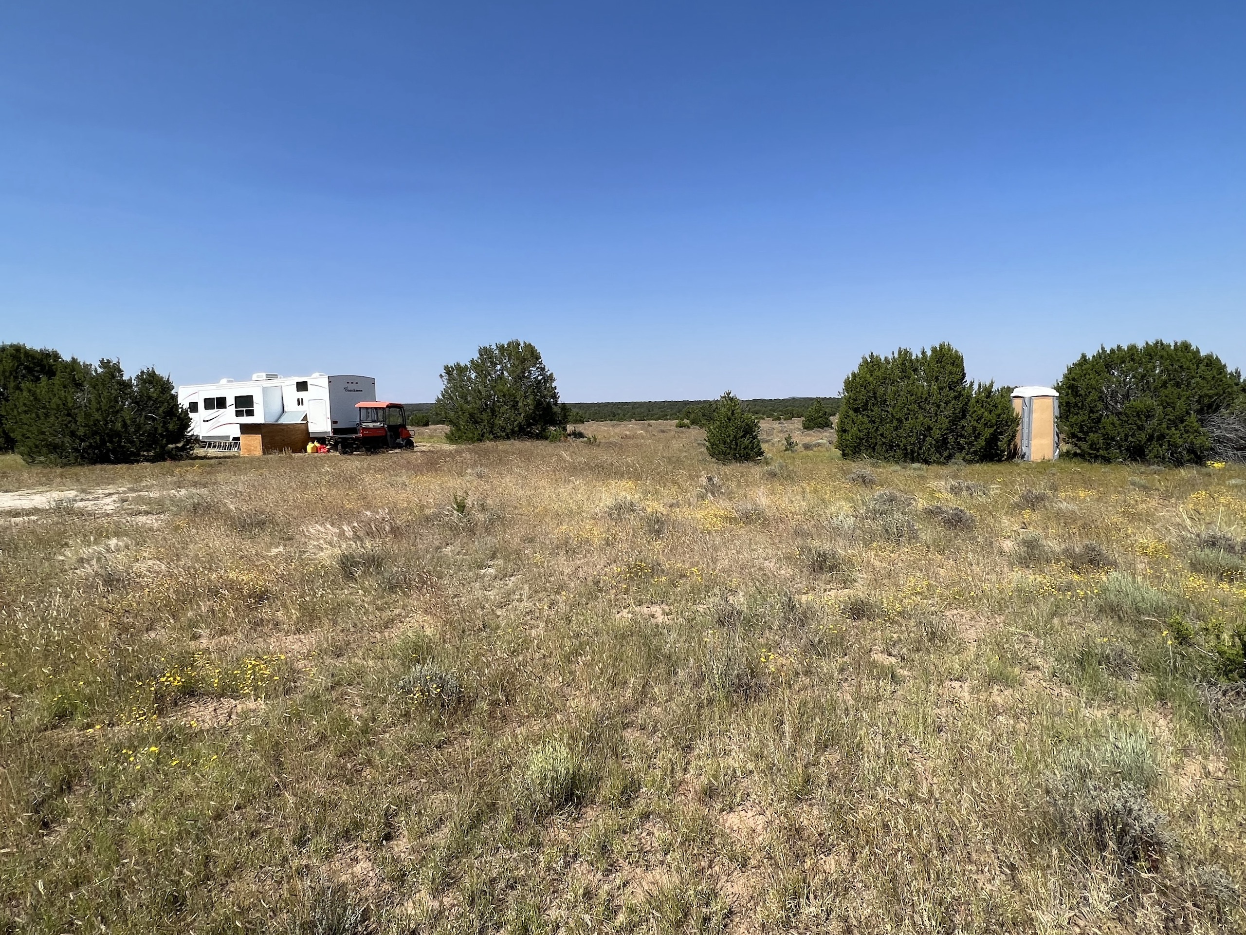 This property is located within Game Management Unit 12, which is known for its trophy elk hunting and is eligible to participate in New Mexico Game and Fish’s elk landowner system (EPLUS). Elk, mule deer, pronghorn and other wildlife utilize this property. Private land mule deer and pronghorn licenses are currently unlimited and sold over the counter, so a landowner can allow as many hunters as they choose to meet their management objectives. Trail camera photos have documented many elk to include several trophy-sized bull elk. The ranch provides good forage and water availability for maintaining elk, mule deer and pronghorn use on the property. The terrain consists of gentle topography with open meadows of native grasses, pinyon and juniper trees. Two newly built dirt tanks have had heavy elk usage and provide a key habitat component that has attracted more big game to the property. Two redneck blinds have been installed at each of the dirt tanks. Feeding troughs are placed in strategic locations on the property. A new 685-foot well, operated by solar or generator and has a 5,000-gallon storage tank. Water is piped to a travel trailer and is controlled by a hydrant, which is a big plus for a remote property. A water trailer with a holding capacity of 1000 gallons of water can be used to provide water to the numerous drinking troughs throughout the property. The perimeter of the property is fenced on three sides with new barbed-wire fencing and has three entrance gates. Road access is off Highway 117. This property offers the opportunity to own your own hunting property!