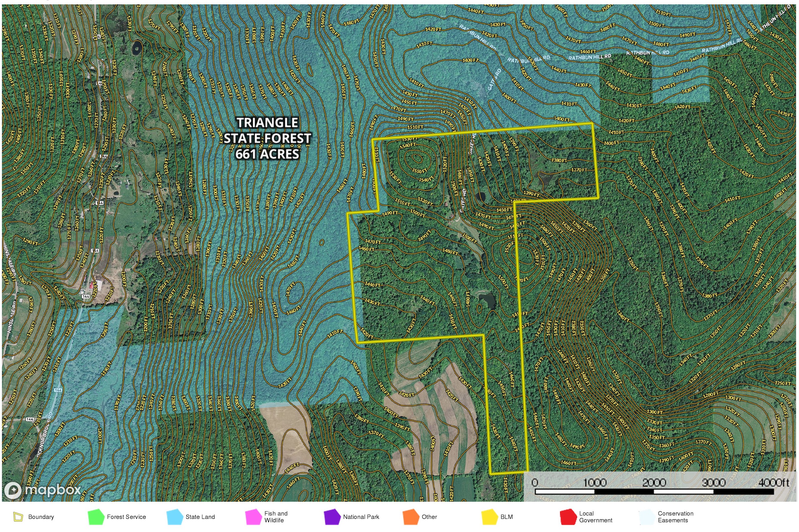 - Property has an excellent trail system throughout and is bordered on two sides by Triangle State Forest with 661 additional acres to explore and use for hunting, camping, hiking and snowmobiling.