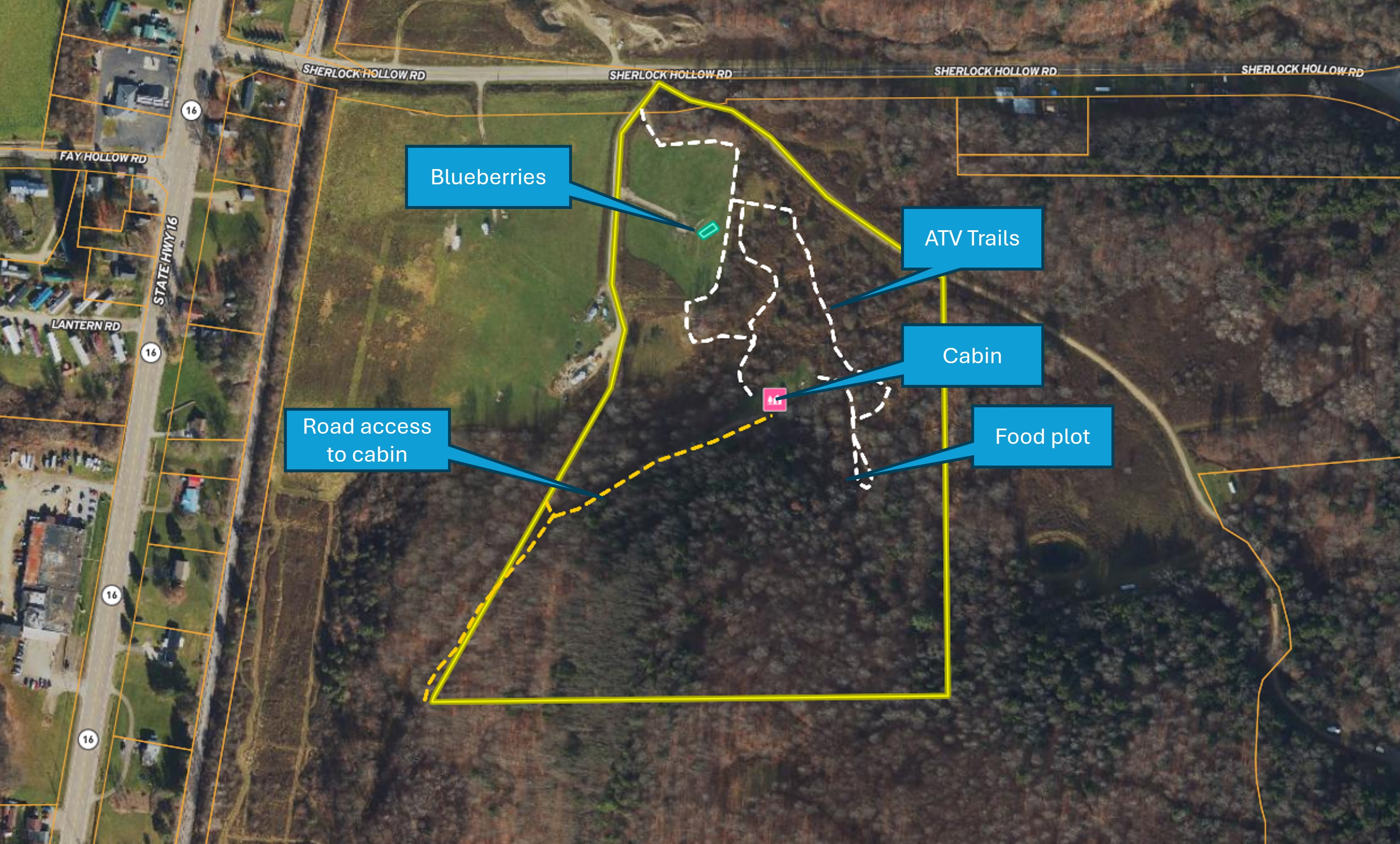 - Electric at the road, Shared driveway, Cabin, 1045' to Route 16