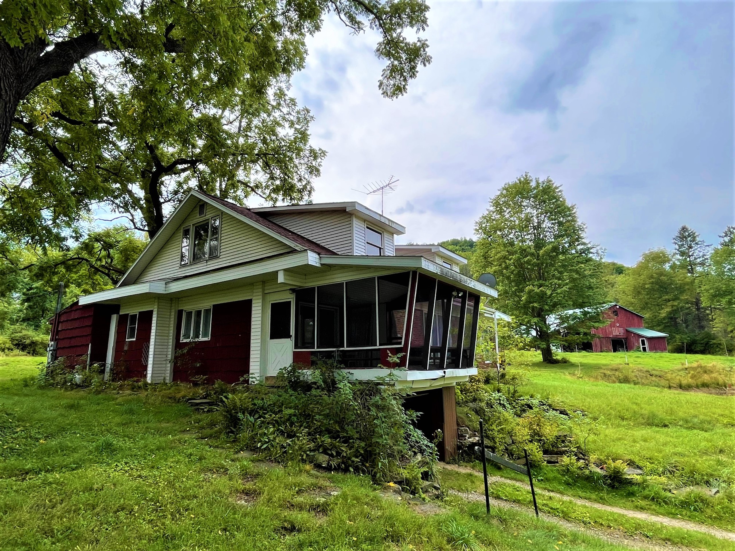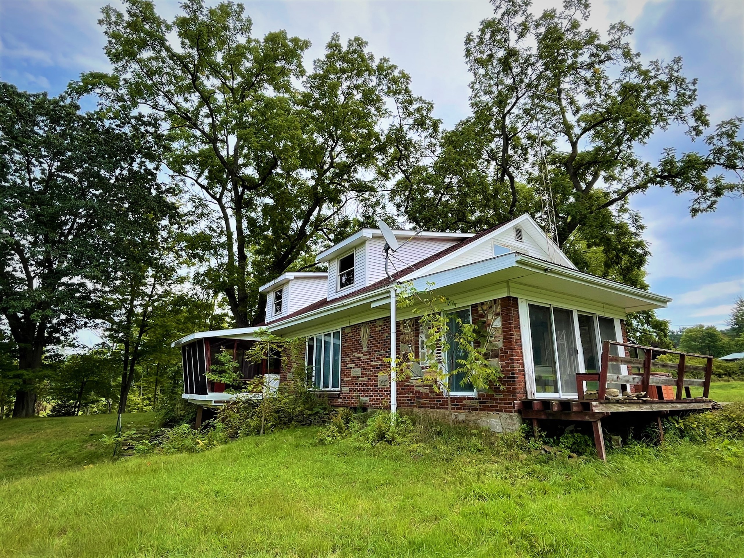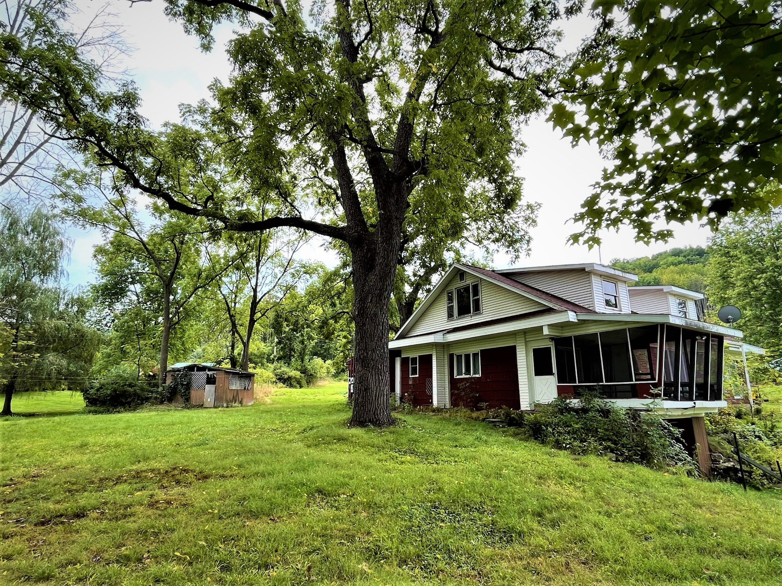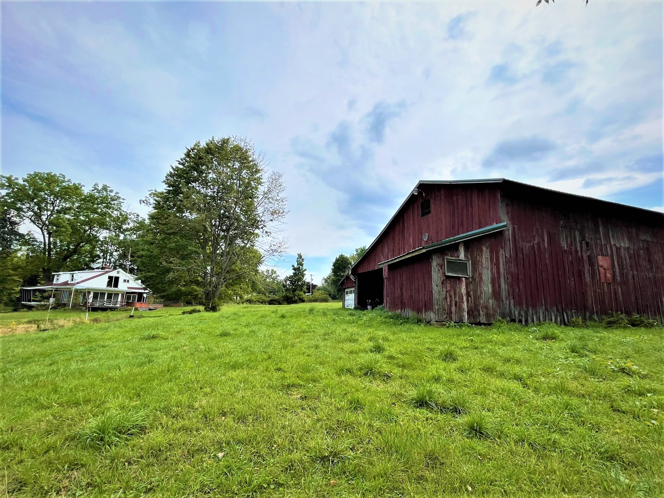 Looking for a small farmette close to town? This charming parcel is literally minutes from the center of town (Olean, NY) right on the Allegany River. Only 1.23 miles from downtown and 3.7 miles from St. Bonaventure University, this property could leave you thinking you are away or in the country, but you have all of the conveniences to city services. Nested up on a small hill, the home overlooks the Allegany River right out the driveway and has plenty of privacy and space for a small hobby farm for light animals or a couple of horses. The barn has six stalls, power and a water source, with approximately 1.9 acres of open space for a small pasture. A pond sits between the house and barn and has fruit trees planted on its bank. A small utility shed is also on the property, easily converted to a chicken coop or used for wood storage for the wood stoves inside the home. The house is a 1940 charmer that needs a little TLC and some updates, but the rooms are large and enjoy views over the property from each room. A nice feature of the home is a fully screened porch connected to the kitchen overlooking the river and property where breezy breakfasts and sunset suppers can be enjoyed outside, while a greenhouse/Florida room is featured in the back of the house to bump start a garden or enjoy sun and warmth in the winter months. A very large family room has large floor-to-ceiling windows gazing west looking over the pond and barn, where a cozy wood stove heats the front of the house. An extension of this room is an extra space where a pool table is found, with two sliding screen doors that leads to a back deck and hot tub with privacy. A living room and two bedrooms are on the rear side of the house, with a kitchen and dining room on the north side of the house. The second story is partially finished and could be converted and finished into two more bedrooms. The property comes with whole house contents, including a John deer riding lawnmower and three youth ATVs in the barn. (Excluding the large TV and speakers in the owner's bedroom) Priced well to sell, and offering country living on the doorstep of town, check this one out. Sold AS IS.