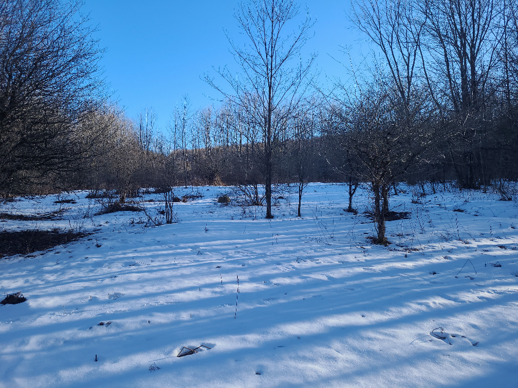 - Property slopes upward from the road, climbs hill into brush apple trees followed by good timber