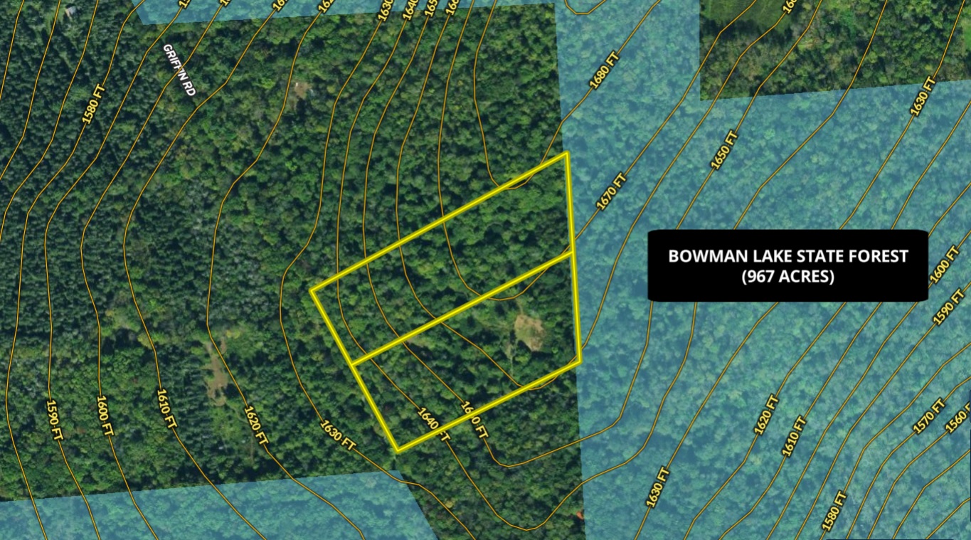 - Borders Bowman Lake State Forest (967 acres) front and back of property