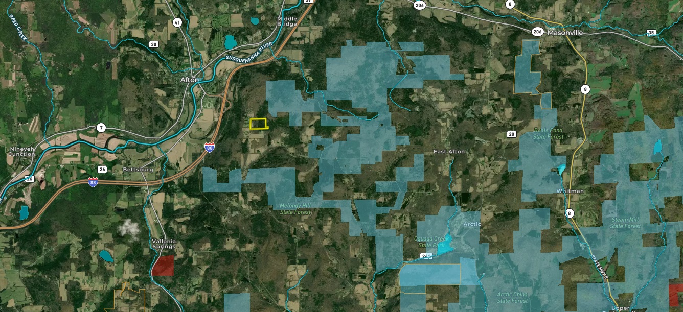Nice hunting or vacation spot that is affordable for the outdoors enthusiast. Located in the heart of central New York, in an area renowned for wildlife conservation and great hunting, this property is a mix of woods and an open field that appears to be former agricultural land. There is the potential to have a several acre building lot, nice sized camping area or return it to tillable land for your crop needs and/or small farm. The ridge provides great deer and turkey habitat and Whitetail appear to actively run the ridgeline along various locations, as evidenced by deer rubs and trails. There is a NYS maintained snowmobile trail. The adjoining farmland provides an attractive food source for whitetail and wild turkey. There is a NYS forest just minutes away the Melody Hill State Forest is comprised of 5,417 acres of contiguous state forest lands located in southeastern Chenango County and northeastern Broome County. The forest offers a multiple-use trail that runs from east to west in the northern part of the forest. Hiking, cross-county skiing, horseback riding, and snowmobiling can be undertaken on this trail. In addition, opportunities for fishing, hunting, nature observation and primitive camping abound. The northern and southern portions of the forest are easy to access via many town roads that pass through the area.