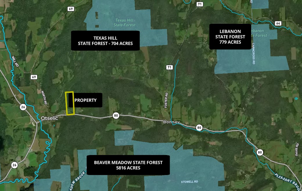 - Property is less than 1.3 miles away from the Beaver Meadow State Forest (5816 acres) and 2.25 miles from the Texas Hill State Forest (704 acres) and offers year round outdoor adventure with hunting, trapping, hiking, camping & snowmobiling.